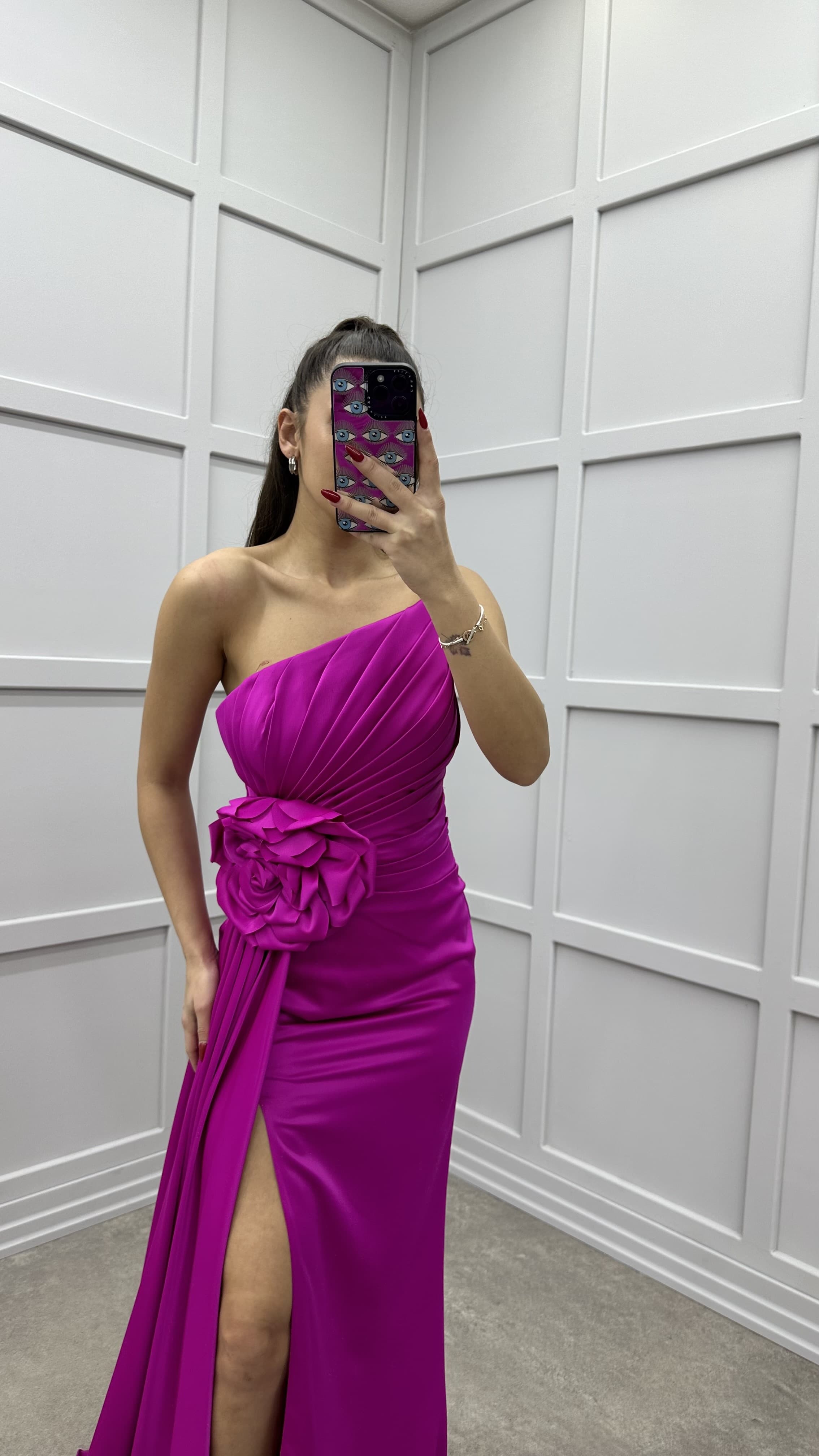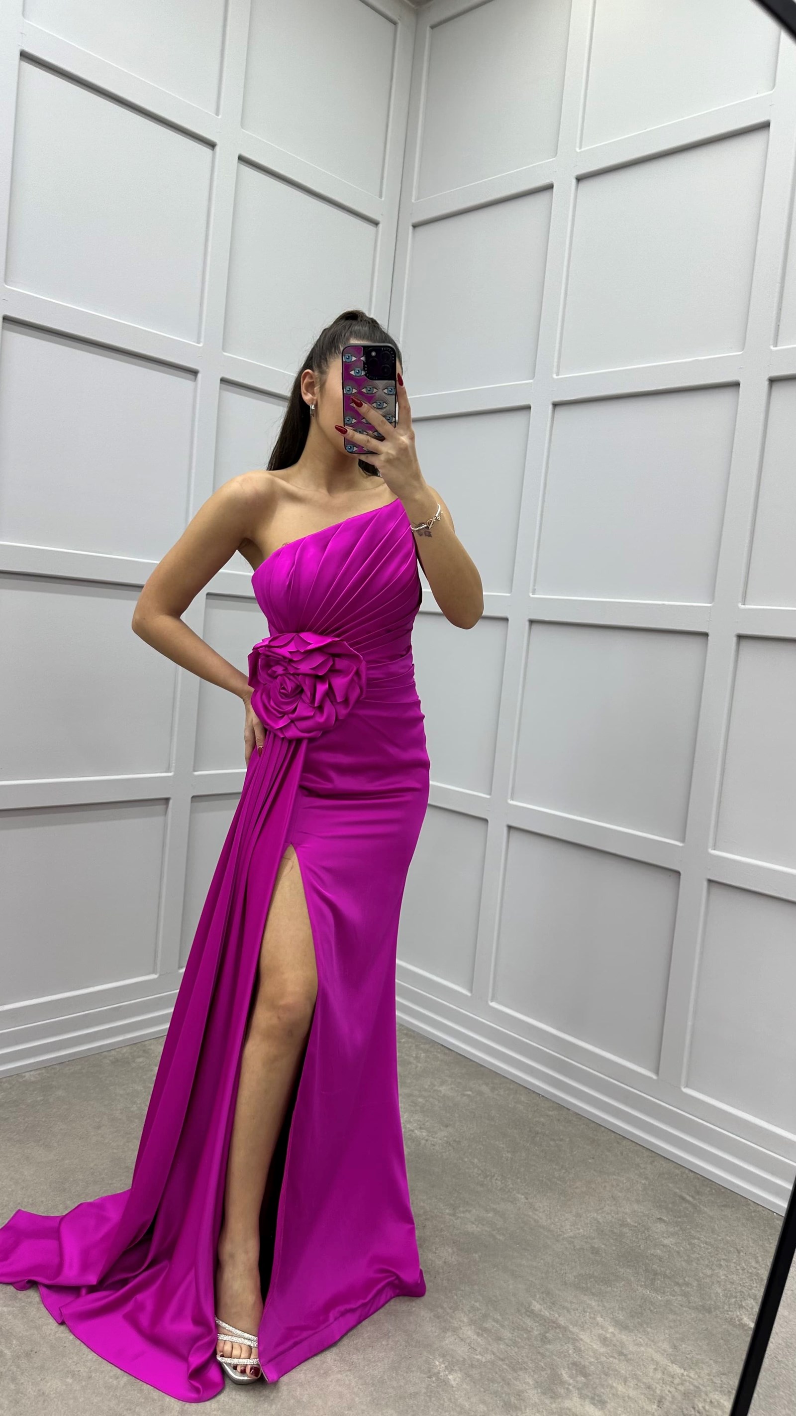 • Fuşya Straplez Gül Detay Tasarım Saten Abiye Elbise