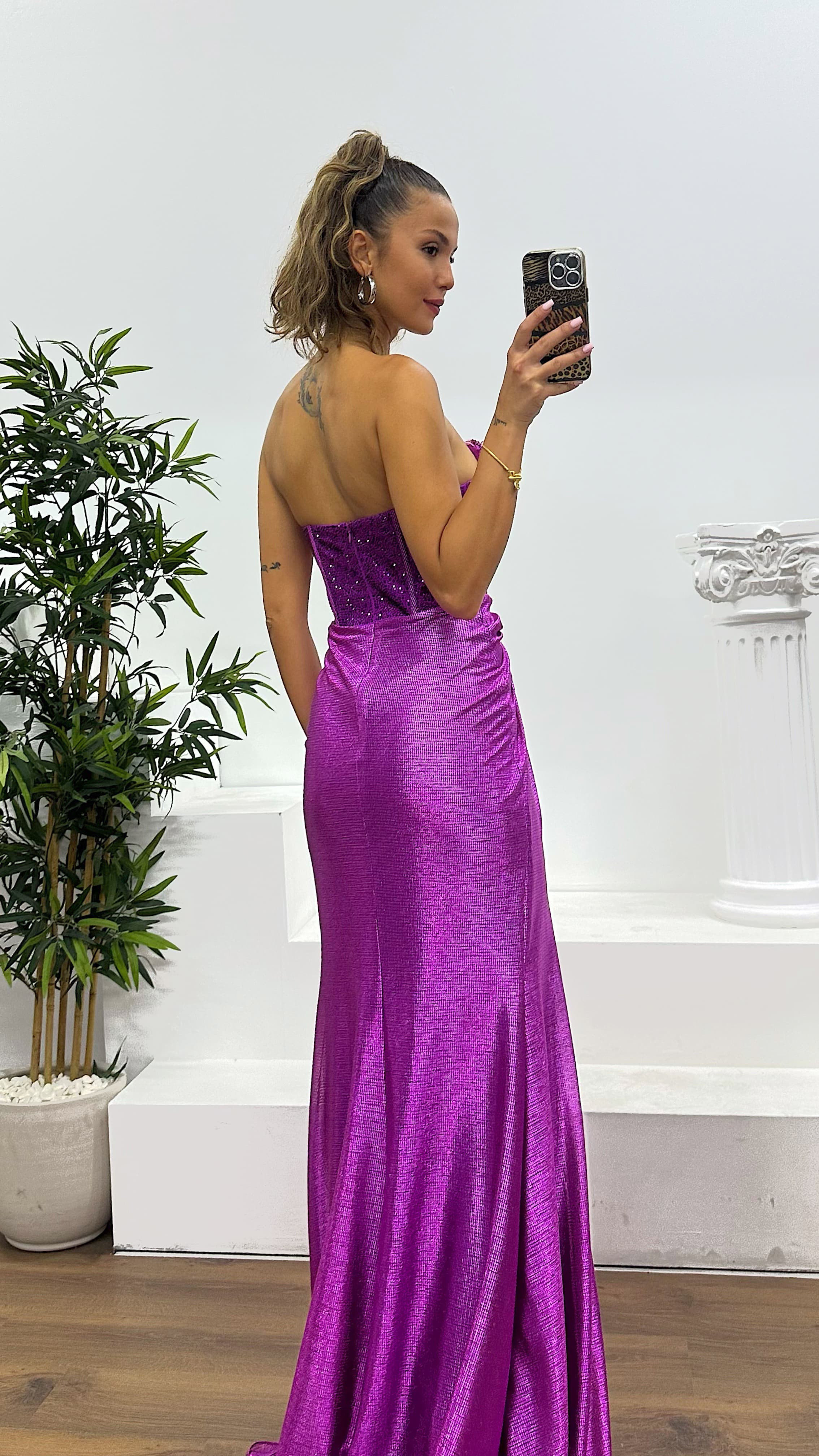 • Fuşya Straplez İşlemeli Abiye Elbise