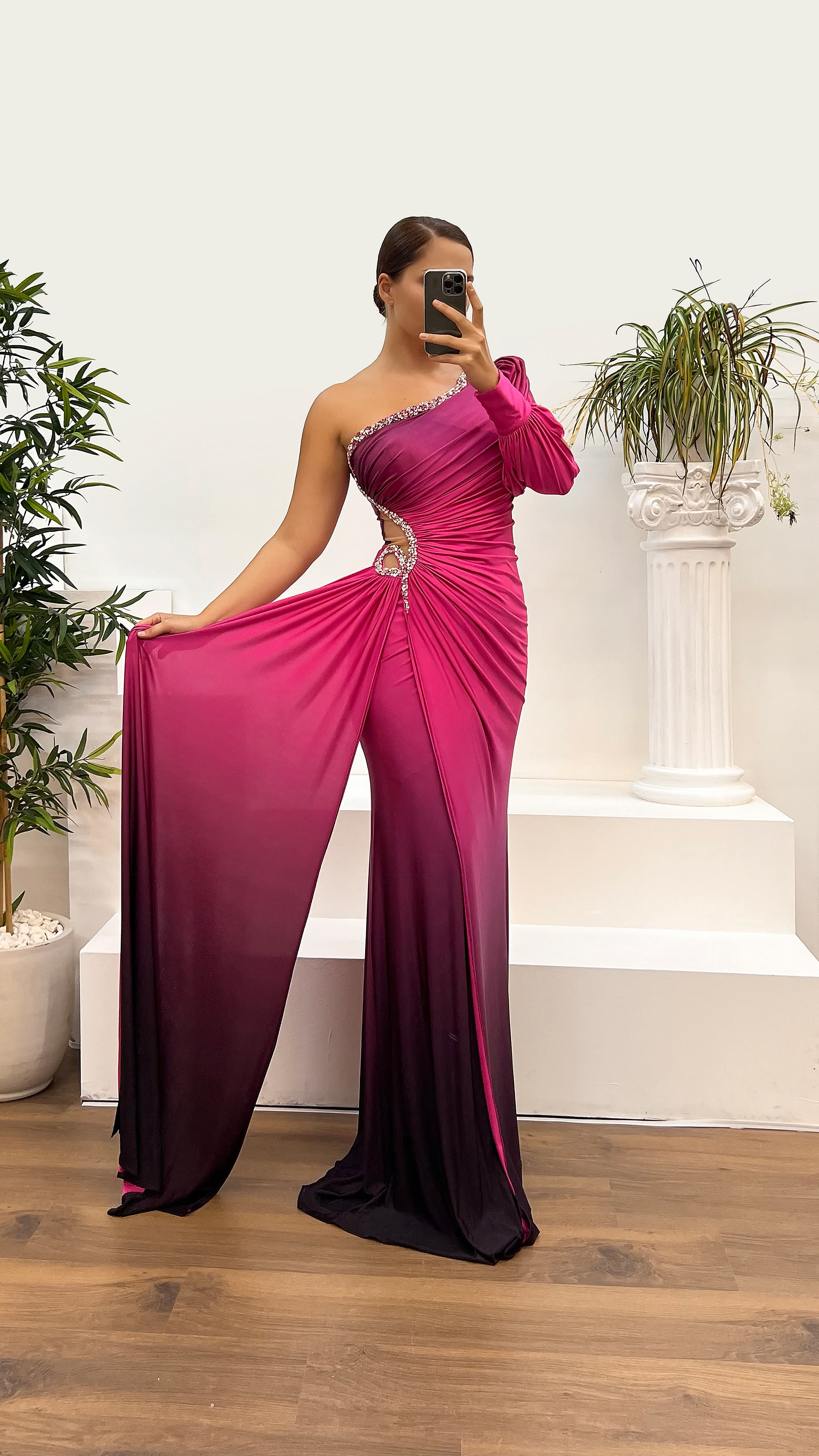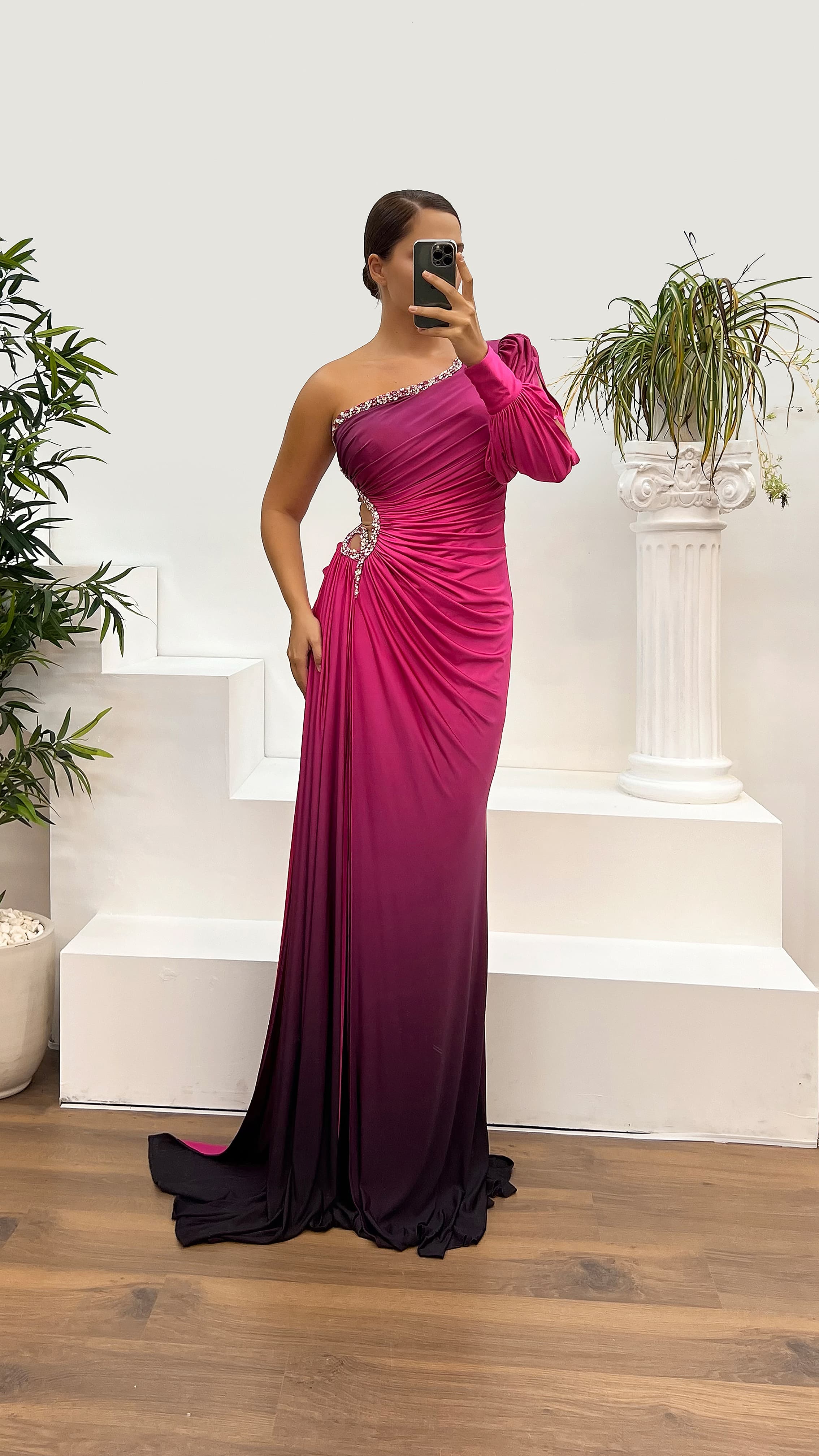 • Fuşya Tek Kol Bel Detay Taş İşlemeli Tasarım Büyük Beden Abiye Elbise