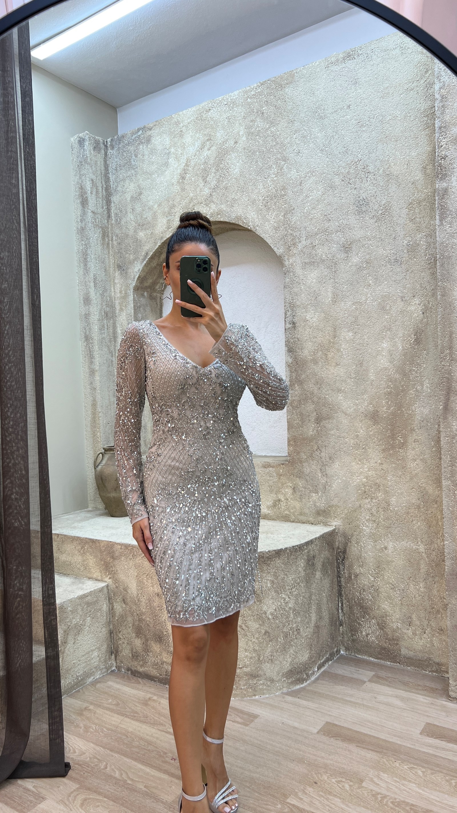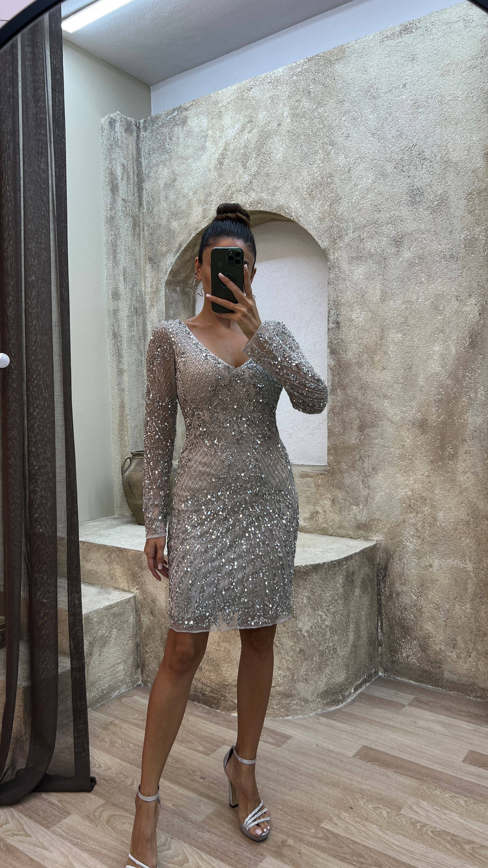 • Gri V Yaka Özel İşlemeli Kol Detay Tasarım Elbise