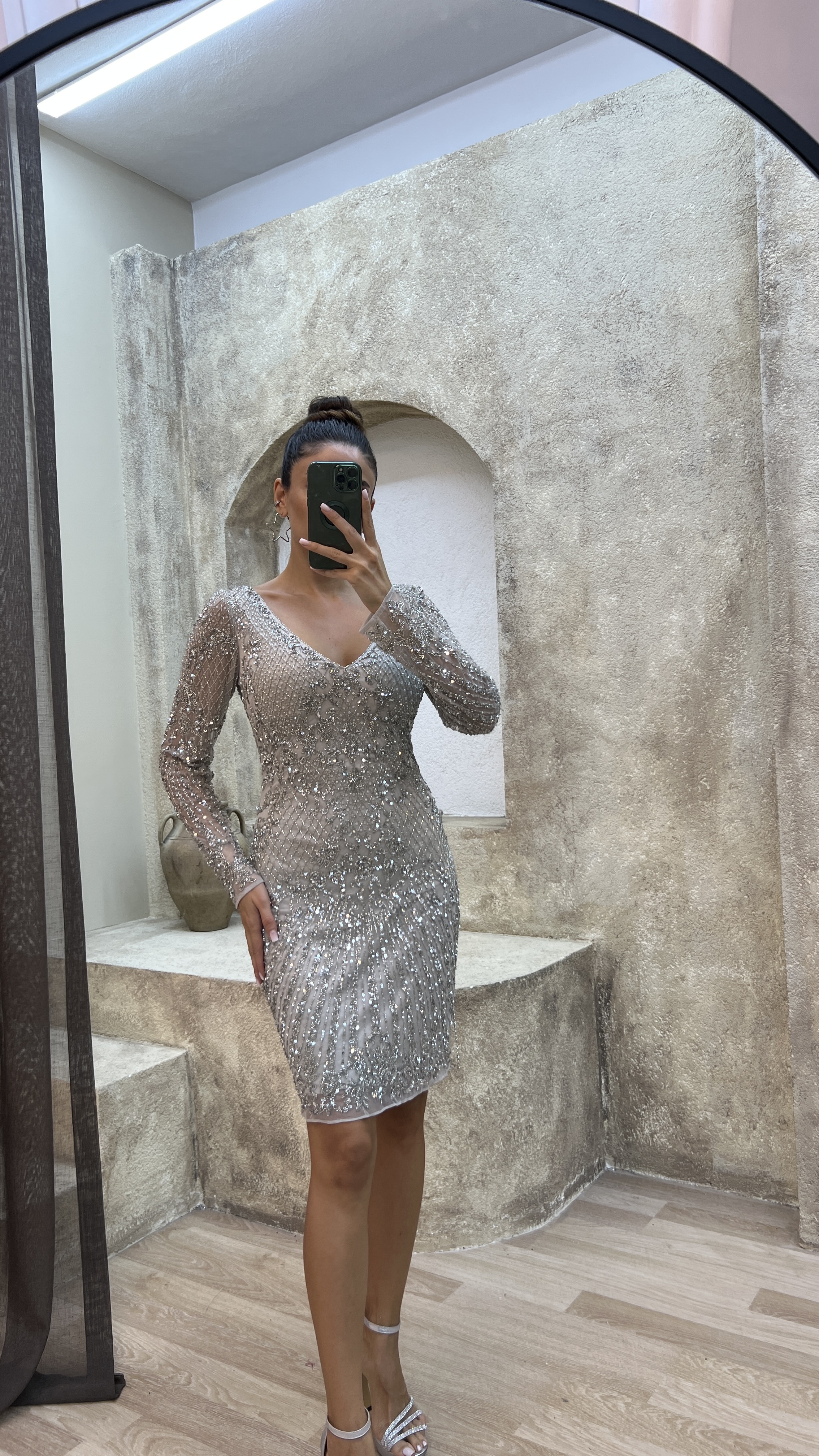 • Bej V Yaka Özel İşlemeli Kol Detay Tasarım Elbise