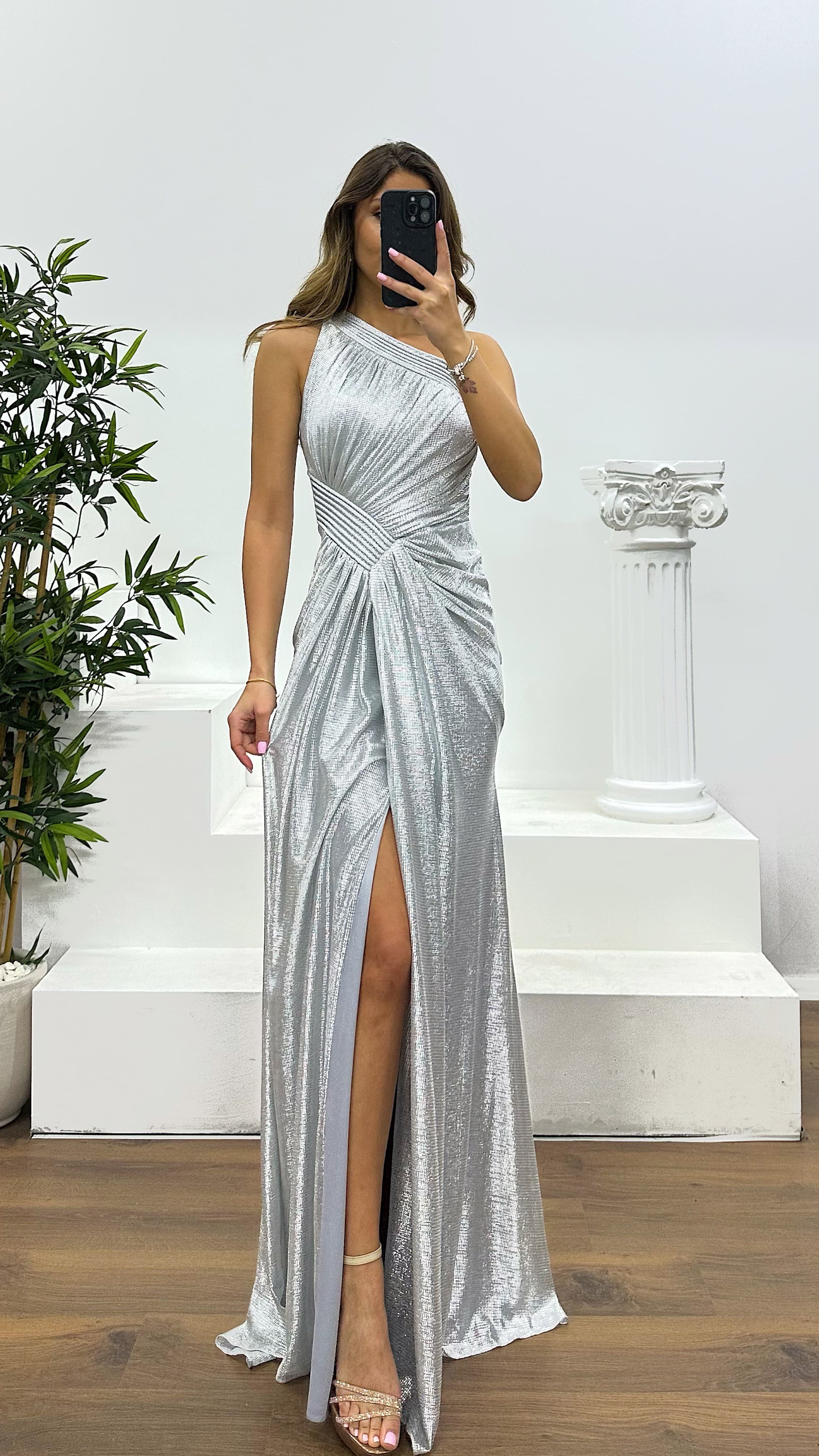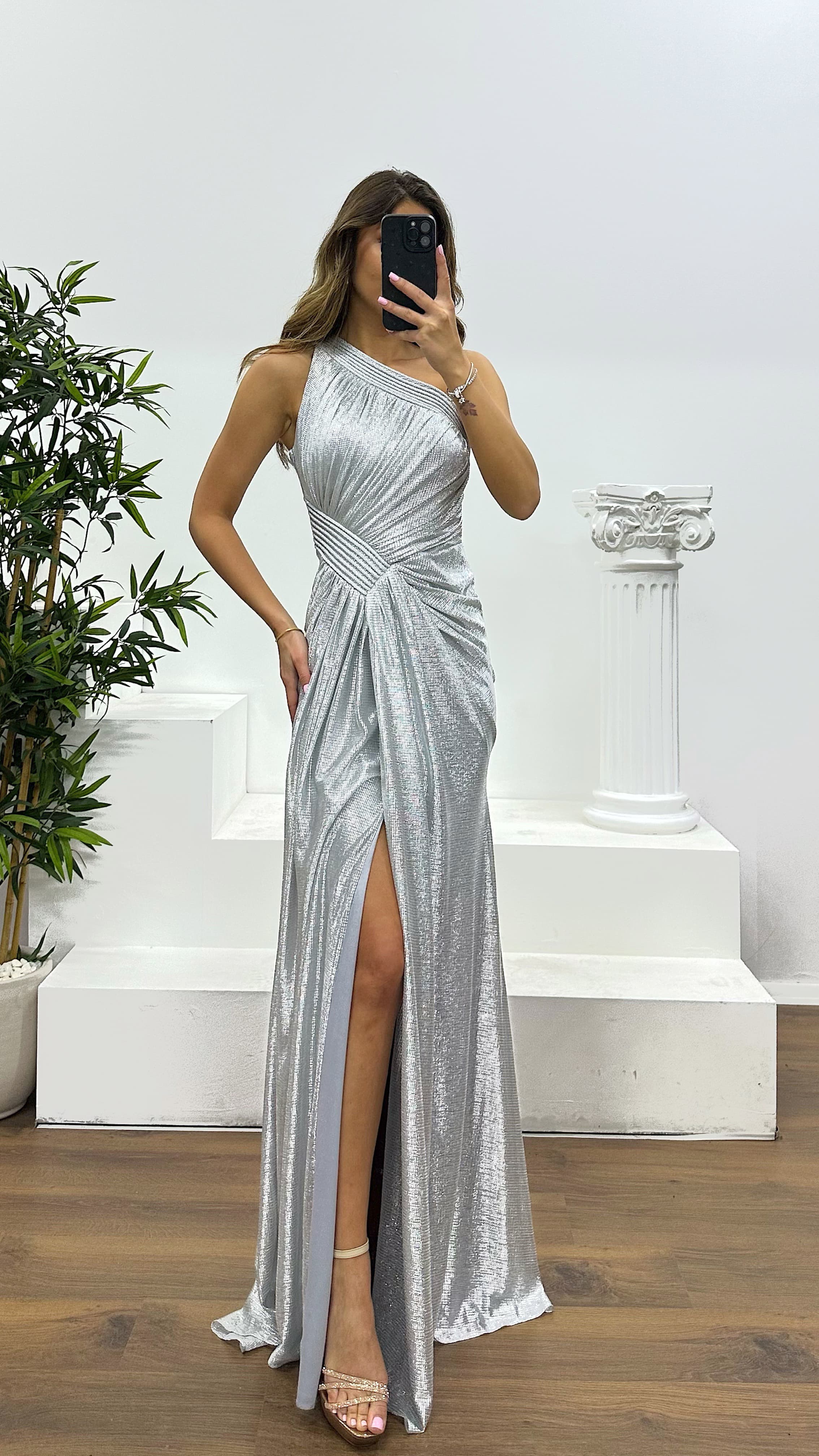 Robe de soirée à une épaule Convient aux tailles 36 à 44, avec coques intégrées, doublure complète, fermeture zippée au dos et fente élégante. Longueur du produit : Peut varier entre 170 et 175 cm. Tissu : Mousseline – 66 % viscose, 34 % polyester.