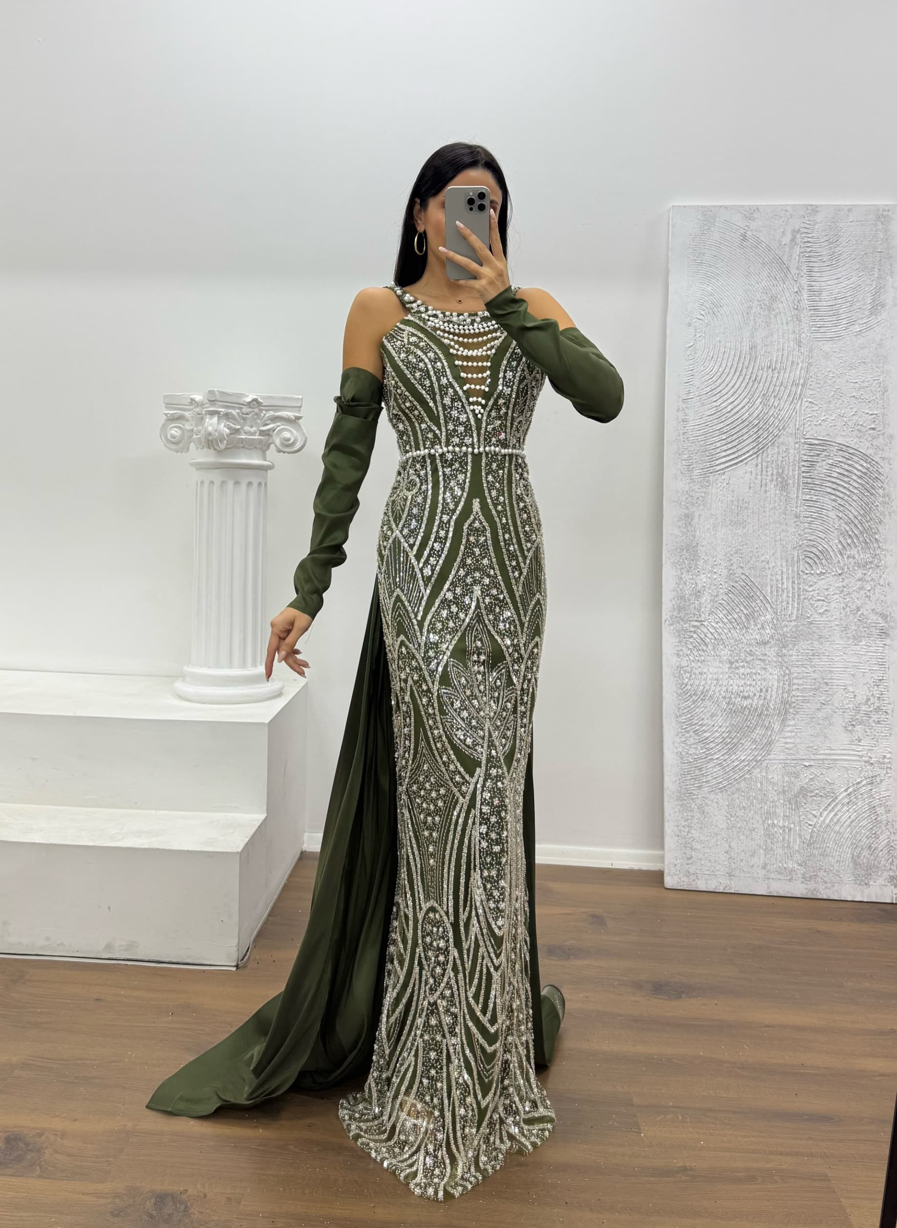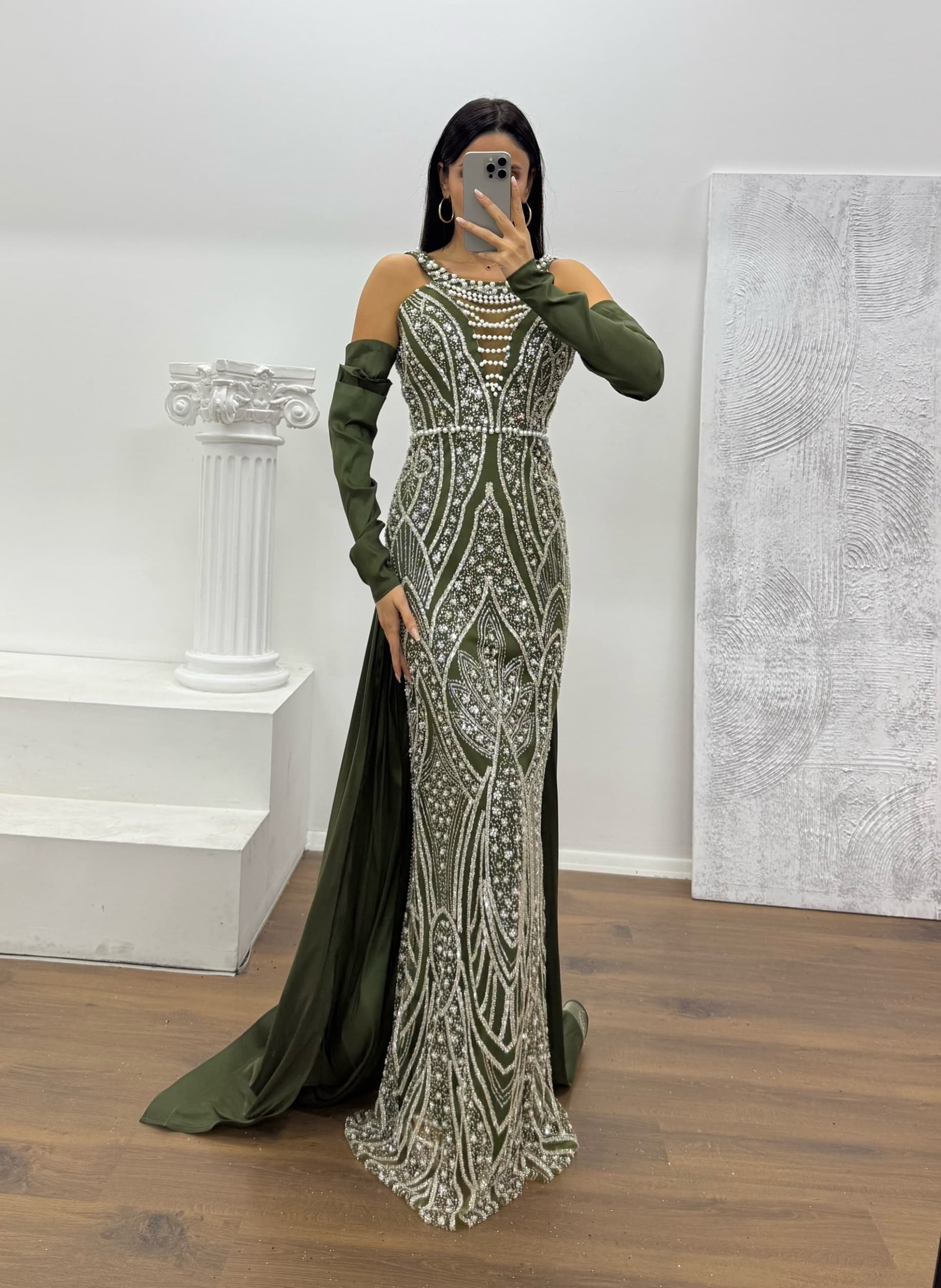 • Turuncu Halter Yaka İncli Abiye Elbise
