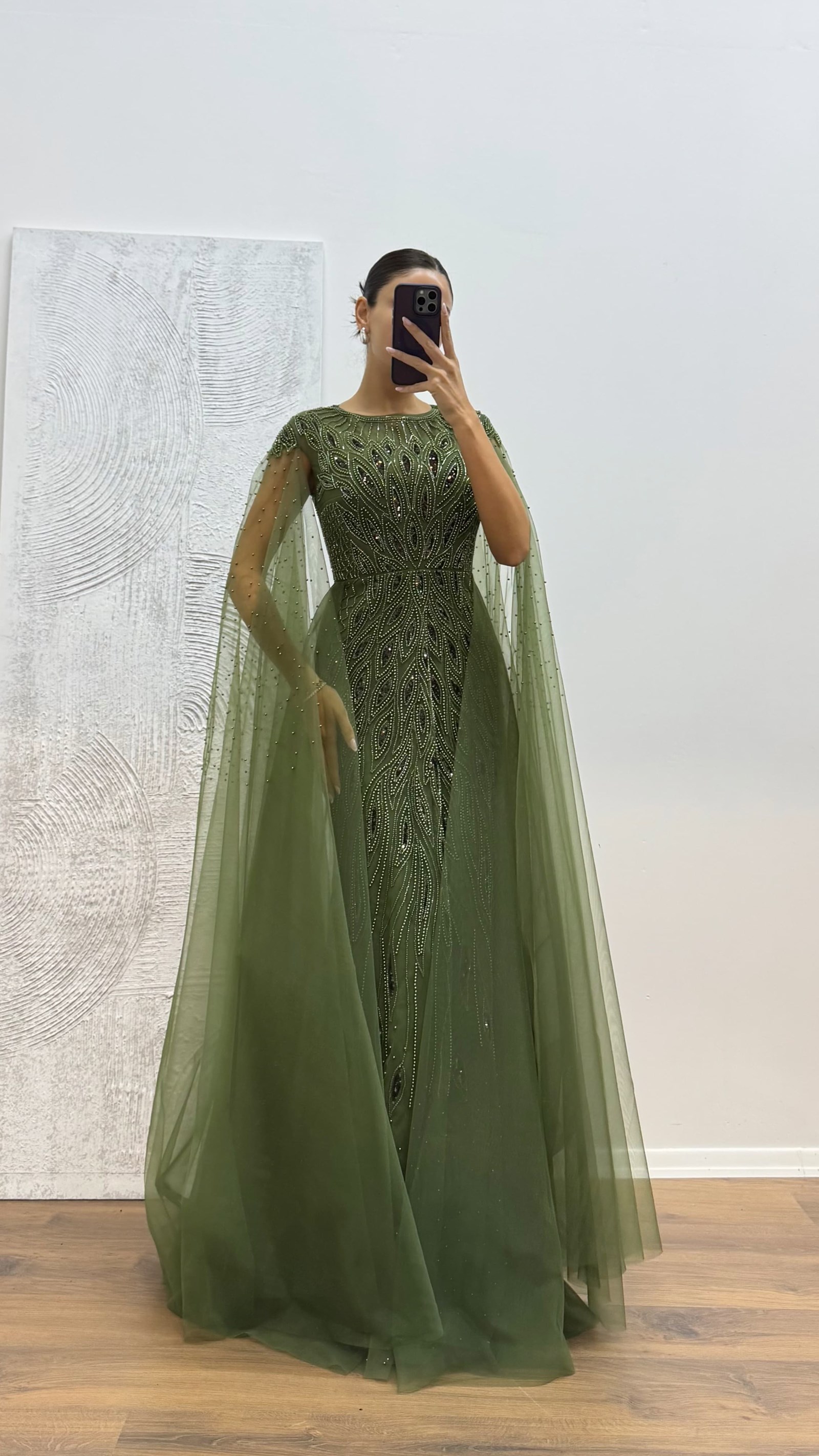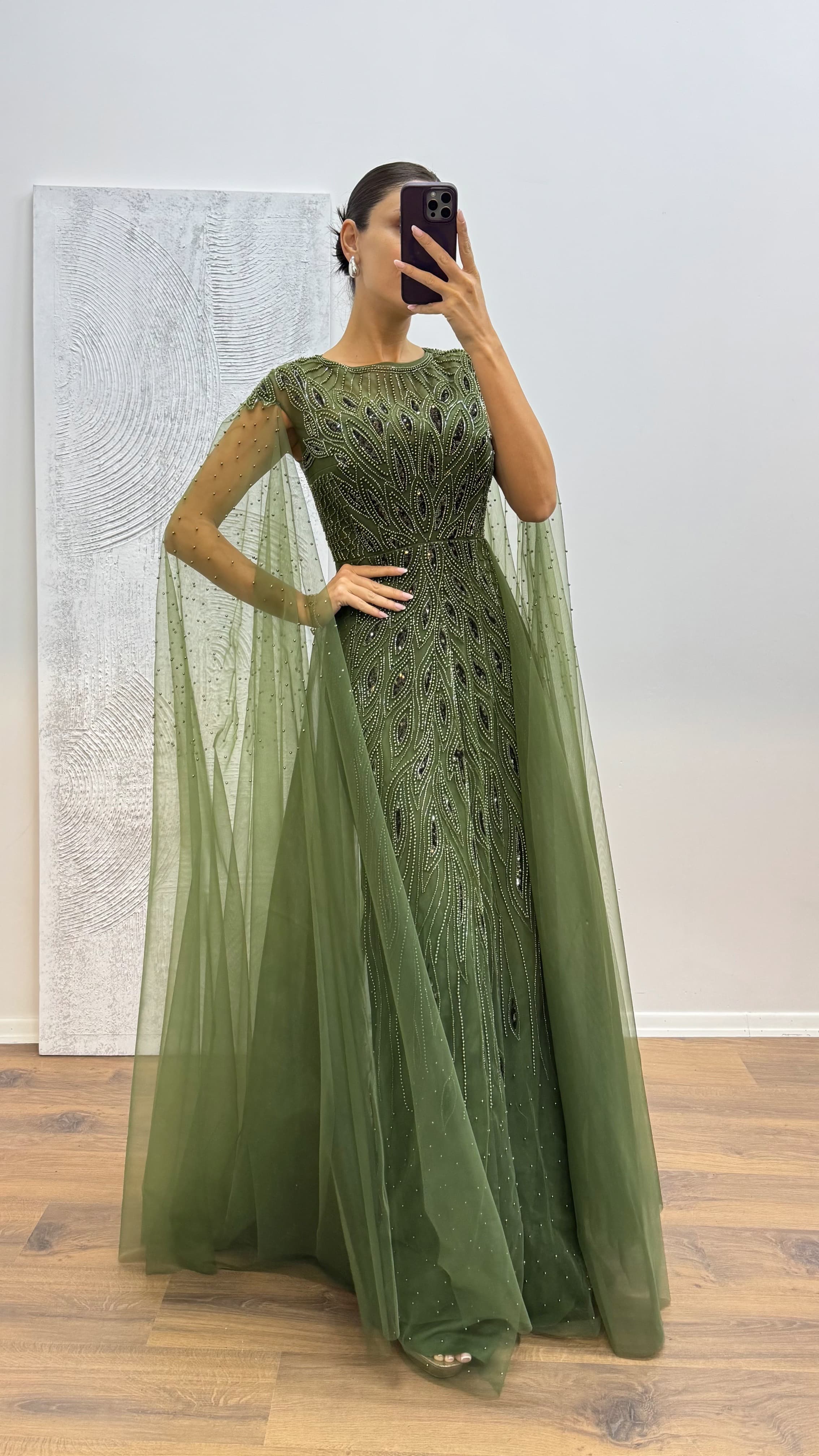 Robe de soirée en tulle brodé Convient aux tailles 36 à 44, avec coques intégrées, doublée, fermeture zippée au dos et broderies décoratives. Longueur de la robe : entre 165 et 170 cm. Tissu : tulle — 97 % polyester, 3 % élasthanne.