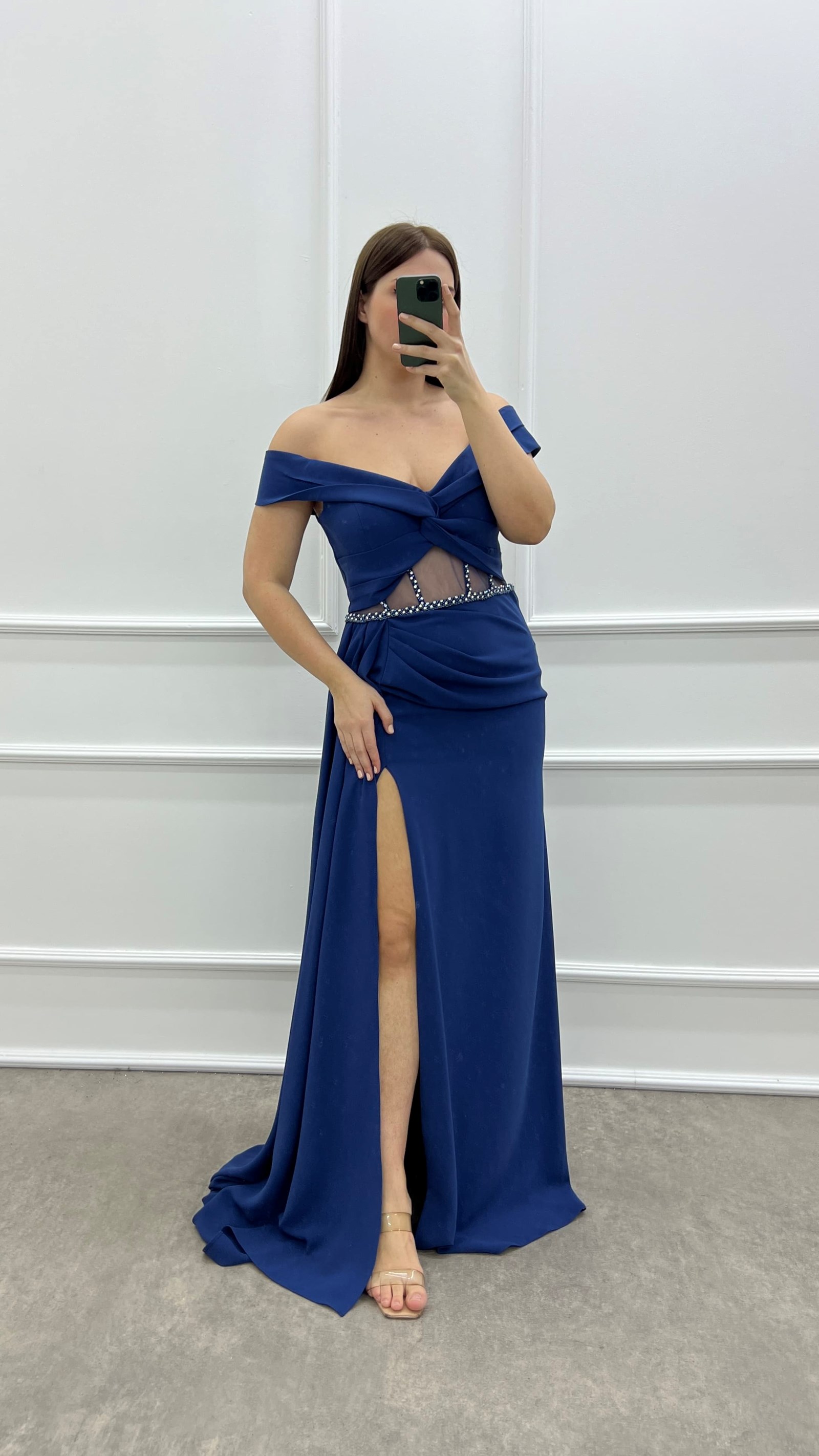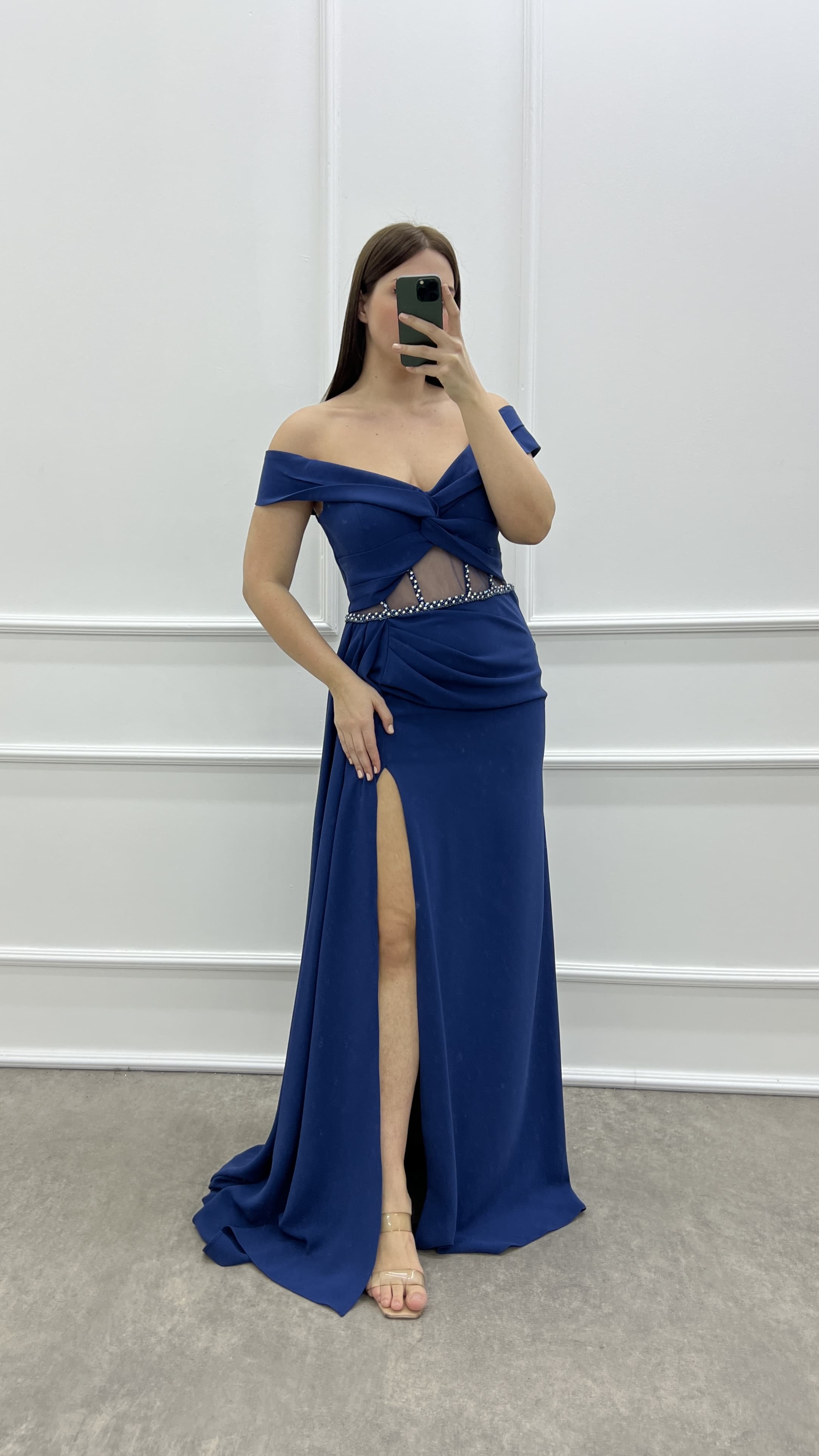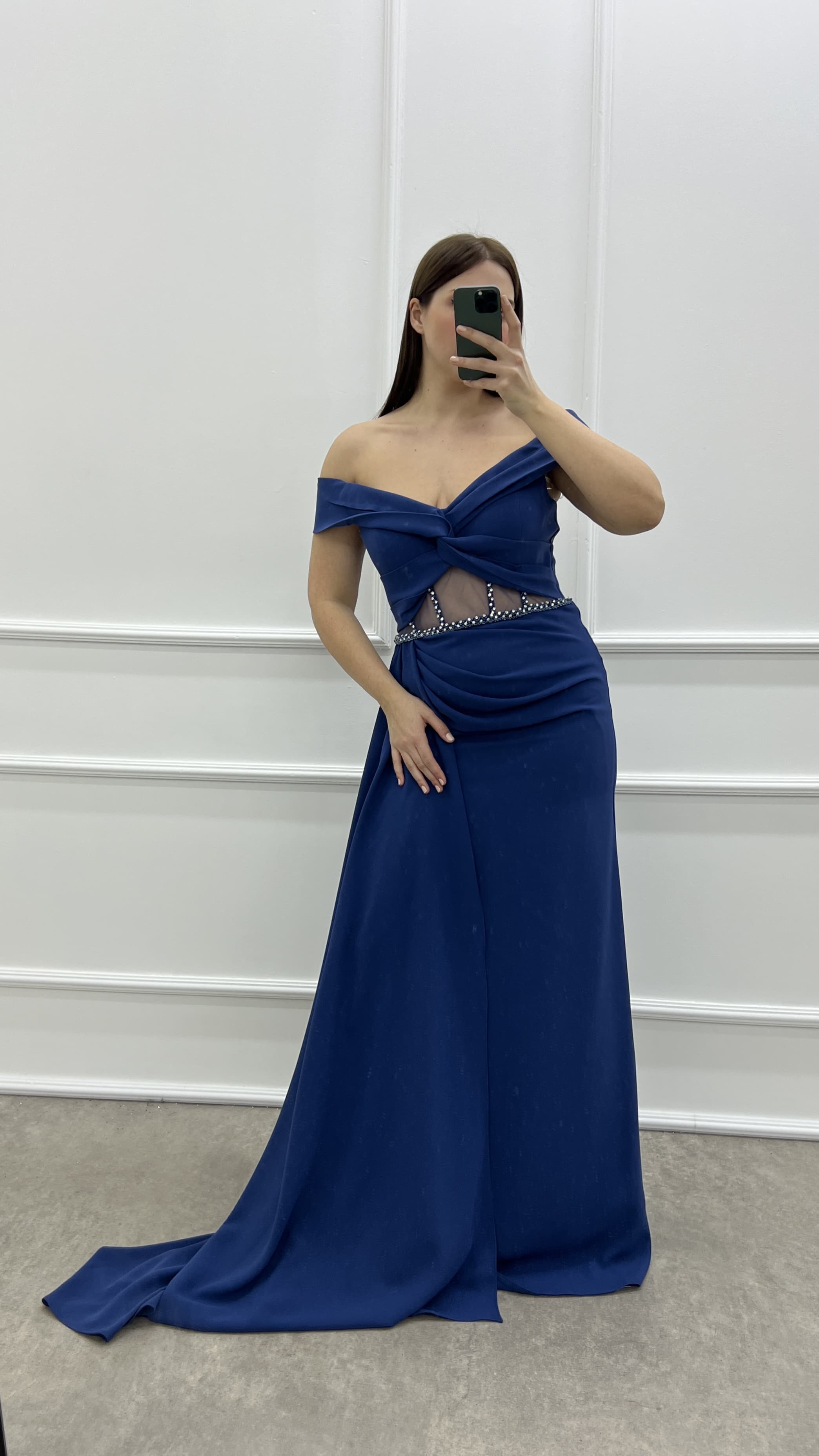 • İndigo Göğsü Çapraz Transparan Detay Tasarım Büyük Beden Abiye Elbise