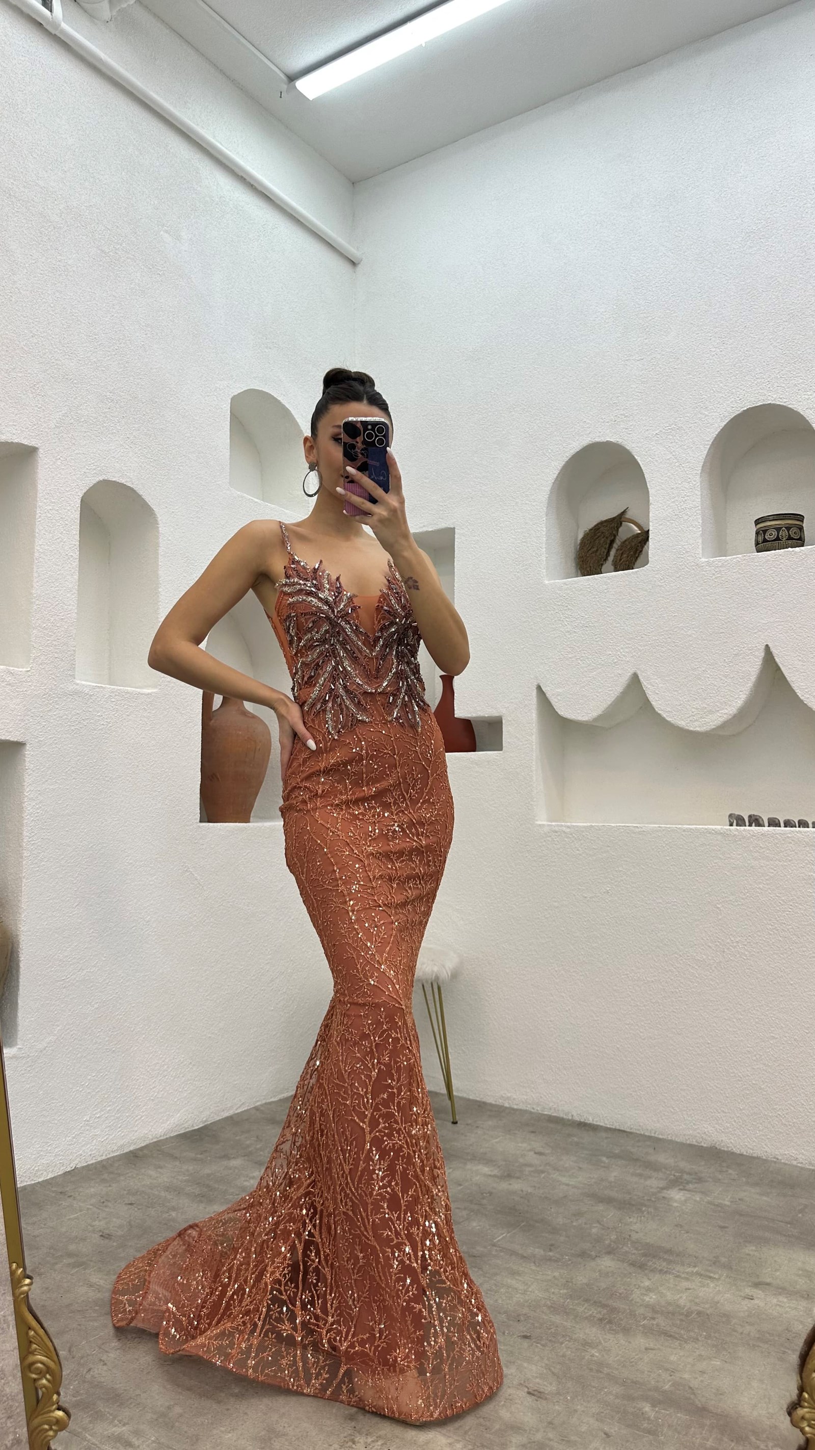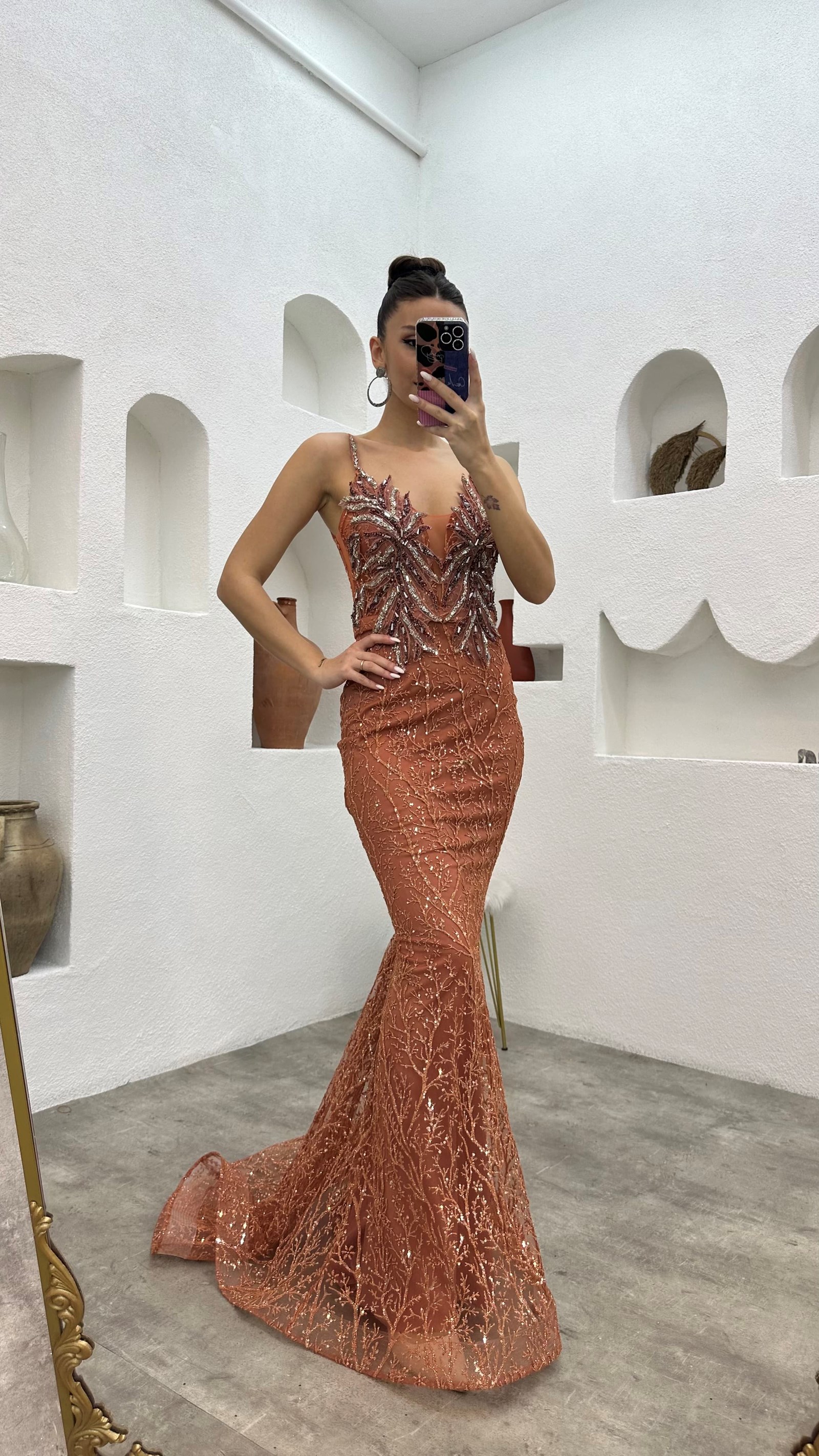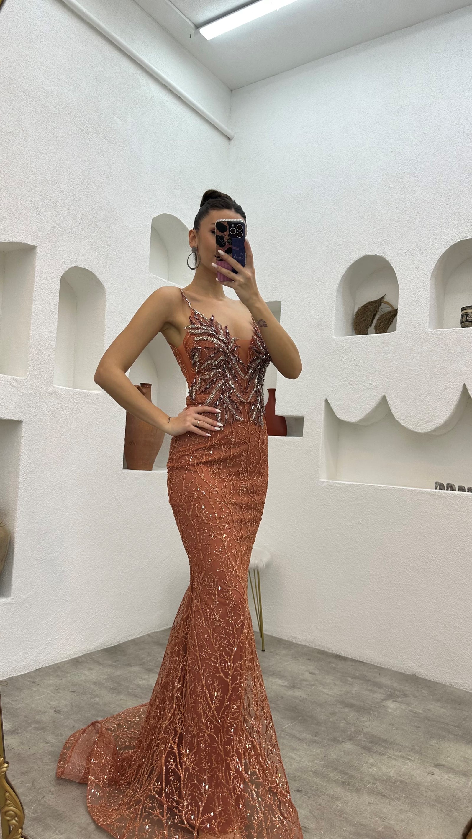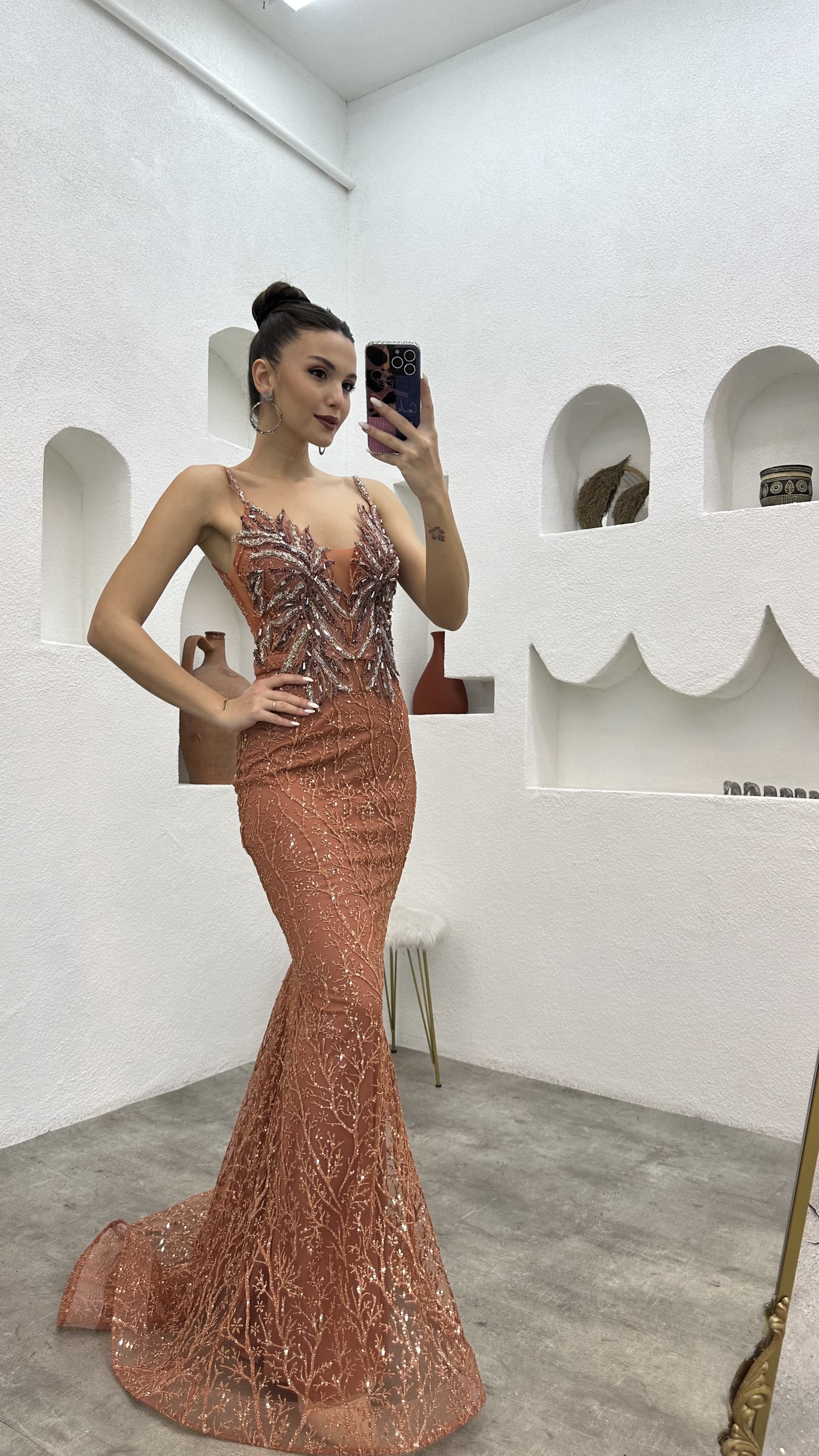 • Kiremit İp Askılı İşlemeli Tül Abiye Elbise