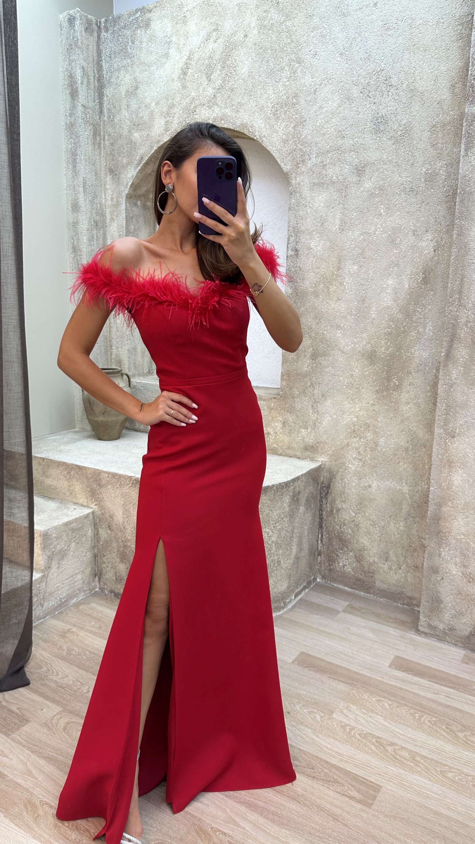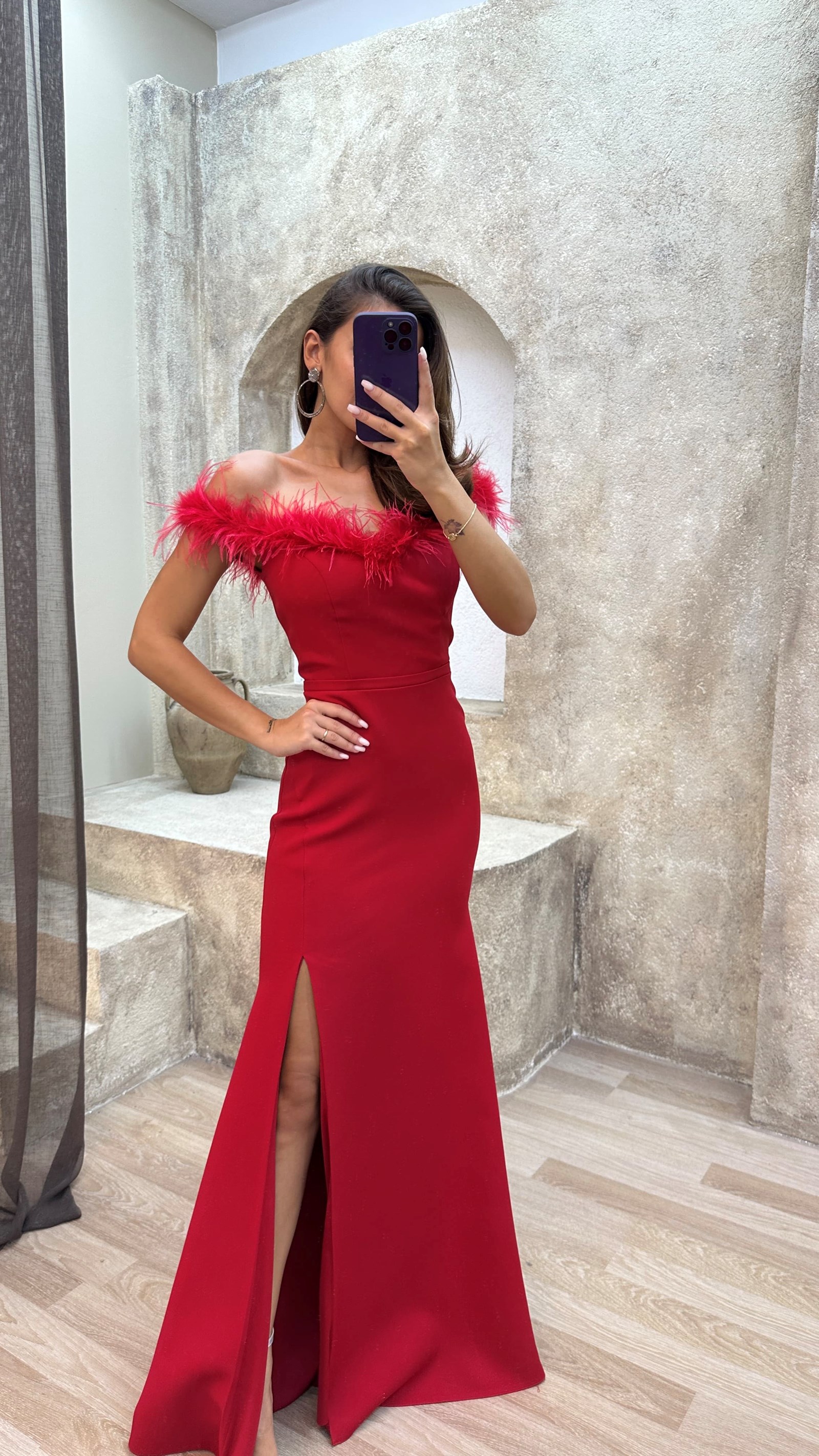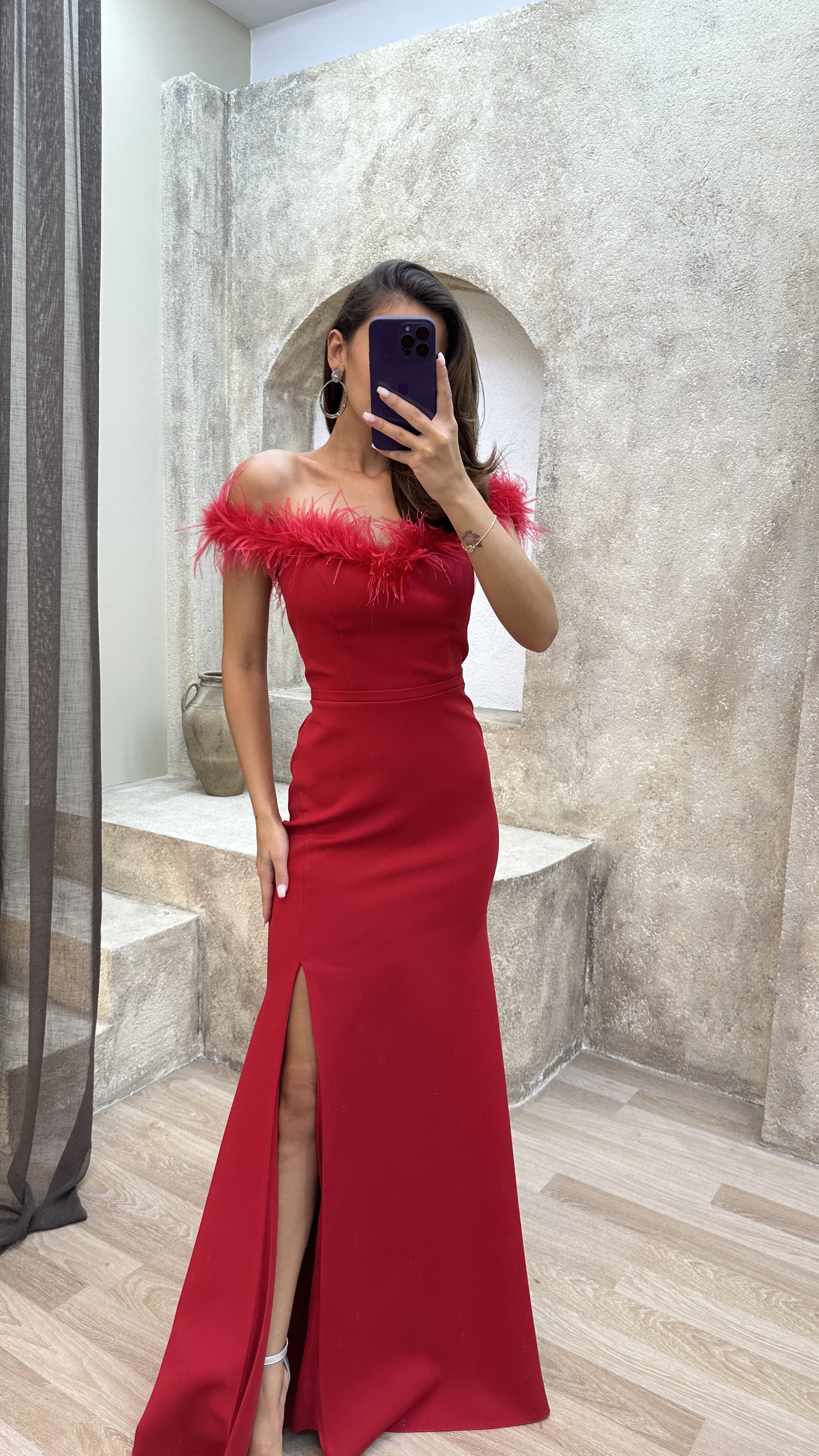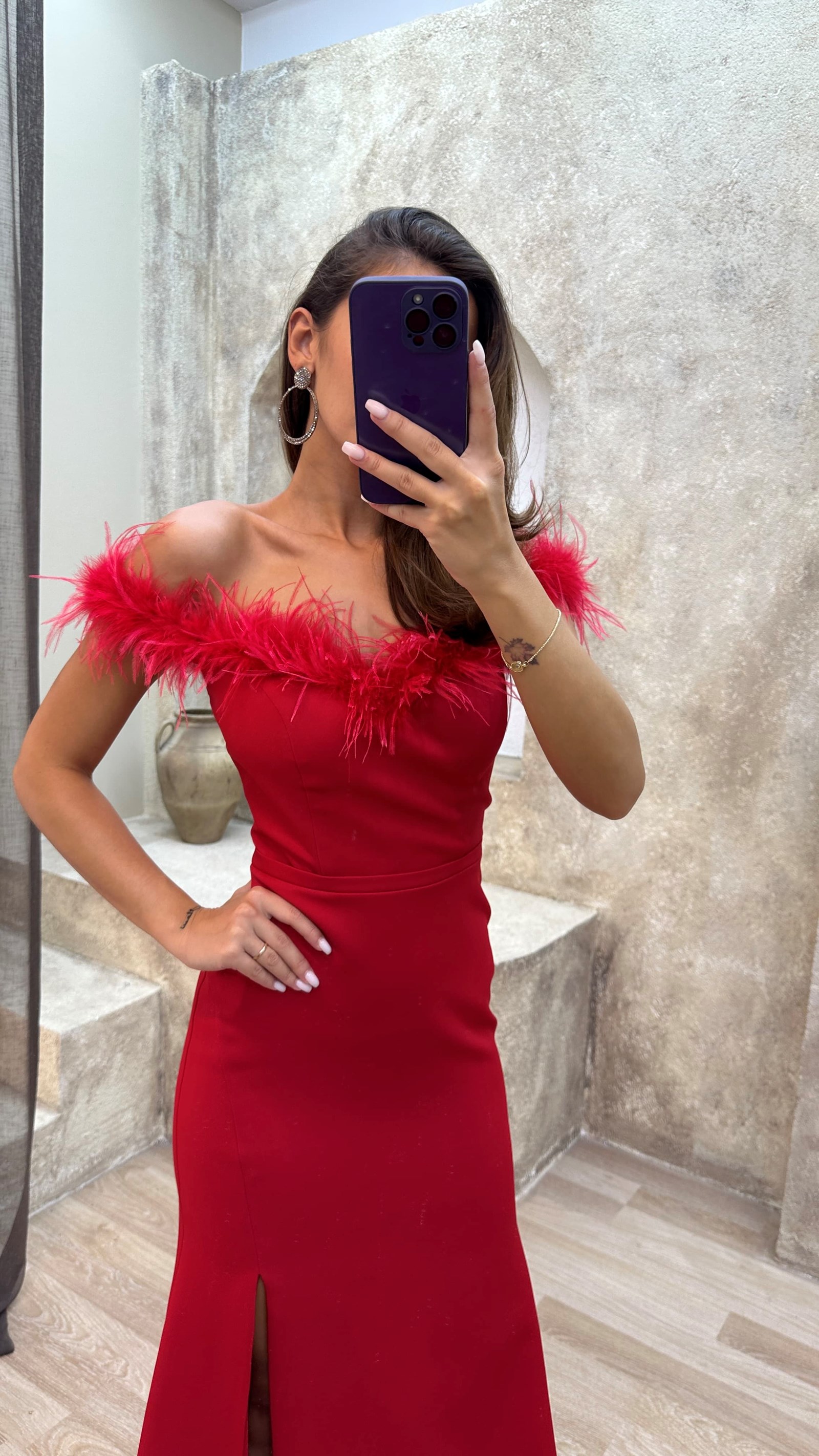 • Kırmızı Göğsü Tüy Detay Abiye Elbise