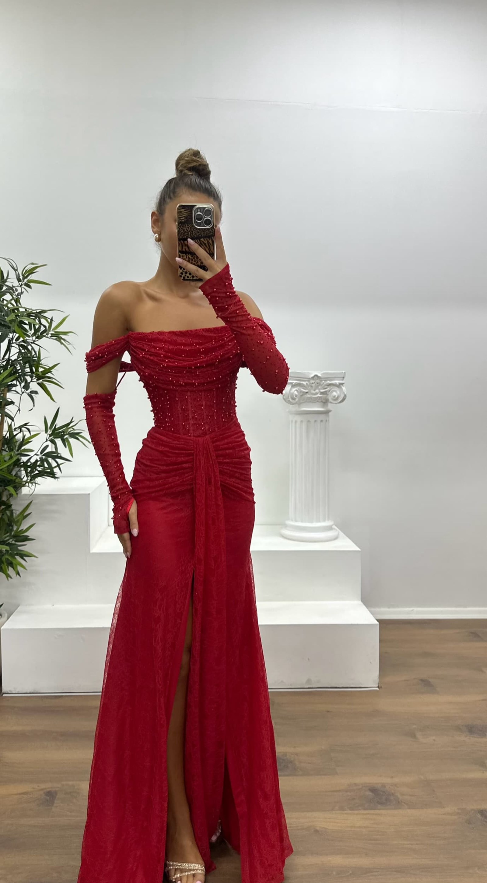 Robe de soirée en dentelle perlée Convient aux tailles 36 à 42, avec bonnets rembourrés, doublure, fermeture à lacets croisés dans le dos et fermeture éclair. Conçue avec des gants, une fente et des perles. Longueur de la robe : entre 170 et 175 cm. Type de tissu : Dentelle