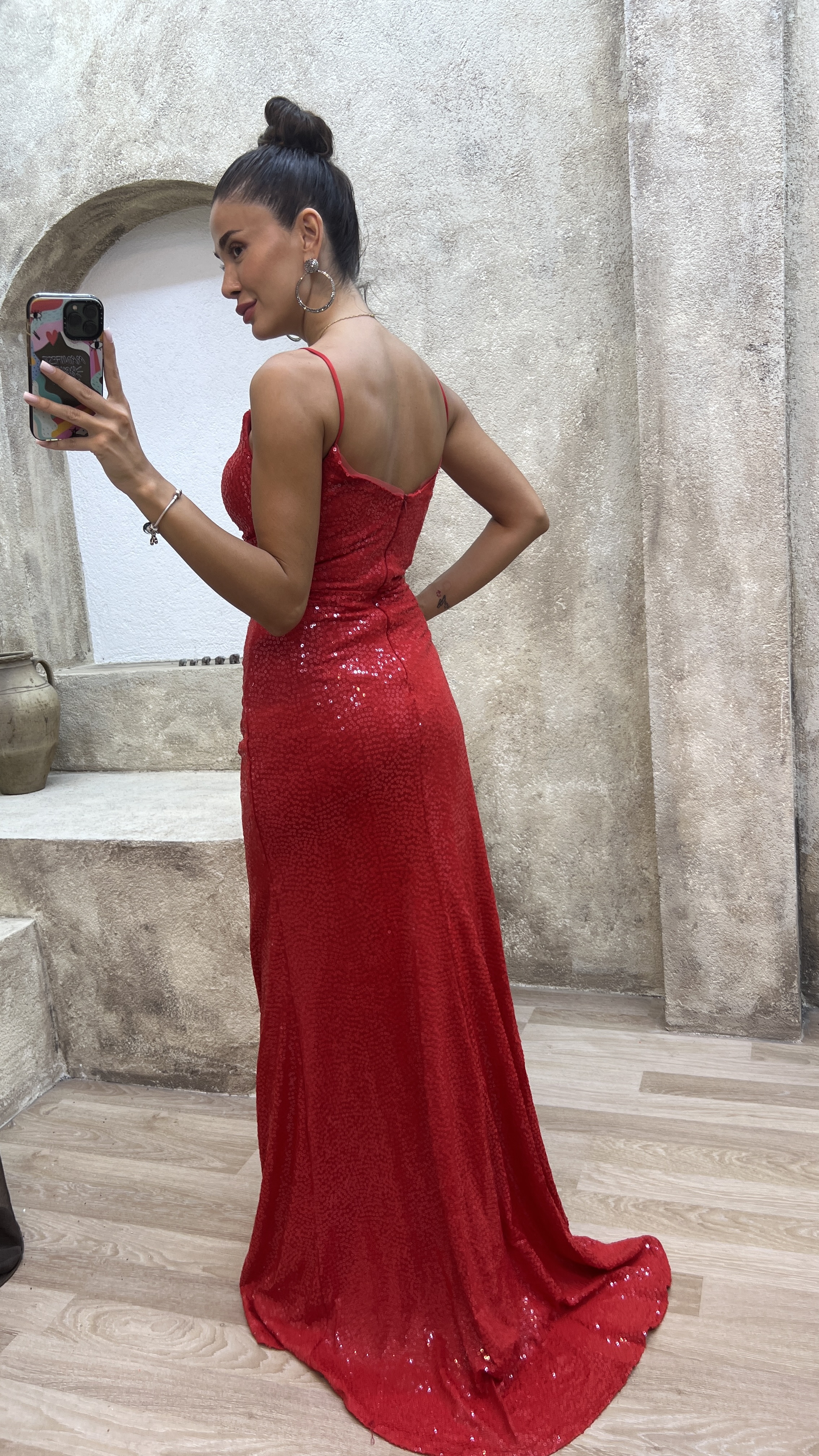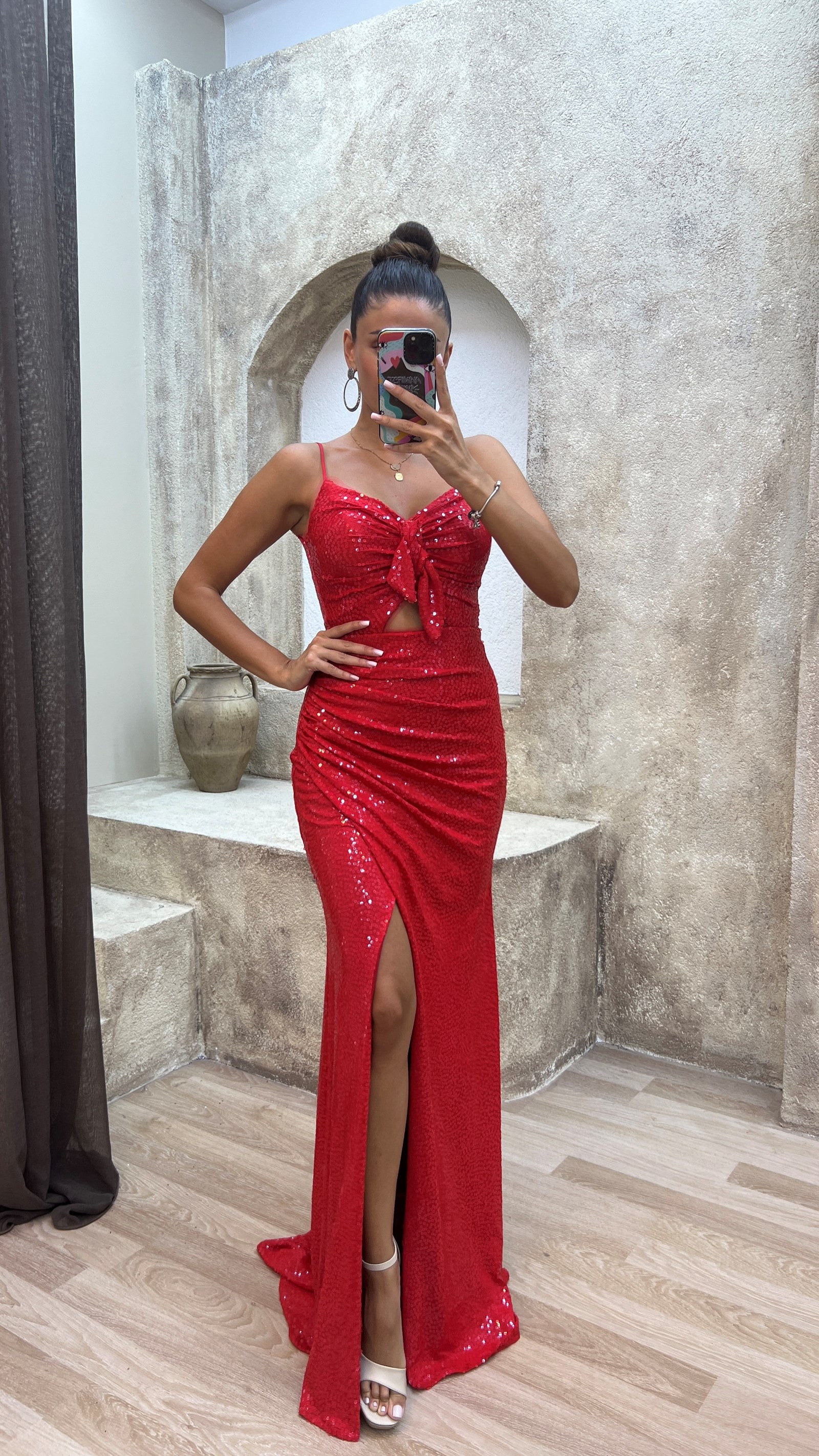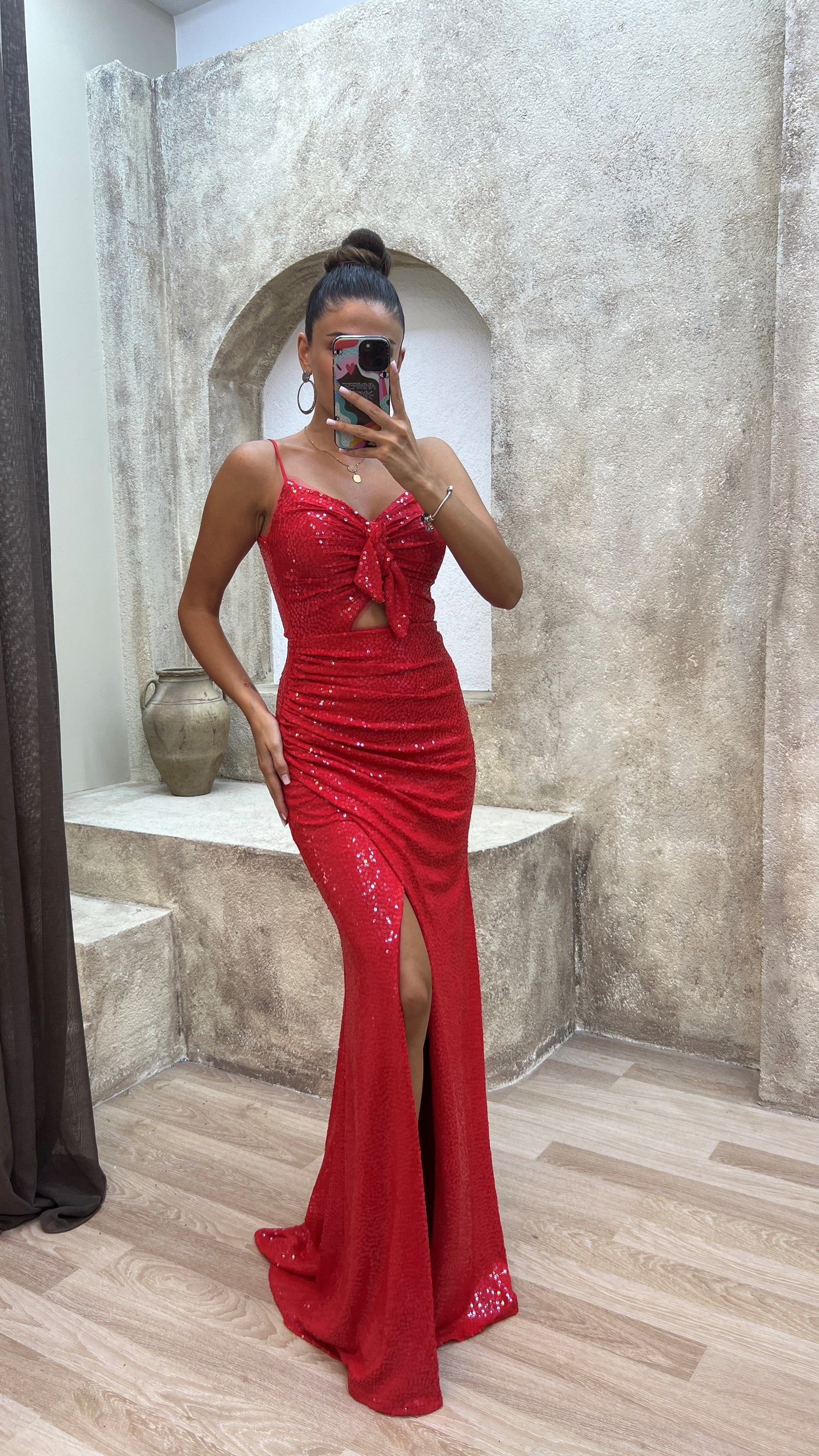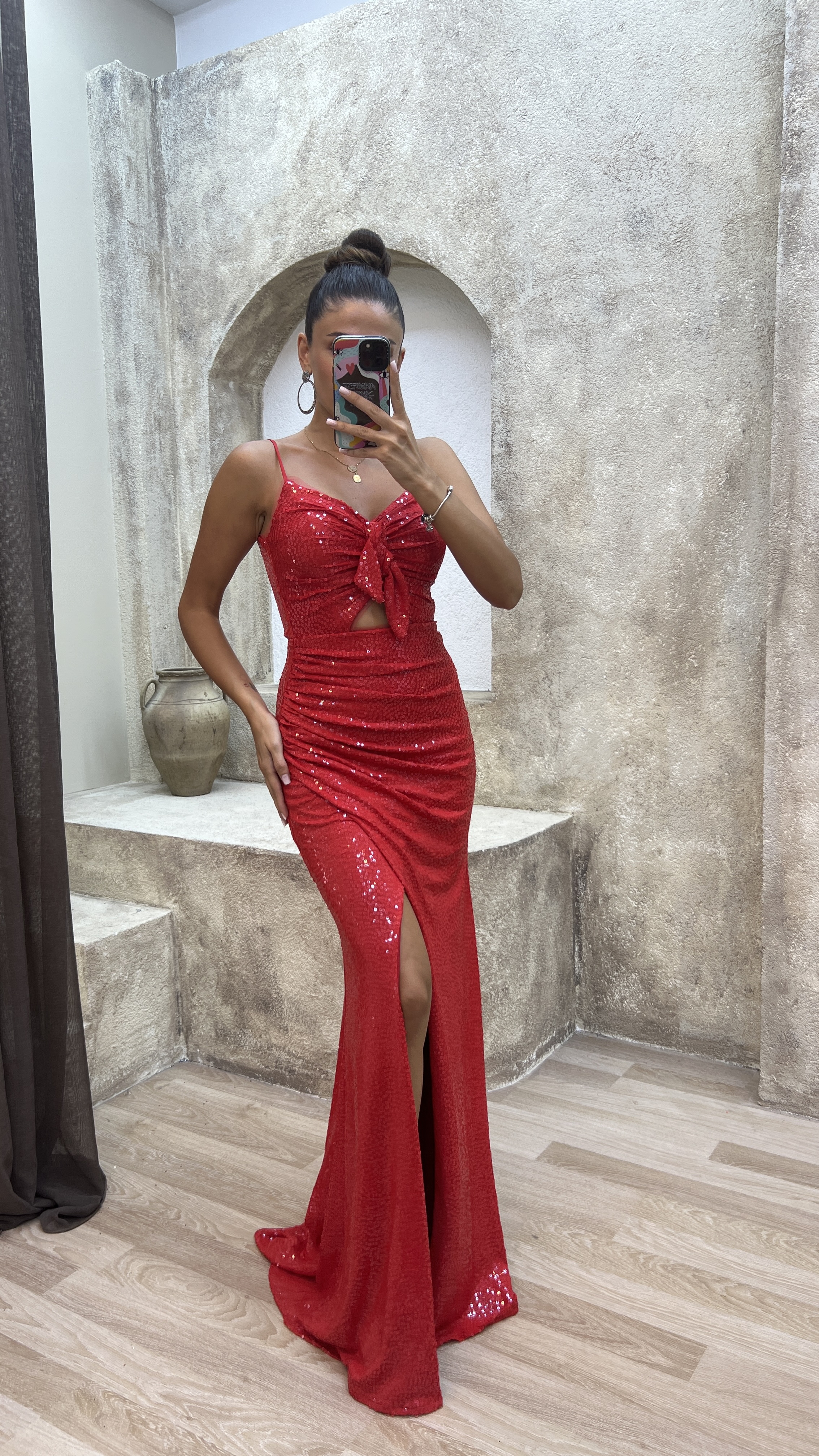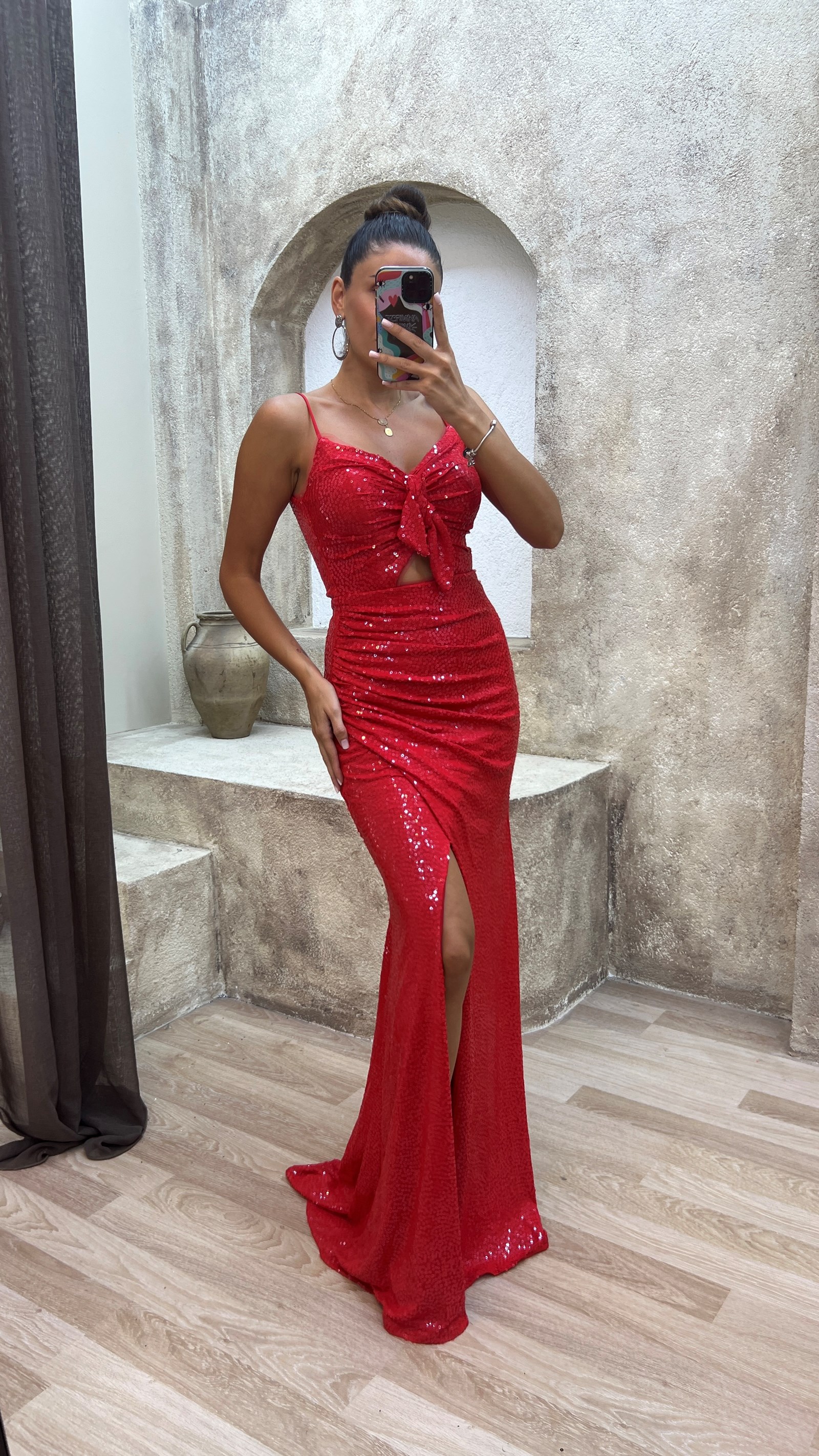 Kırmızı İp Askılı Göğsü Fiyonk Payet Elbise