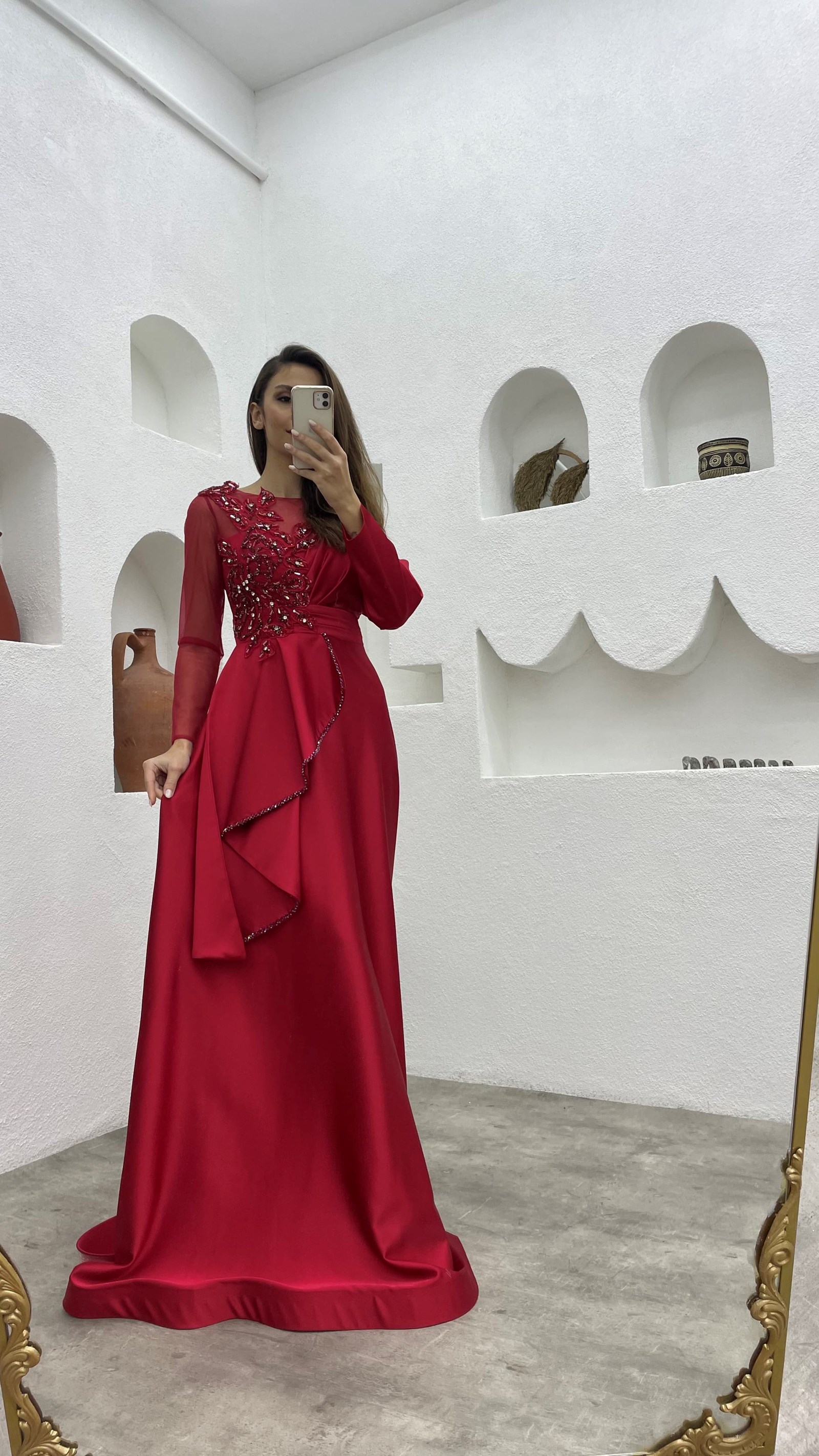 • Kırmızı İşlemeli Drapeli Volanlı Saten Abiye Elbise