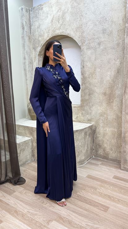 Bleu marine Poitrine Broderie Détail Design Robe de soirée