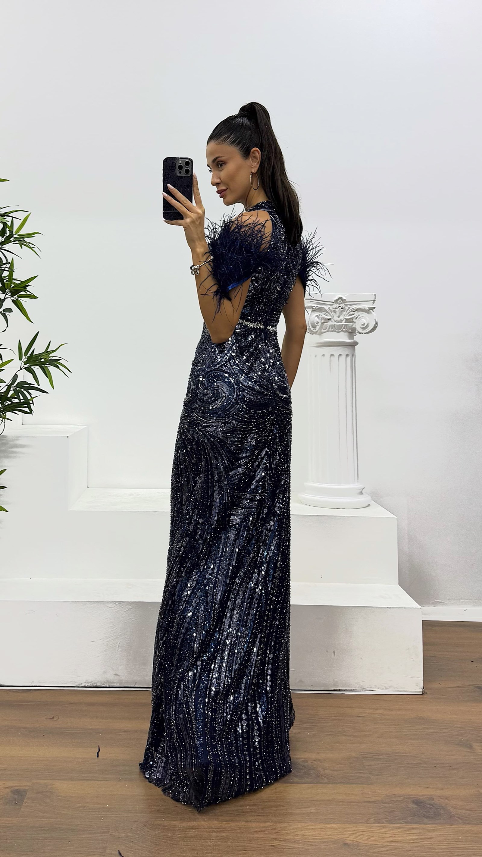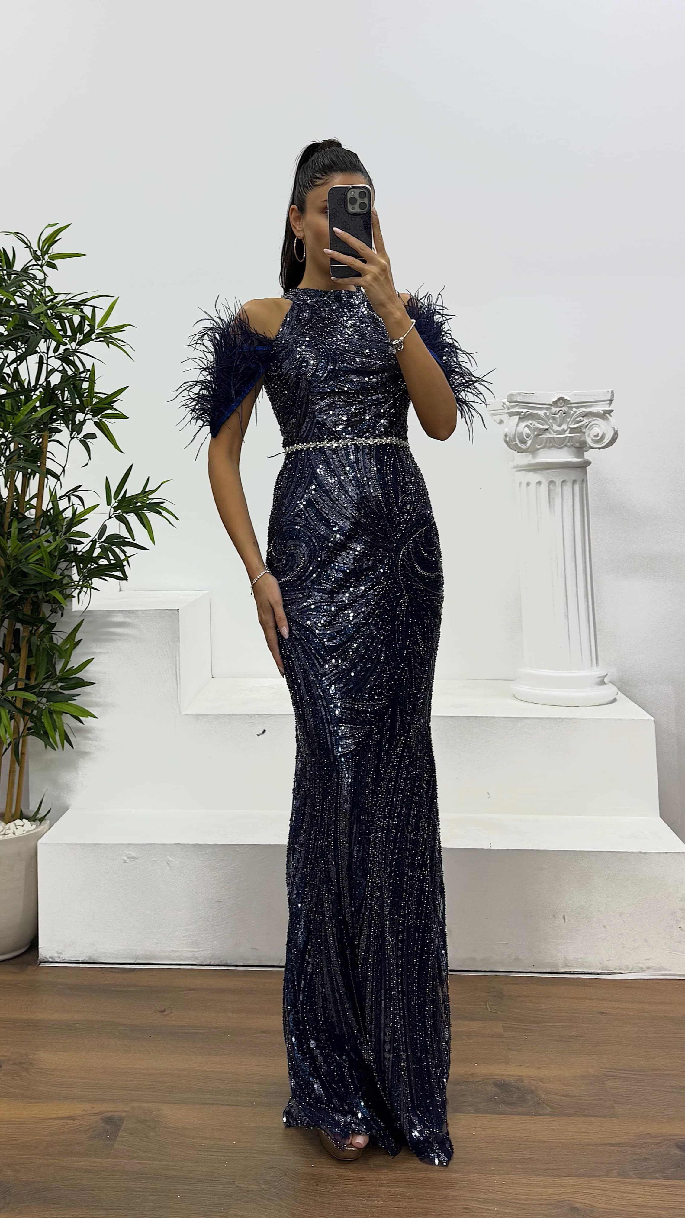Robe de soirée brodée bleu marine avec plumes