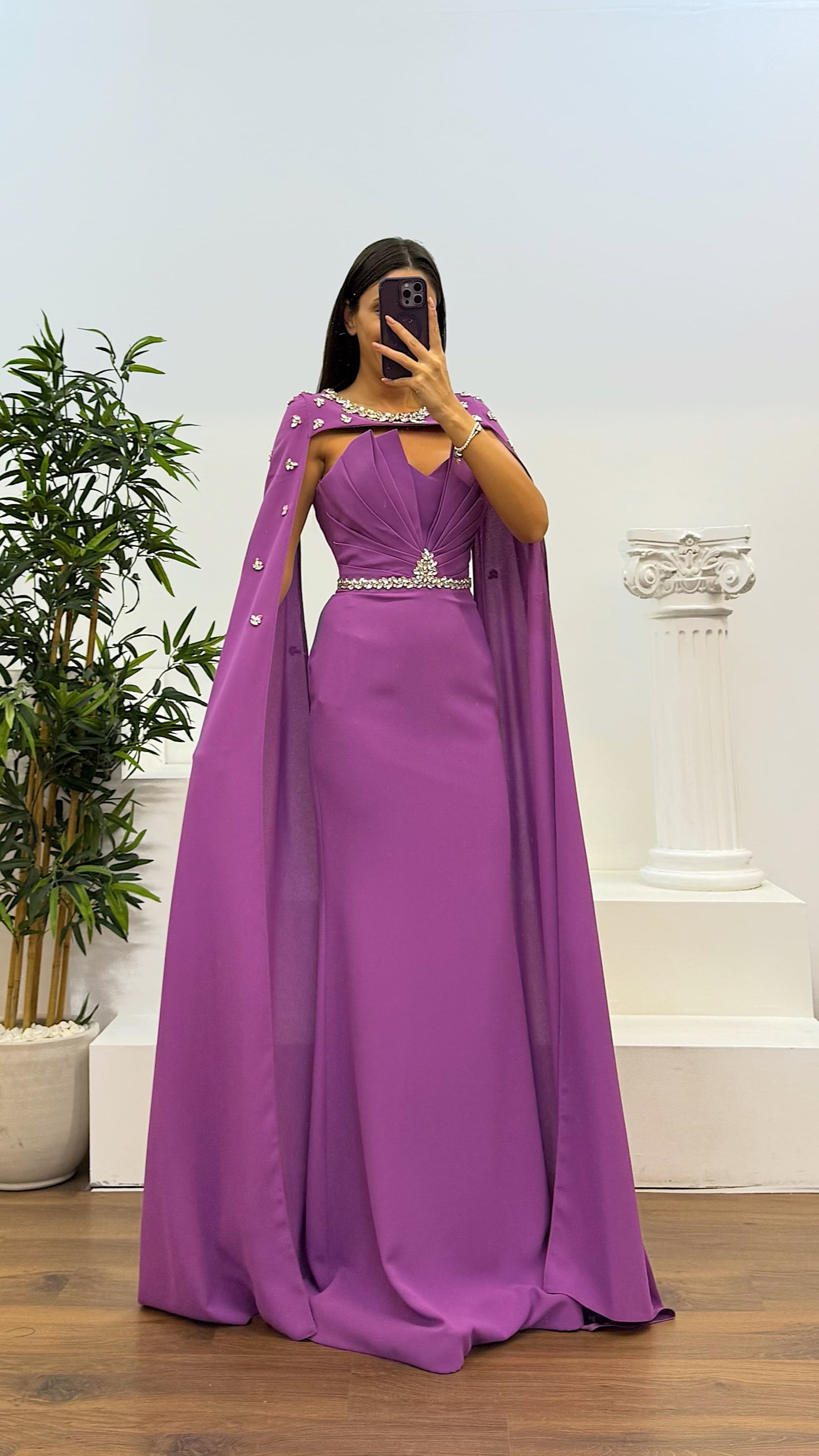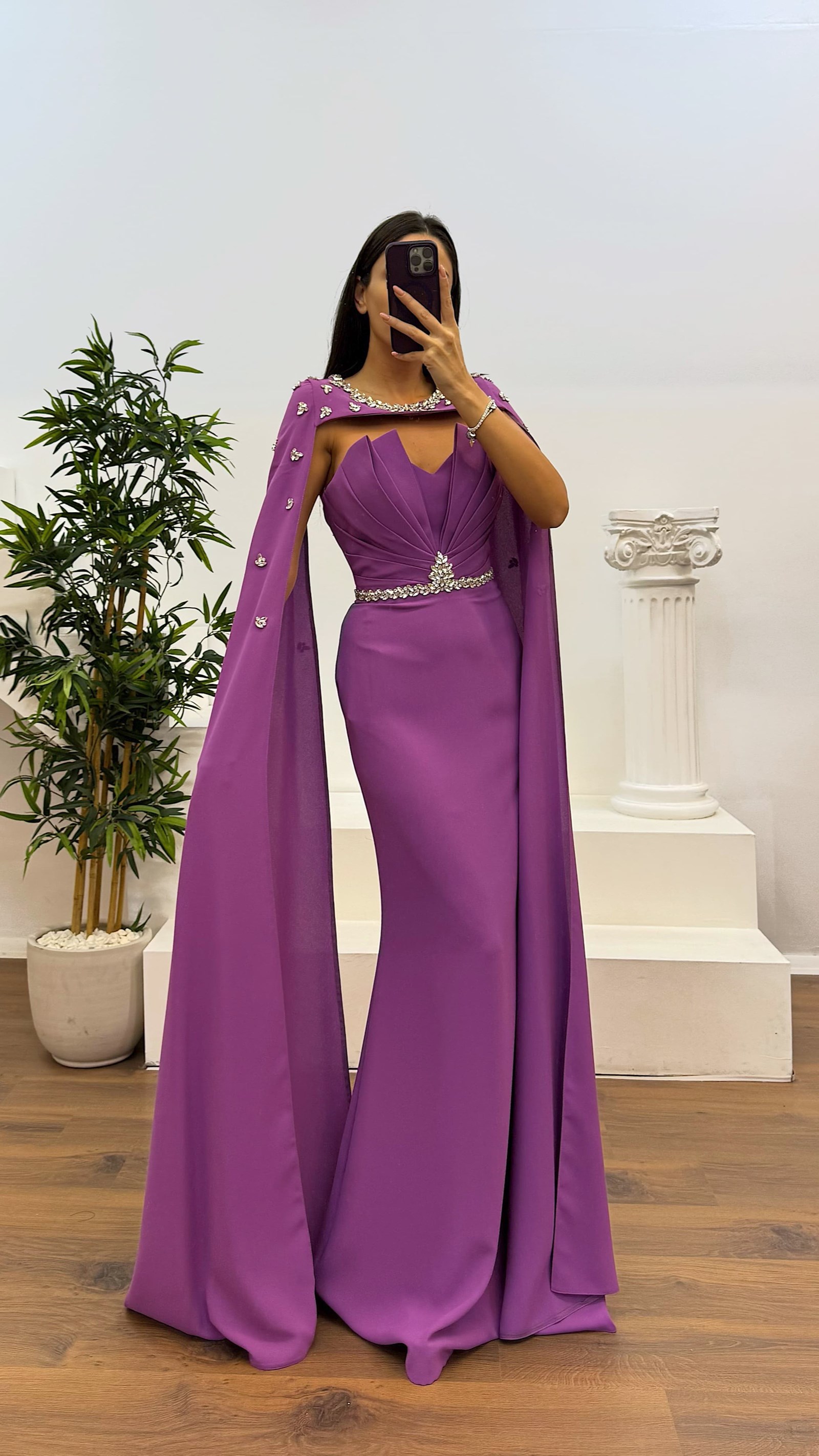 Robe de soirée avec cape et détails en pierres Le produit est compatible avec les tailles de 36 à 44, avec des coussinets de soutien-gorge, doublé, fermeture éclair à l'arrière, cape avec fermeture à bouton et conçu comme une robe de soirée avec des détails en pierres. La longueur du produit est de 160 cm. Type de tissu :100 % polyester.