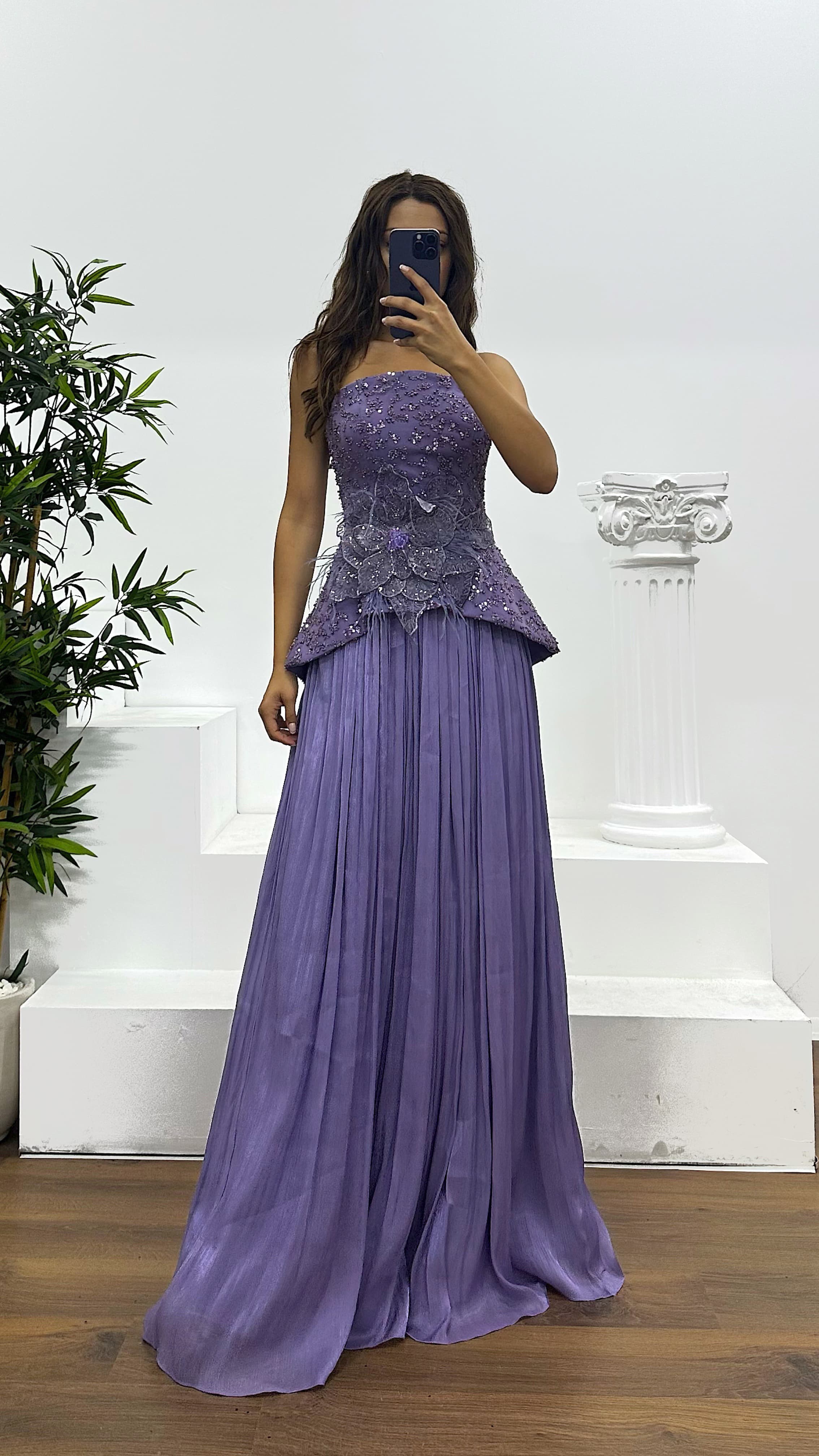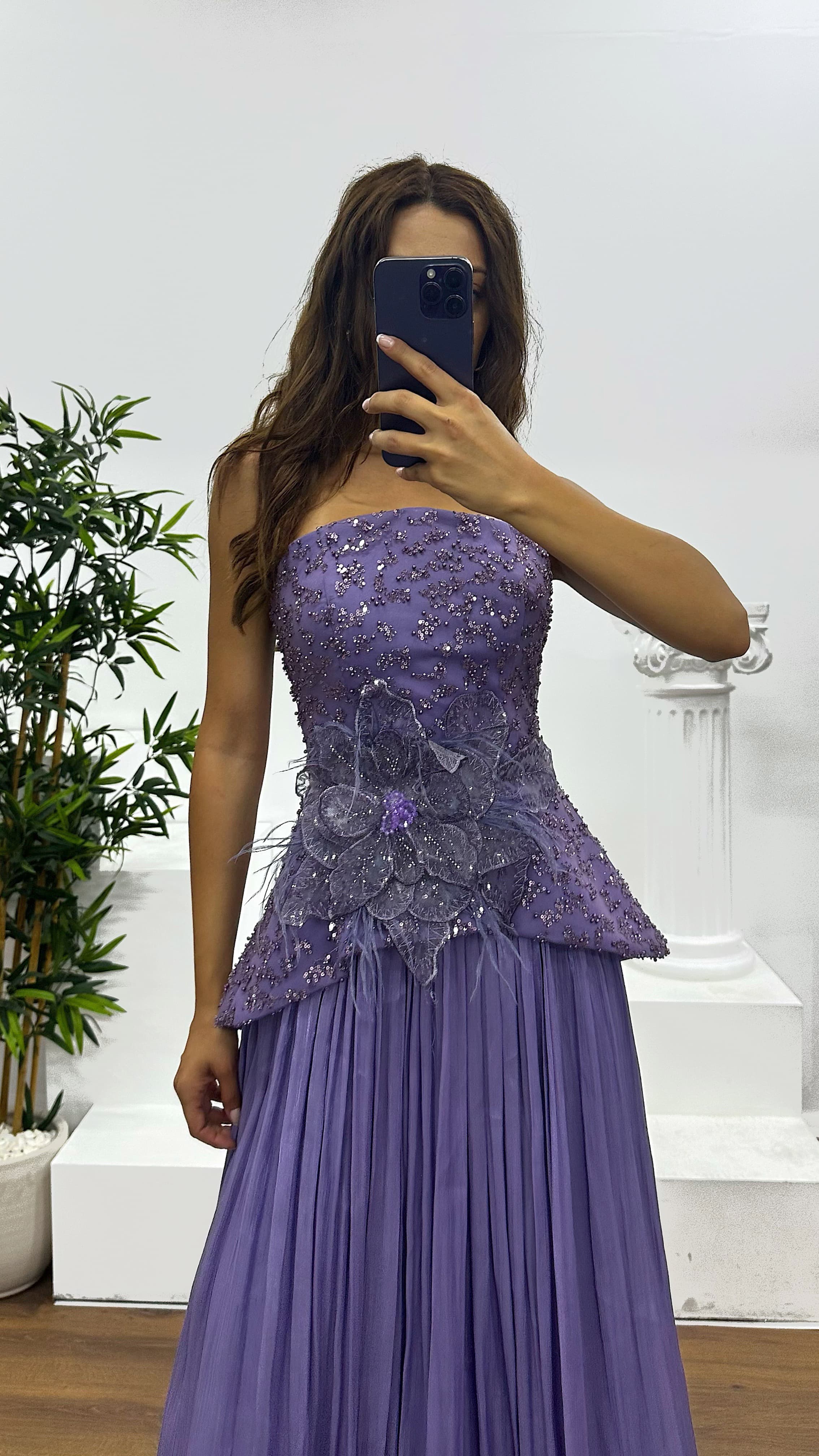• Lavanta Straplez Piliseli Abiye Elbise