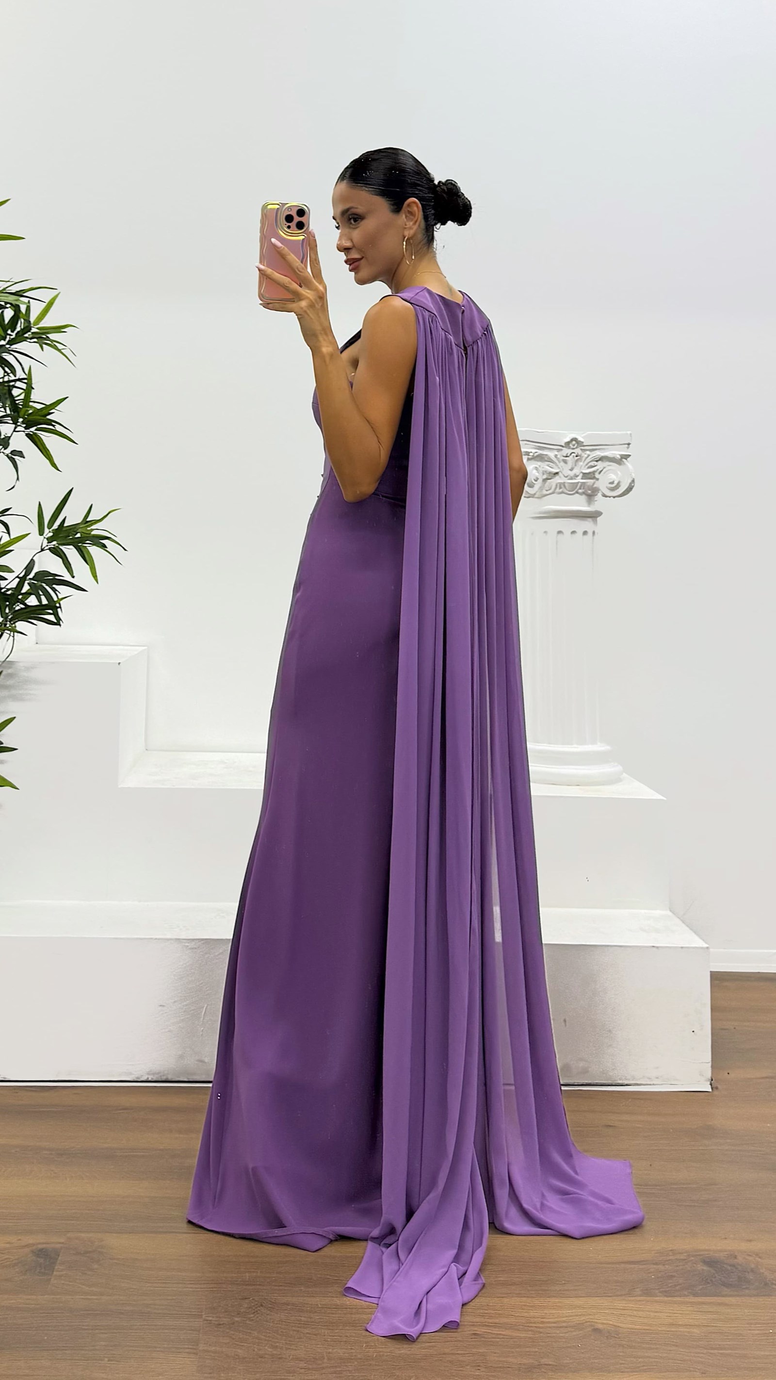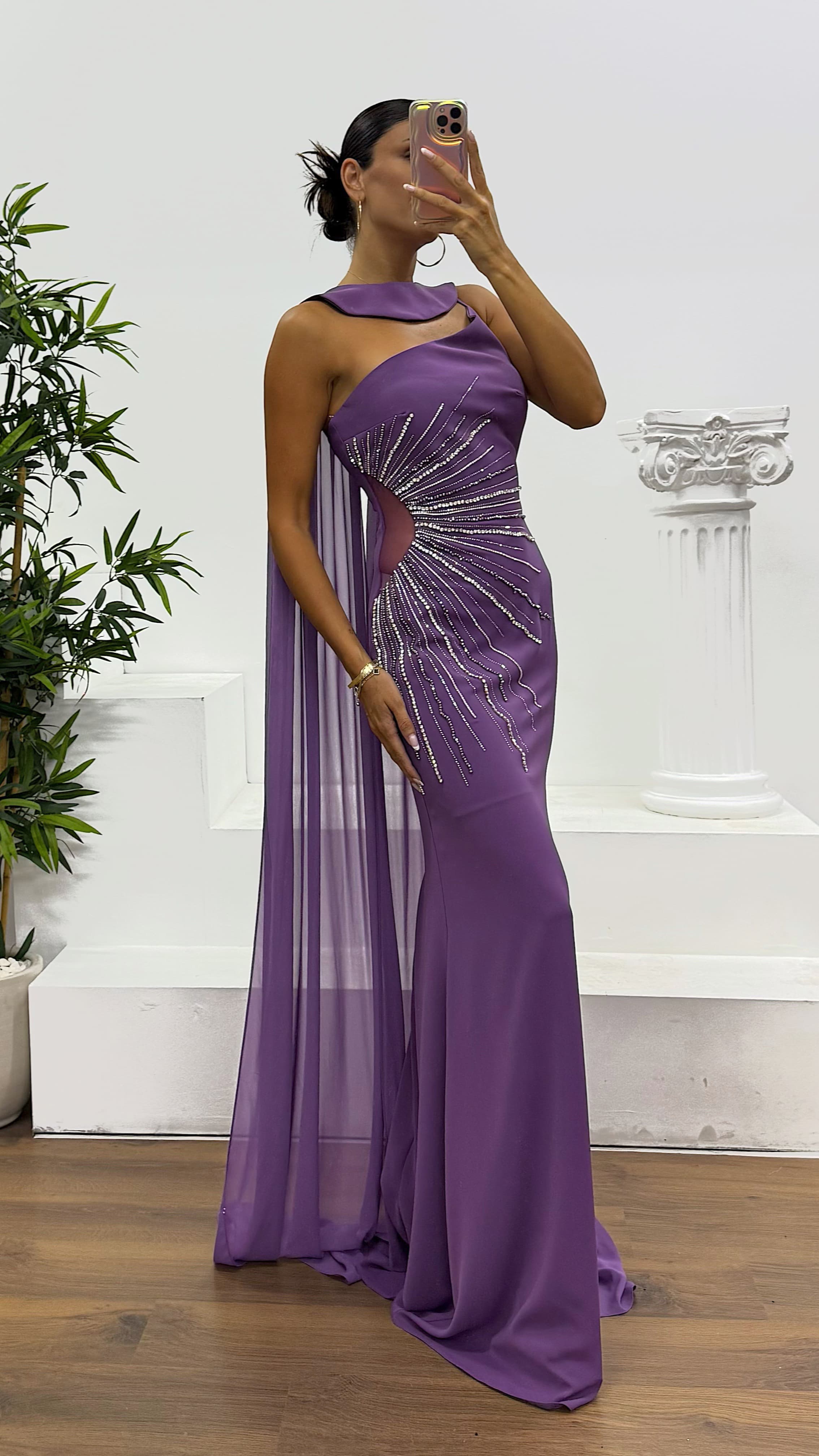 • Lavanta Tek Omuz Pelerinli Abiye Elbise