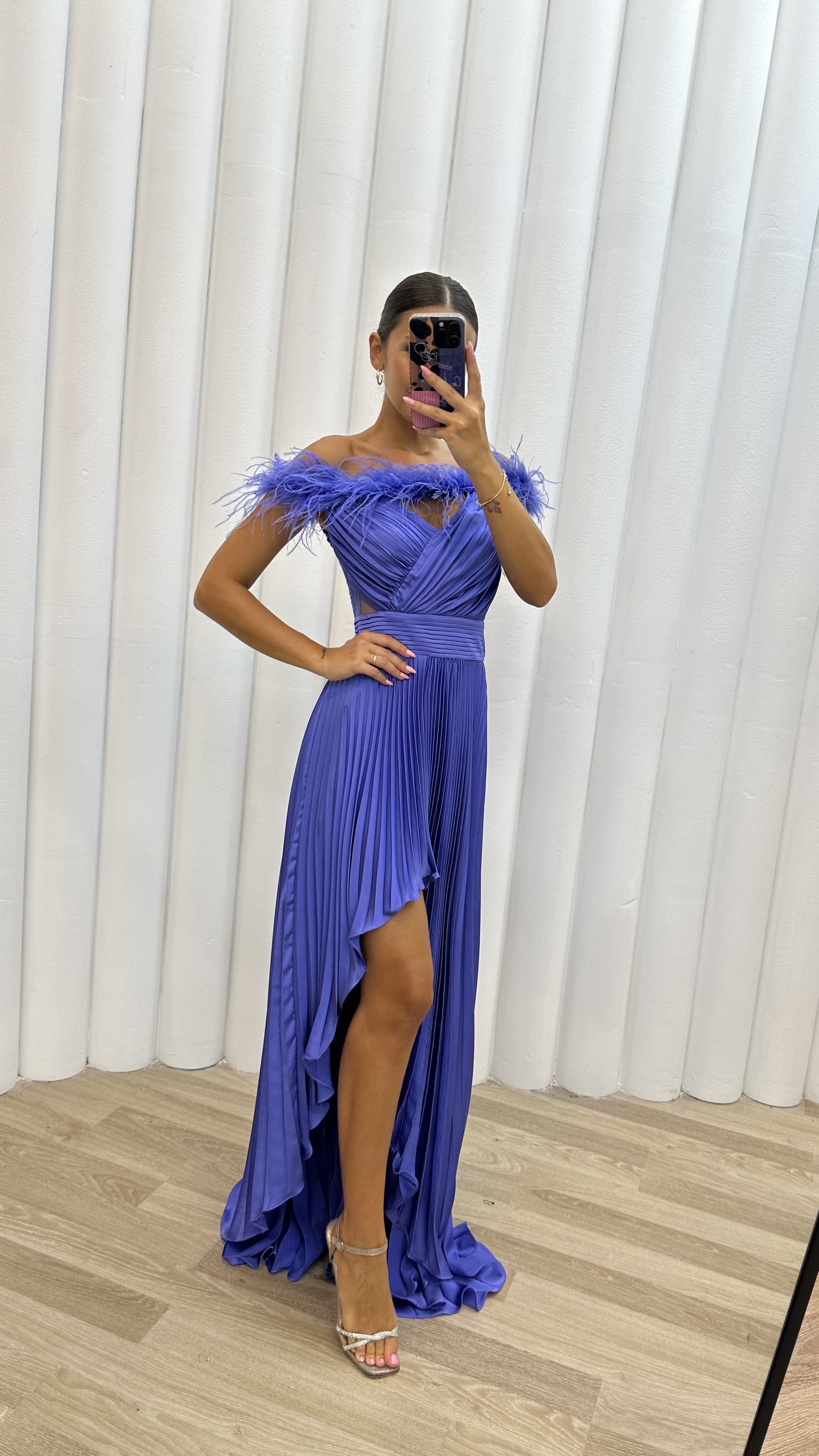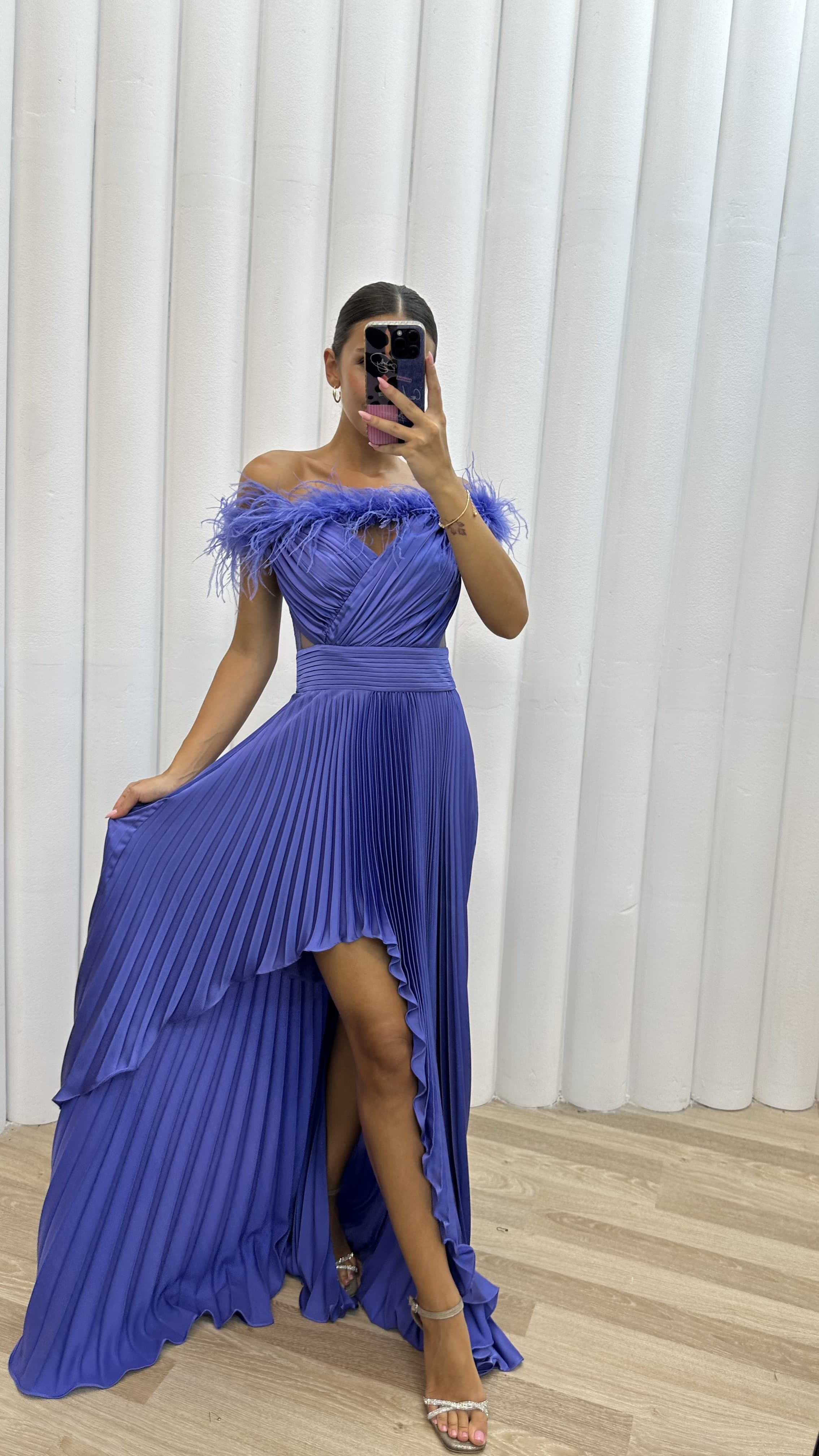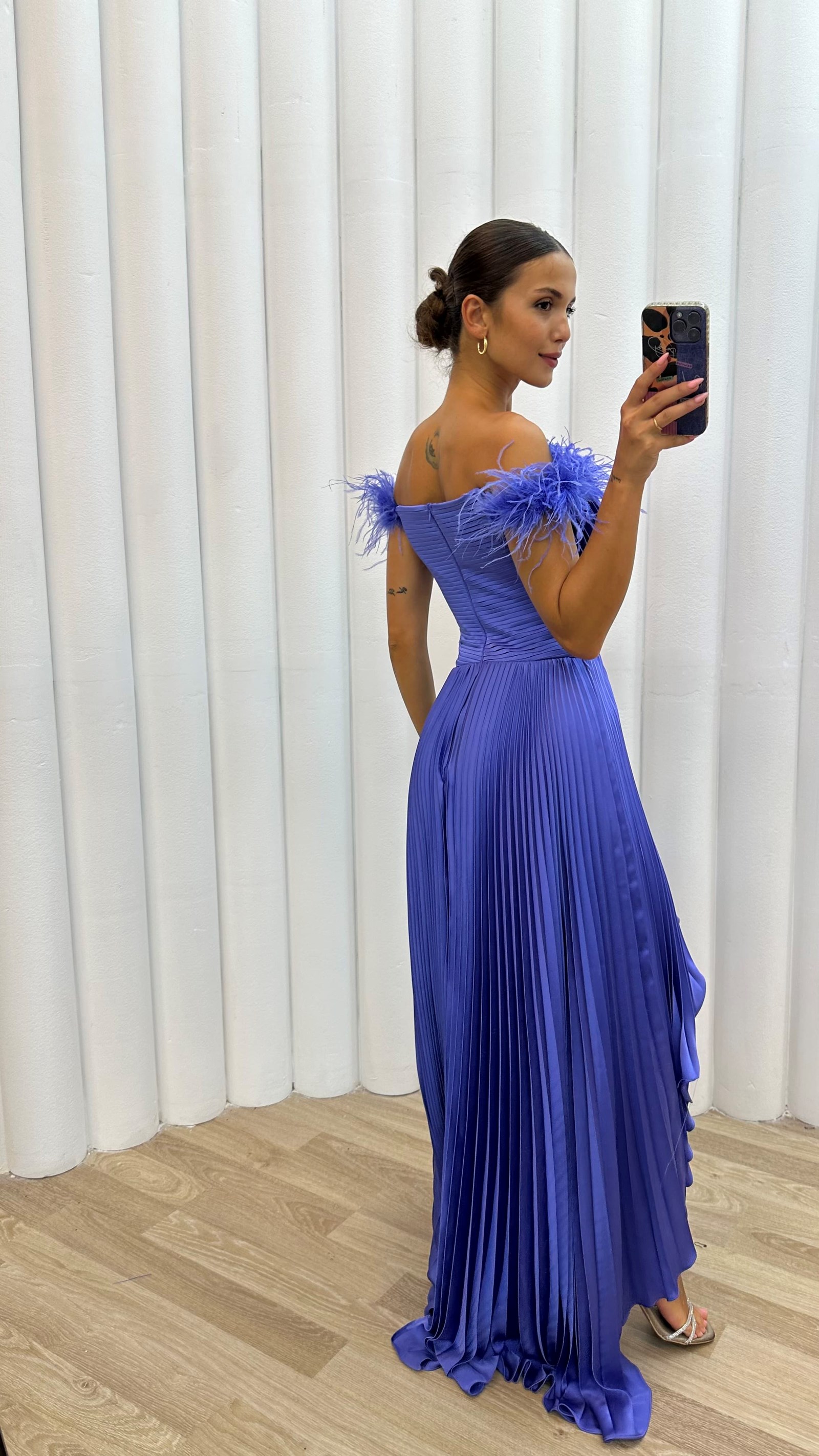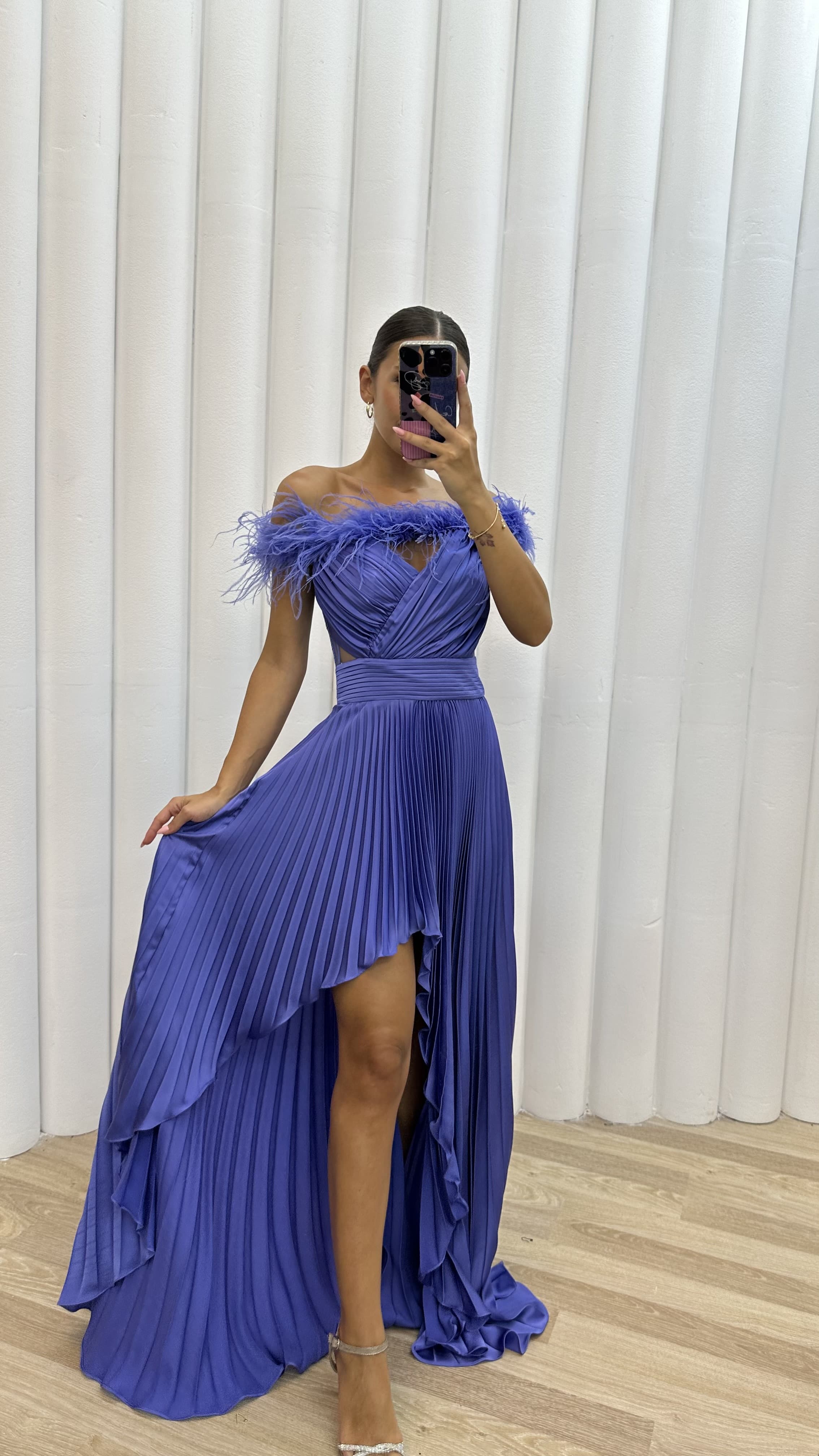 Lilas épaules plumes détail plissé satiné robe de soirée