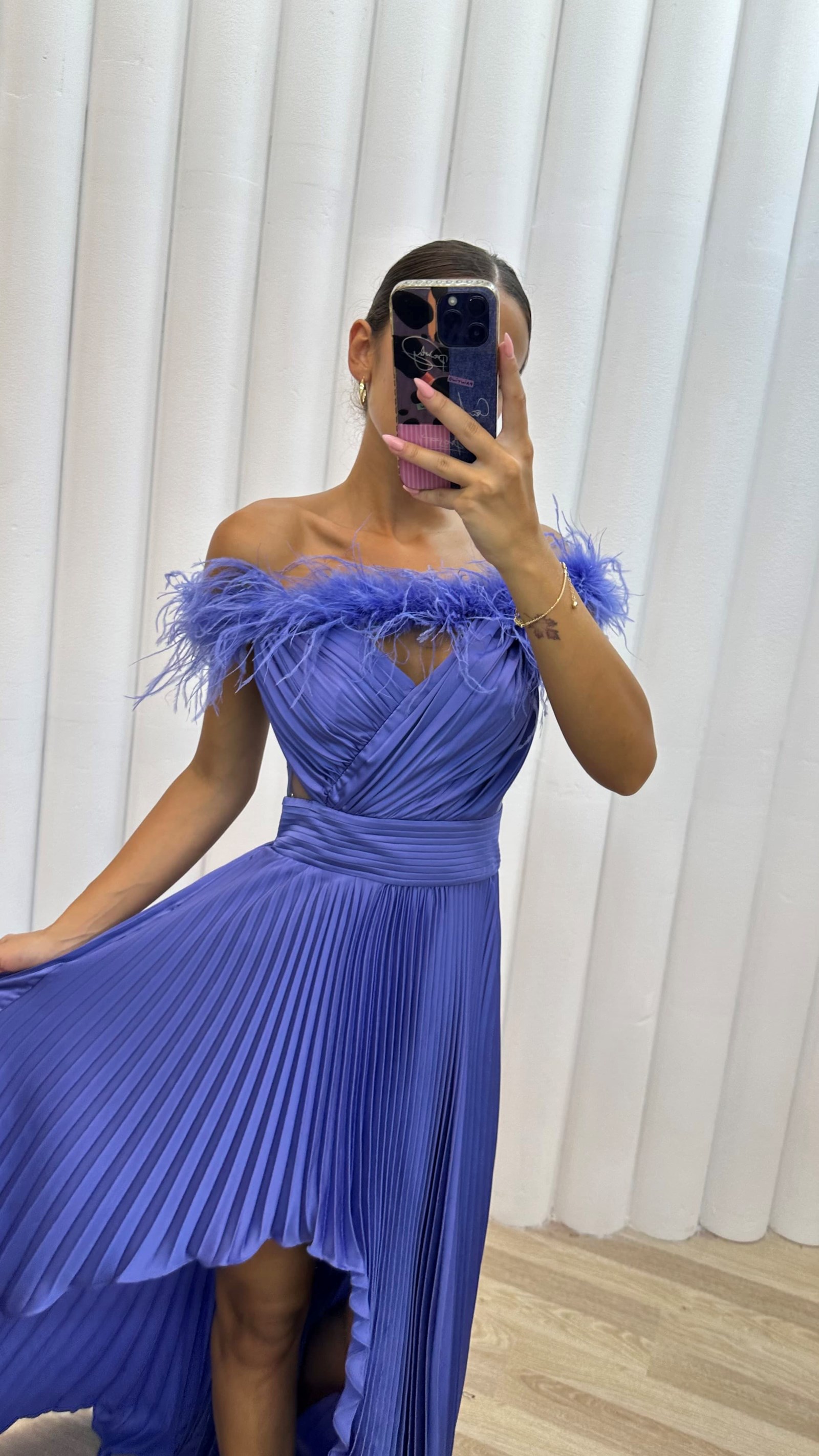 • Lilas épaules plumes détail plissé satiné robe de soirée