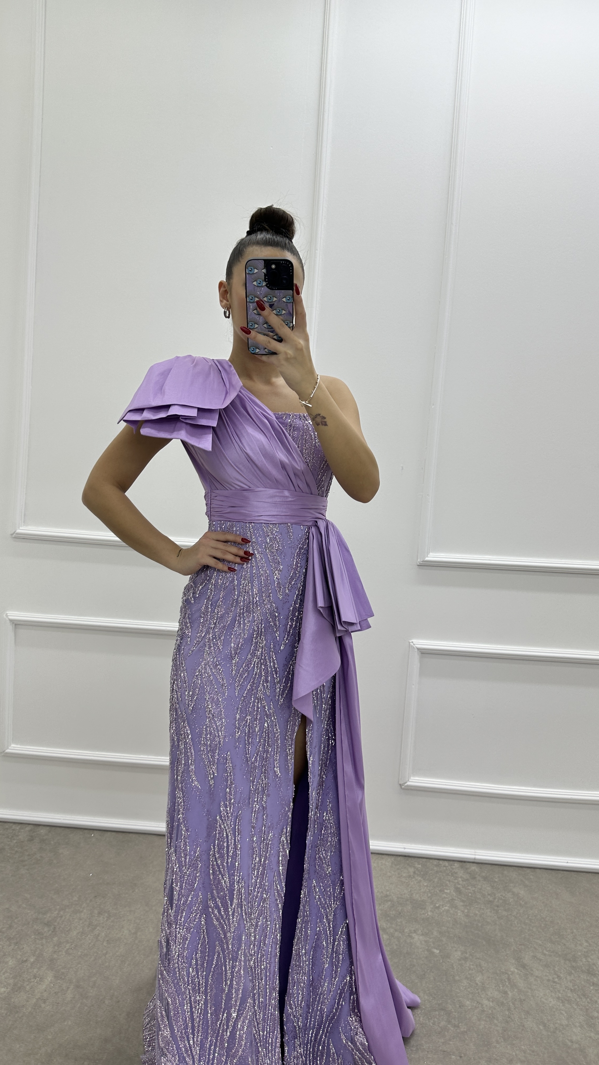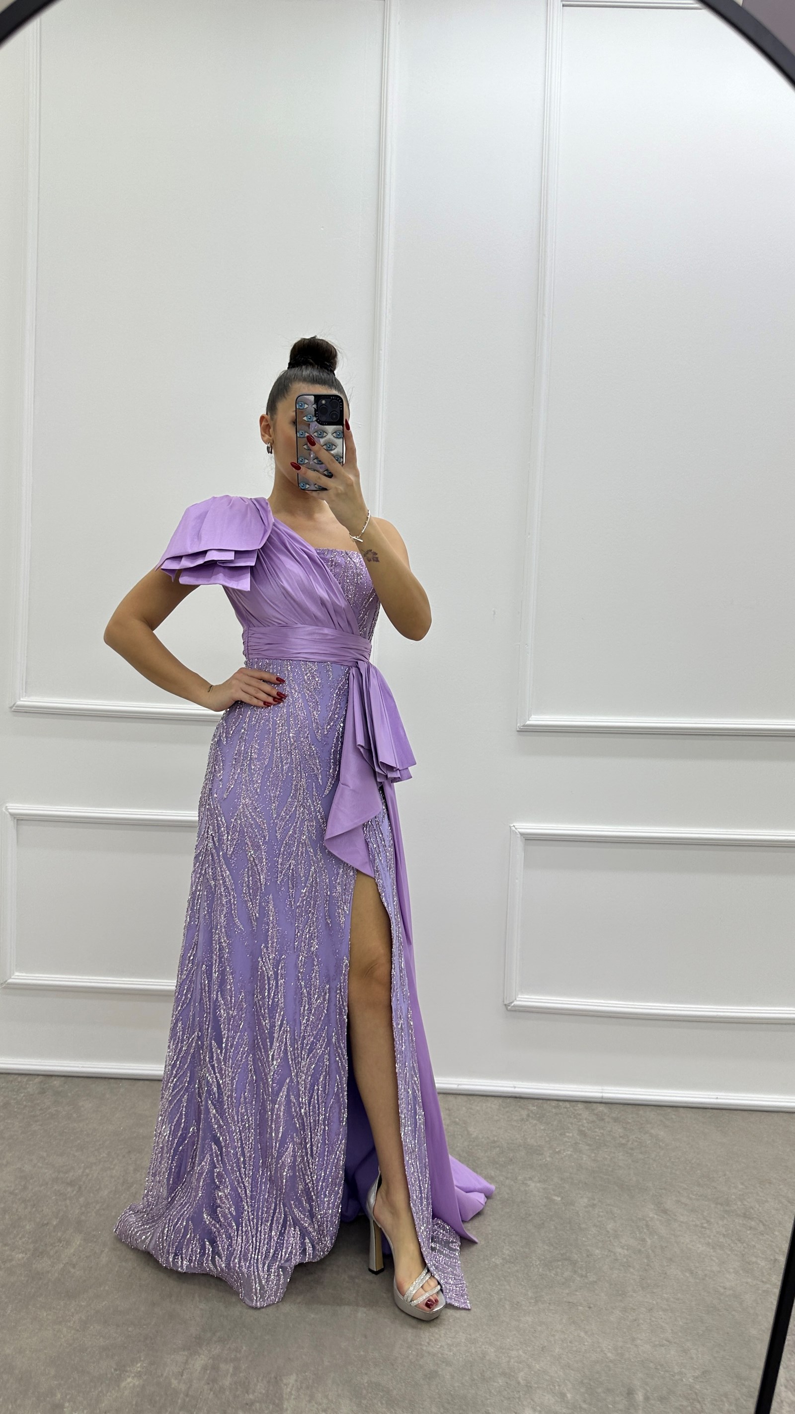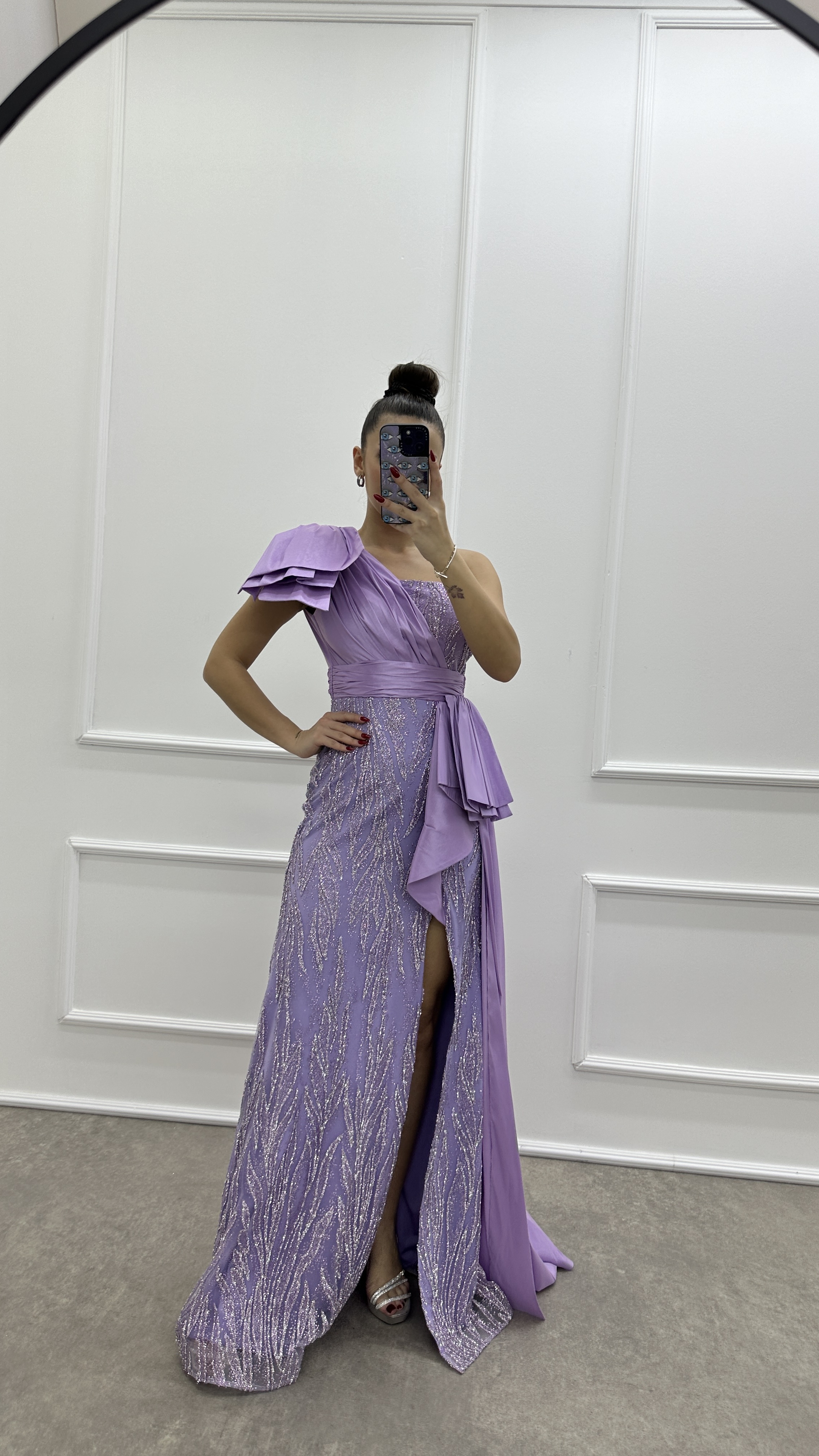 • Lila Tek Omuz Bel Detay İşlemeli Tasarım Abiye Elbise