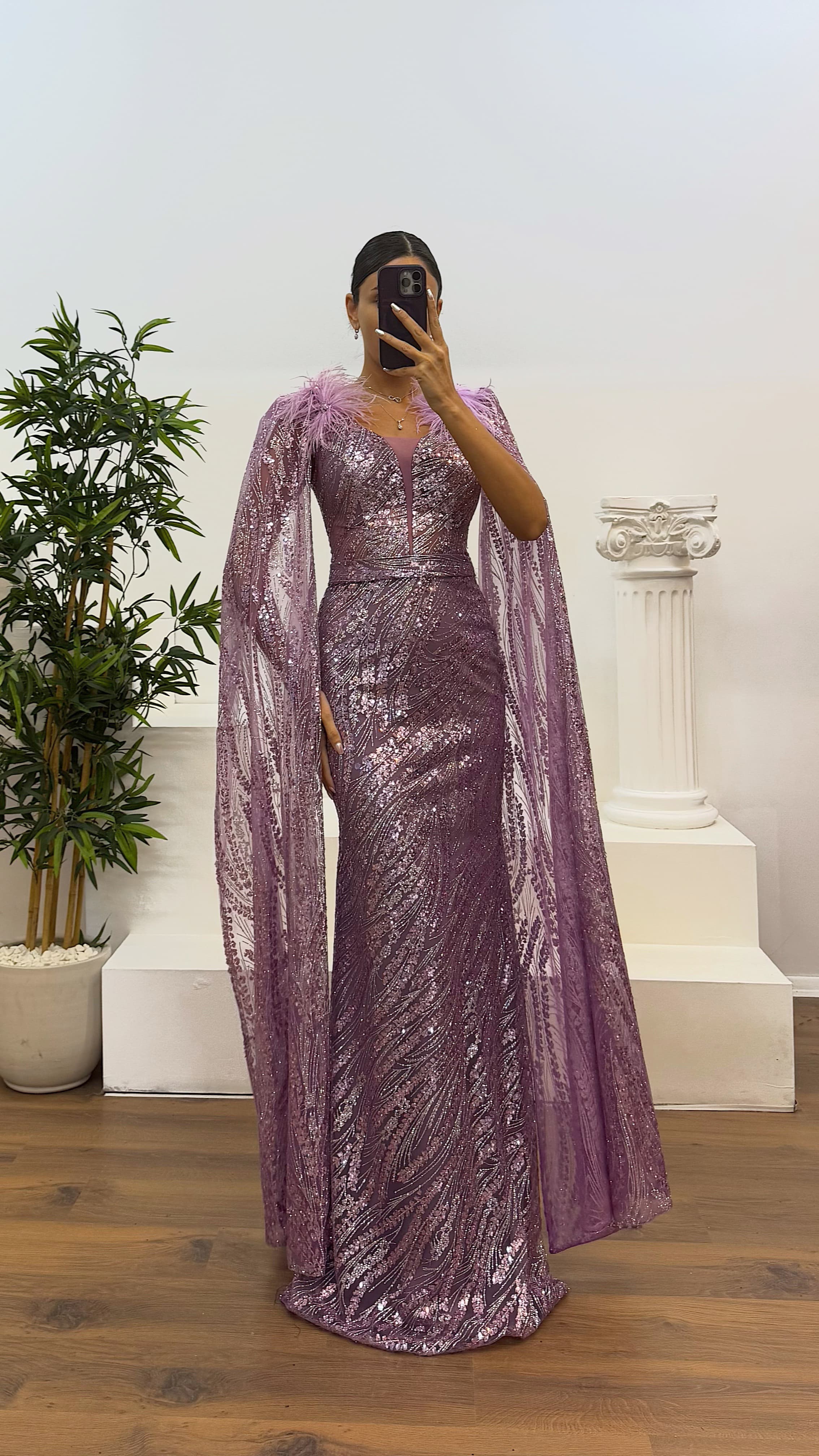 Robe de soirée avec détails en plumes Le produit est compatible avec les tailles 36-42, avec des coussinets de poitrine, doublé, fermeture à l'arrière avec une fermeture éclair, conçu comme une robe de soirée pailletée. Longueur du produit : Peut varier entre 165-170 cm. Type de tissu : Tulle pailleté, 3% Lycra, 97% Polyester.