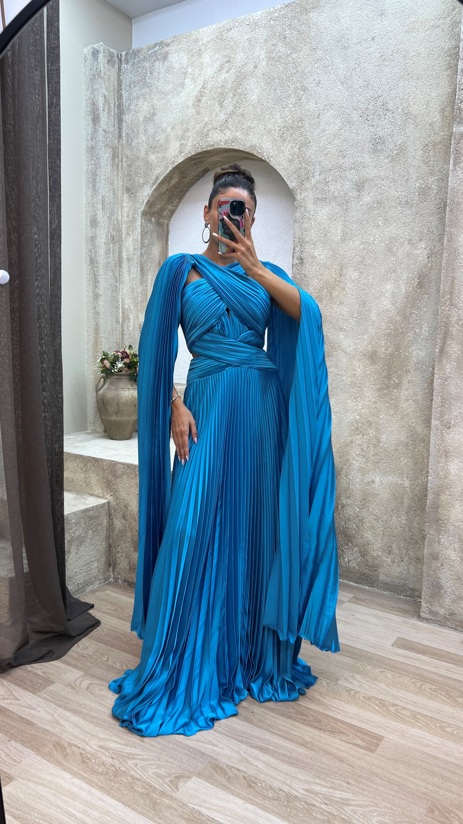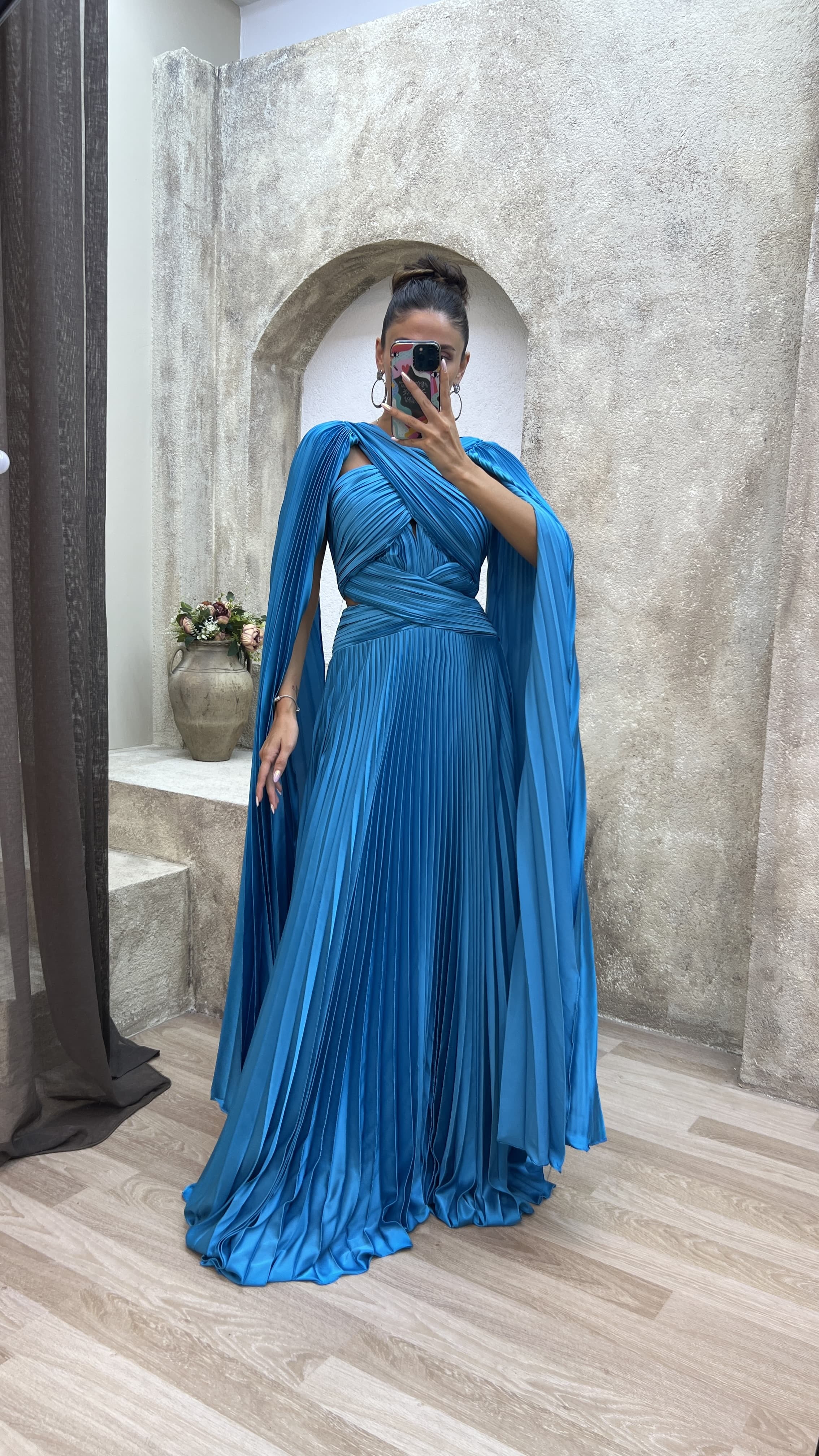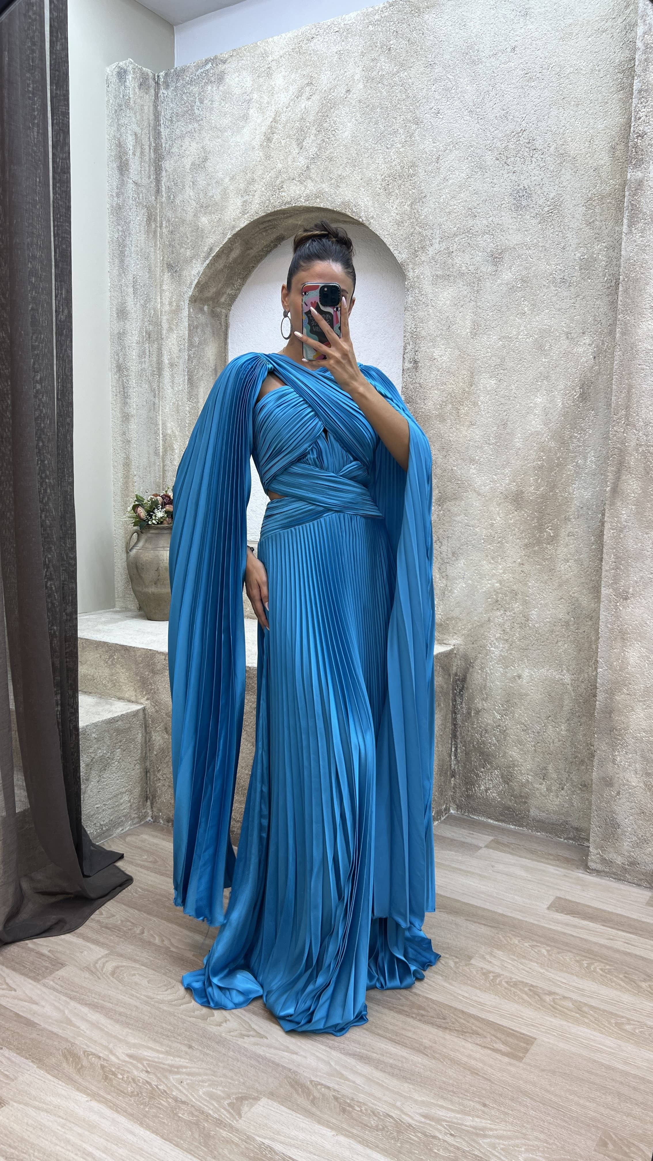 • Mavi Çapraz Detay Pliseli  Saten Abiye Elbise