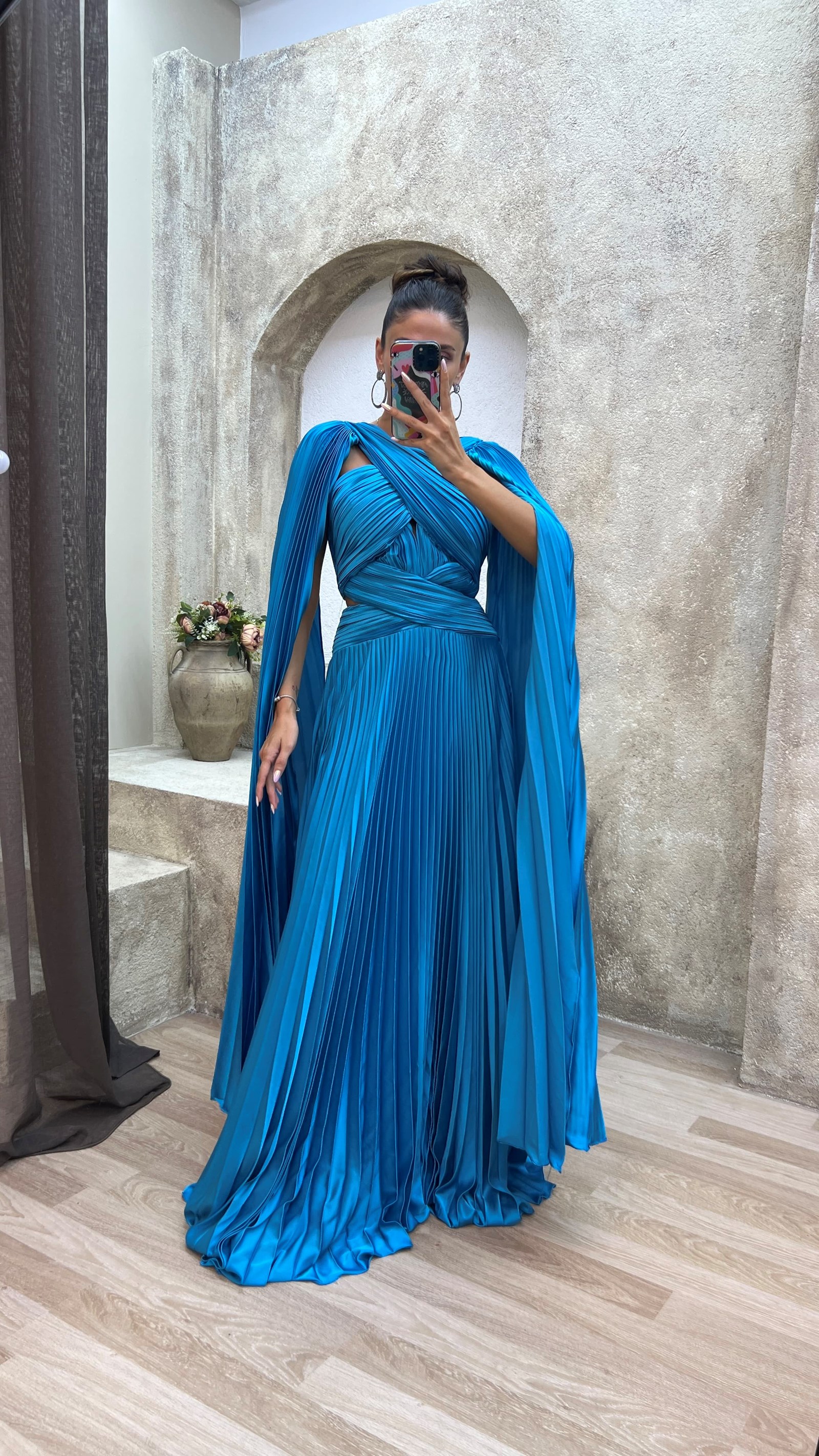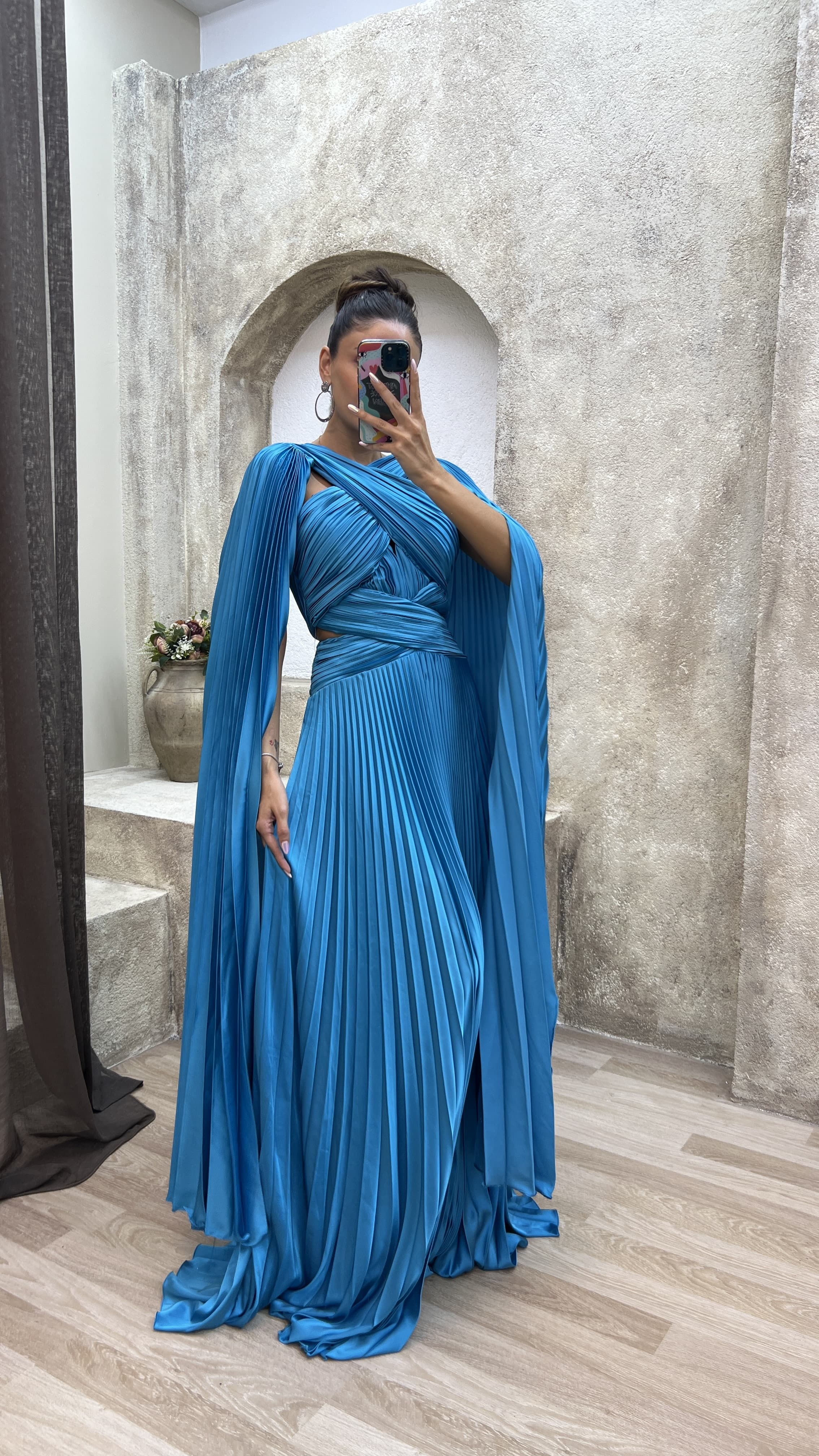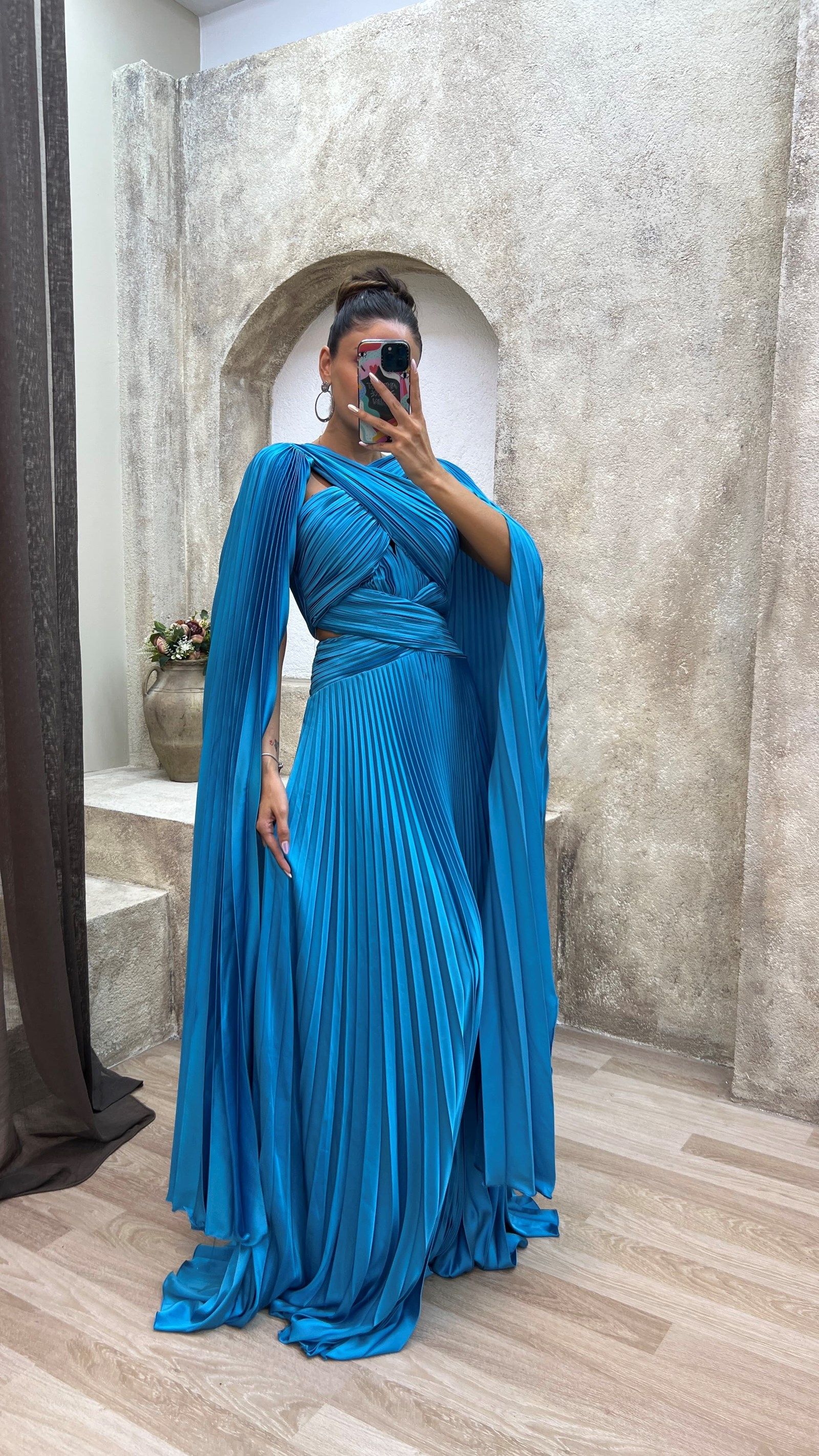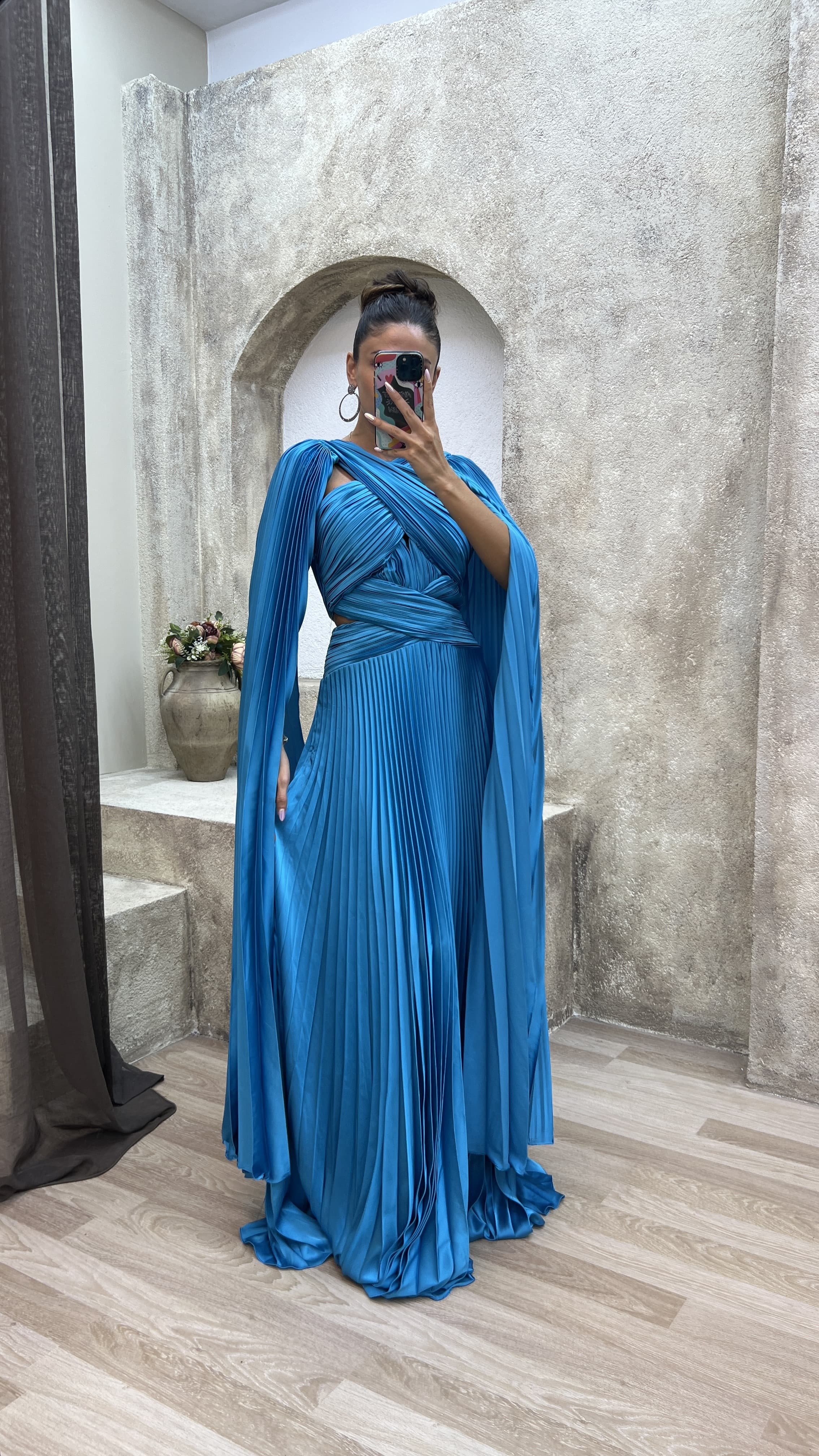 • Mavi Çapraz Detay Pliseli  Saten Abiye Elbise