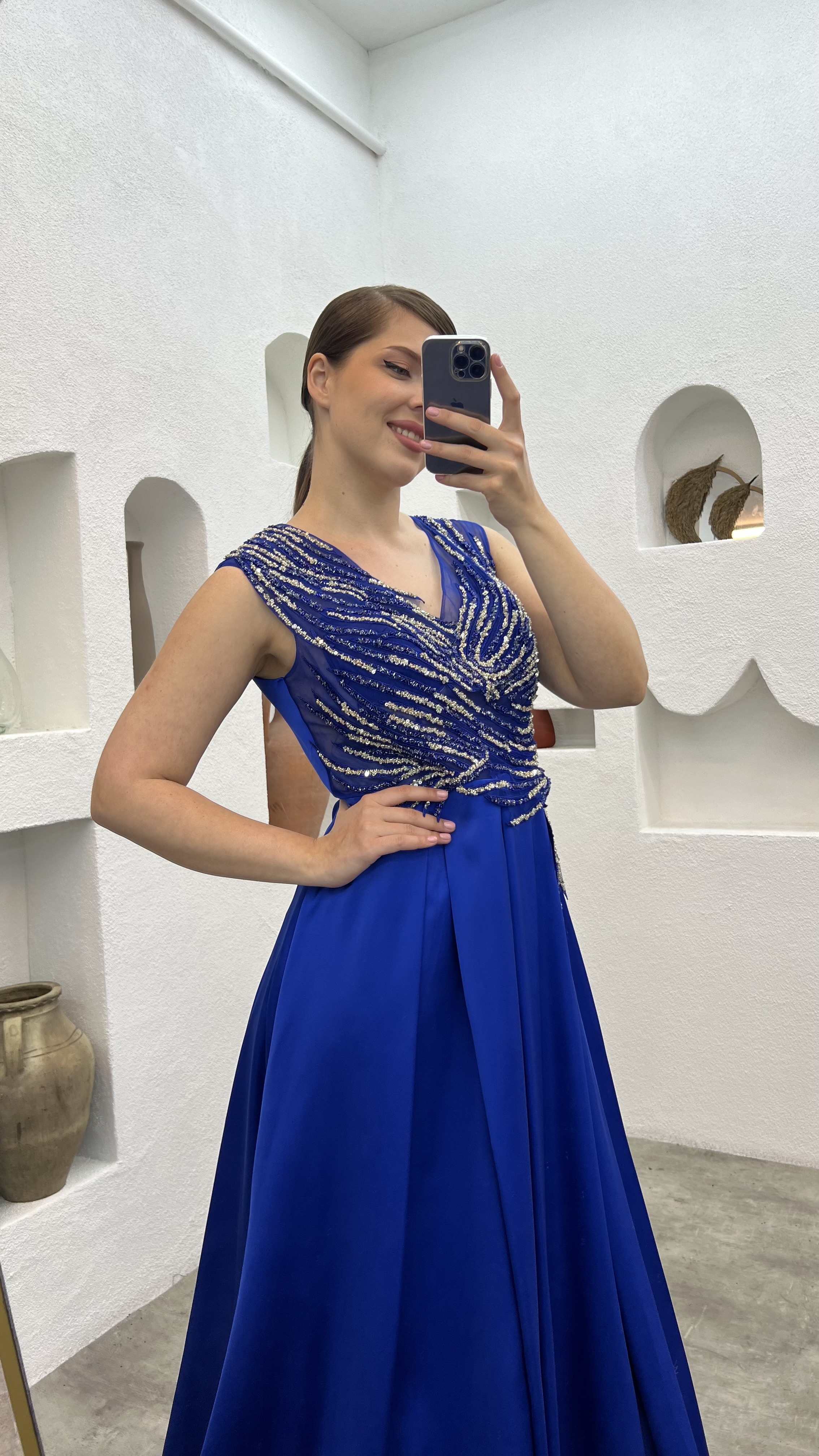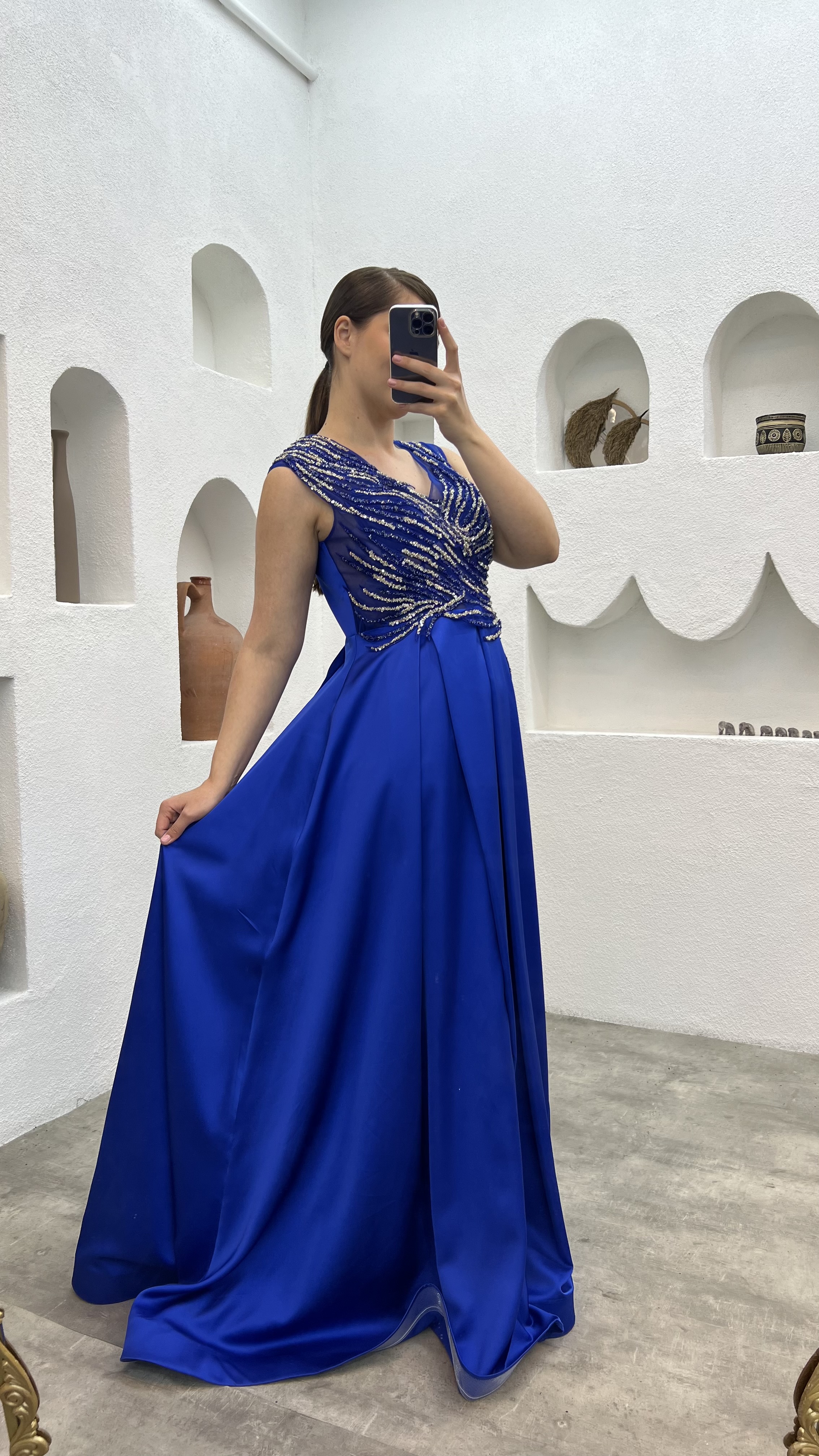 • Mavi İşlemeli Büyük Beden Abiye Elbise