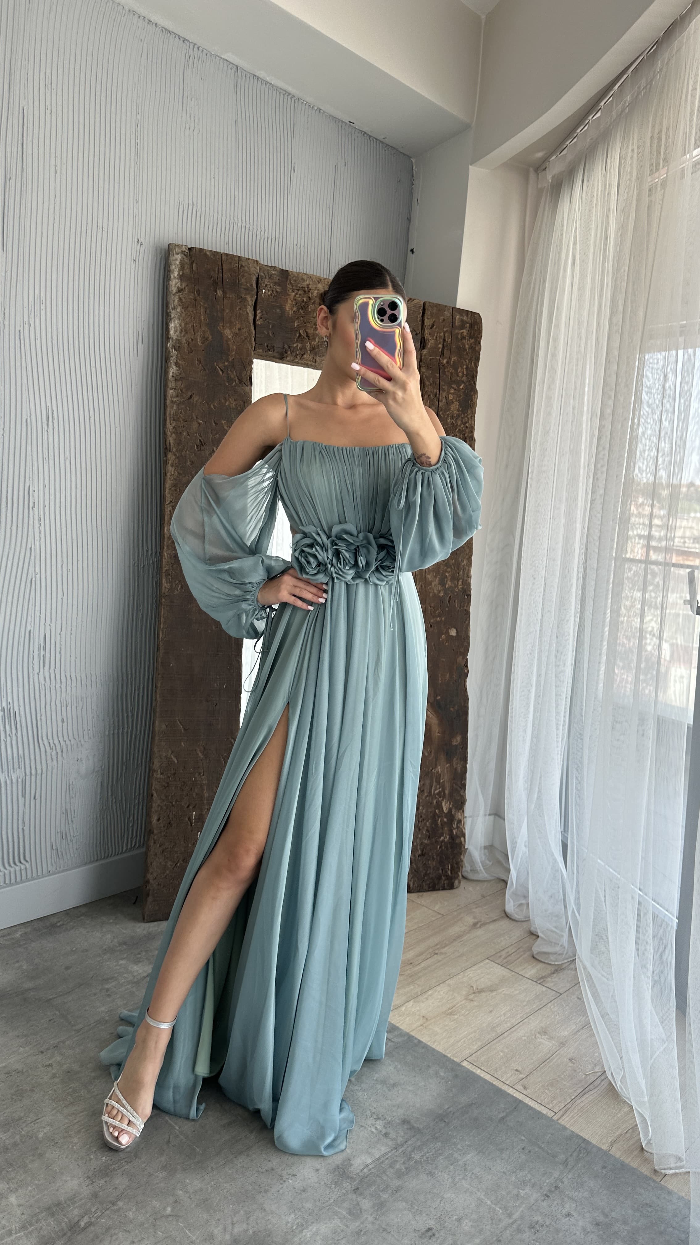 • Mint Yeşili İp Askılı Balon Bel Detay Tasarım Şifon Elbise
