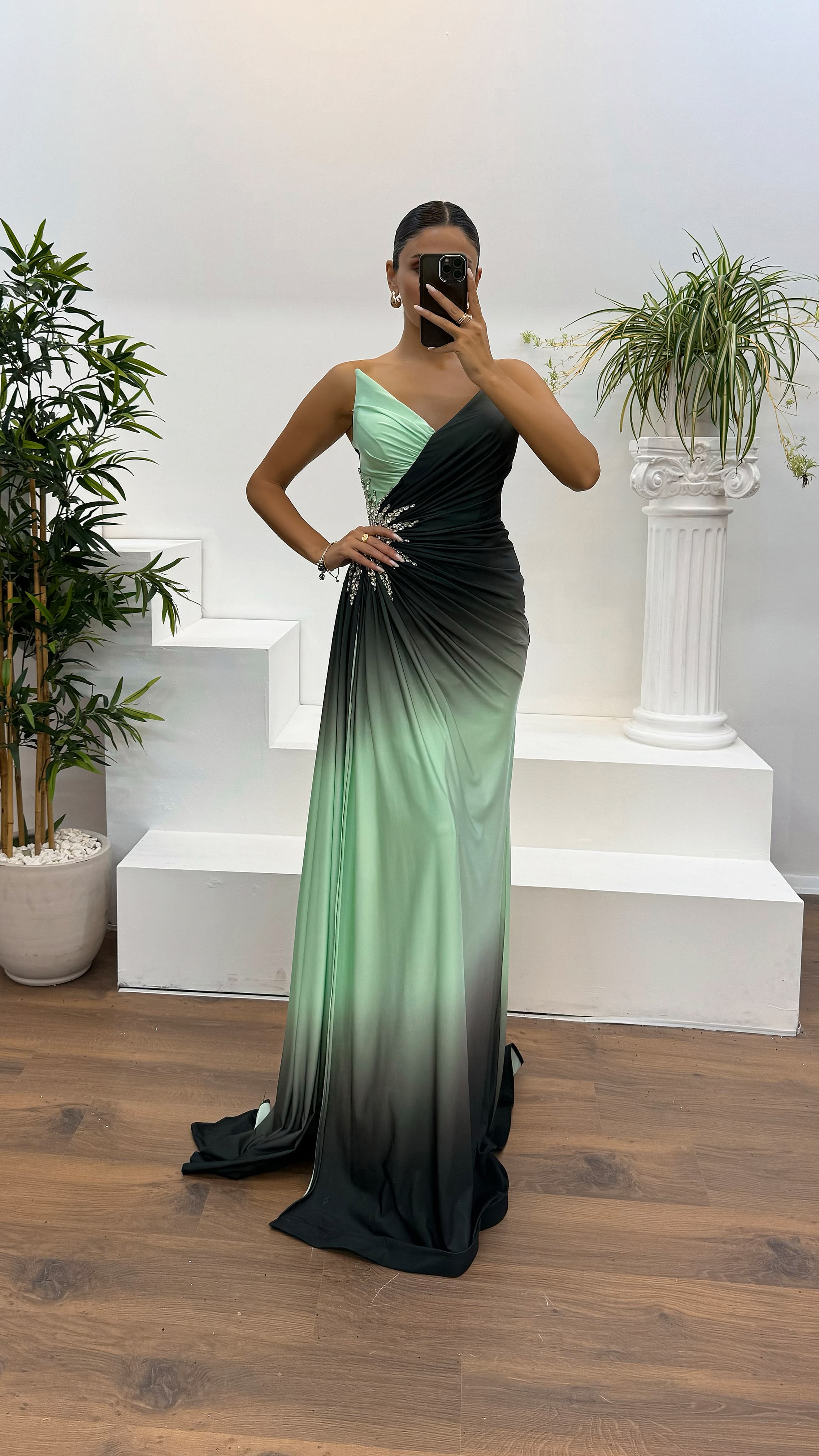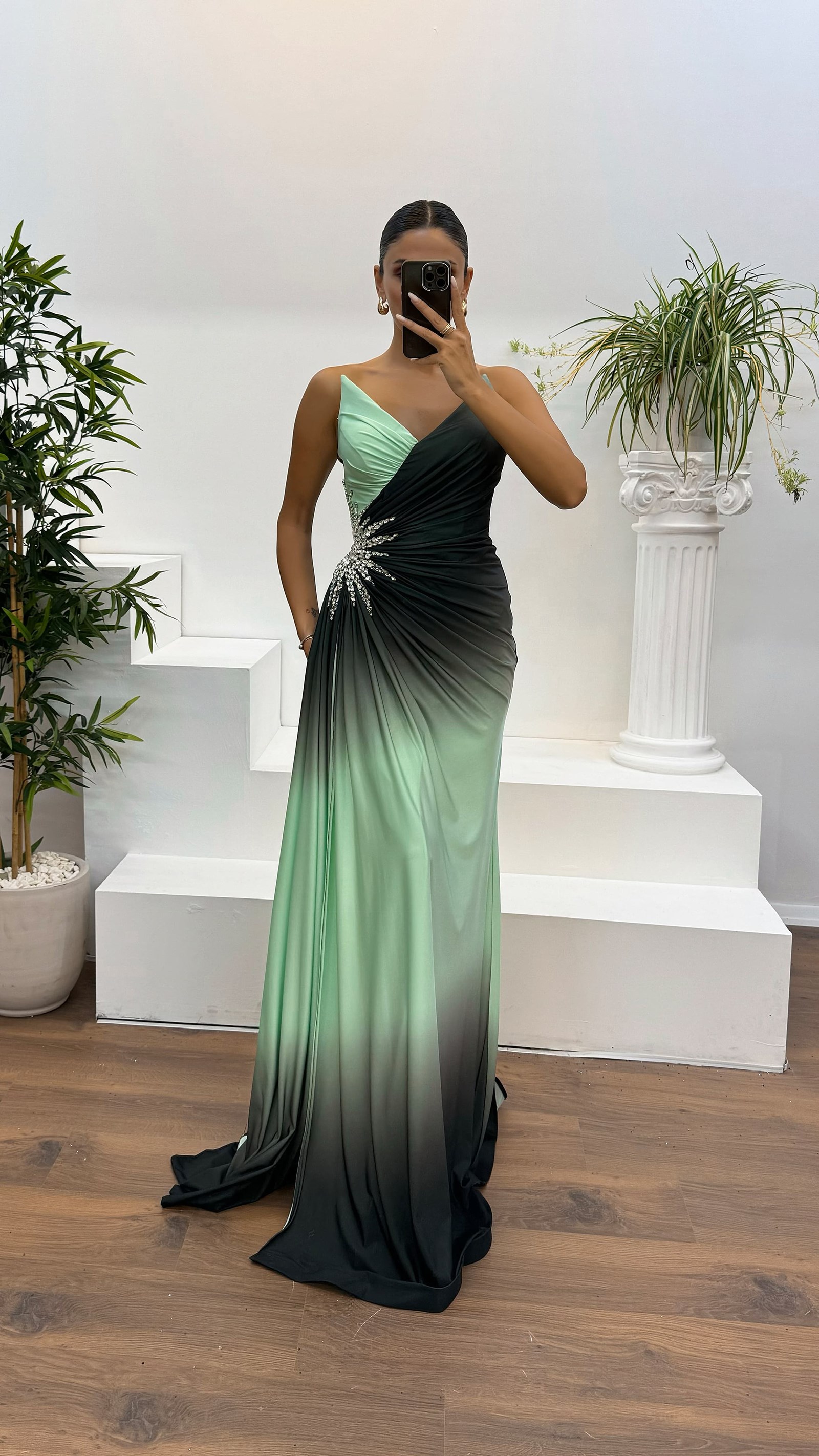 • Yeşil Straplez Bel İşleme Detay Abiye Elbise
