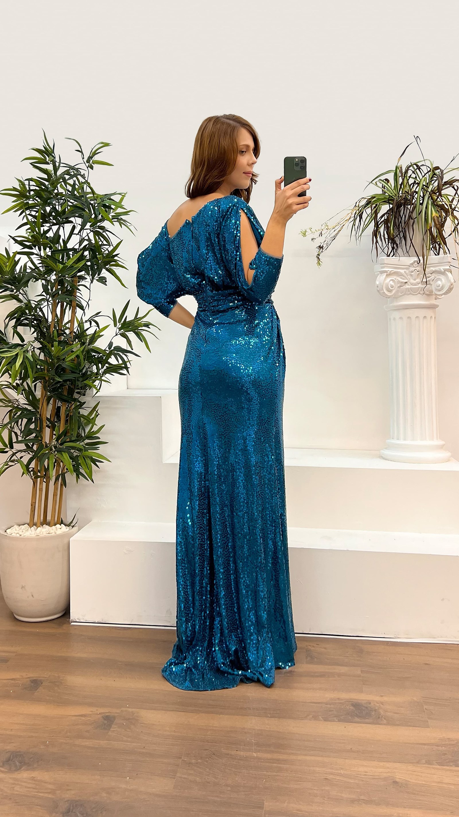 • Petrol Kayık Yaka Pul Payet Büyük Beden Abiye Elbise