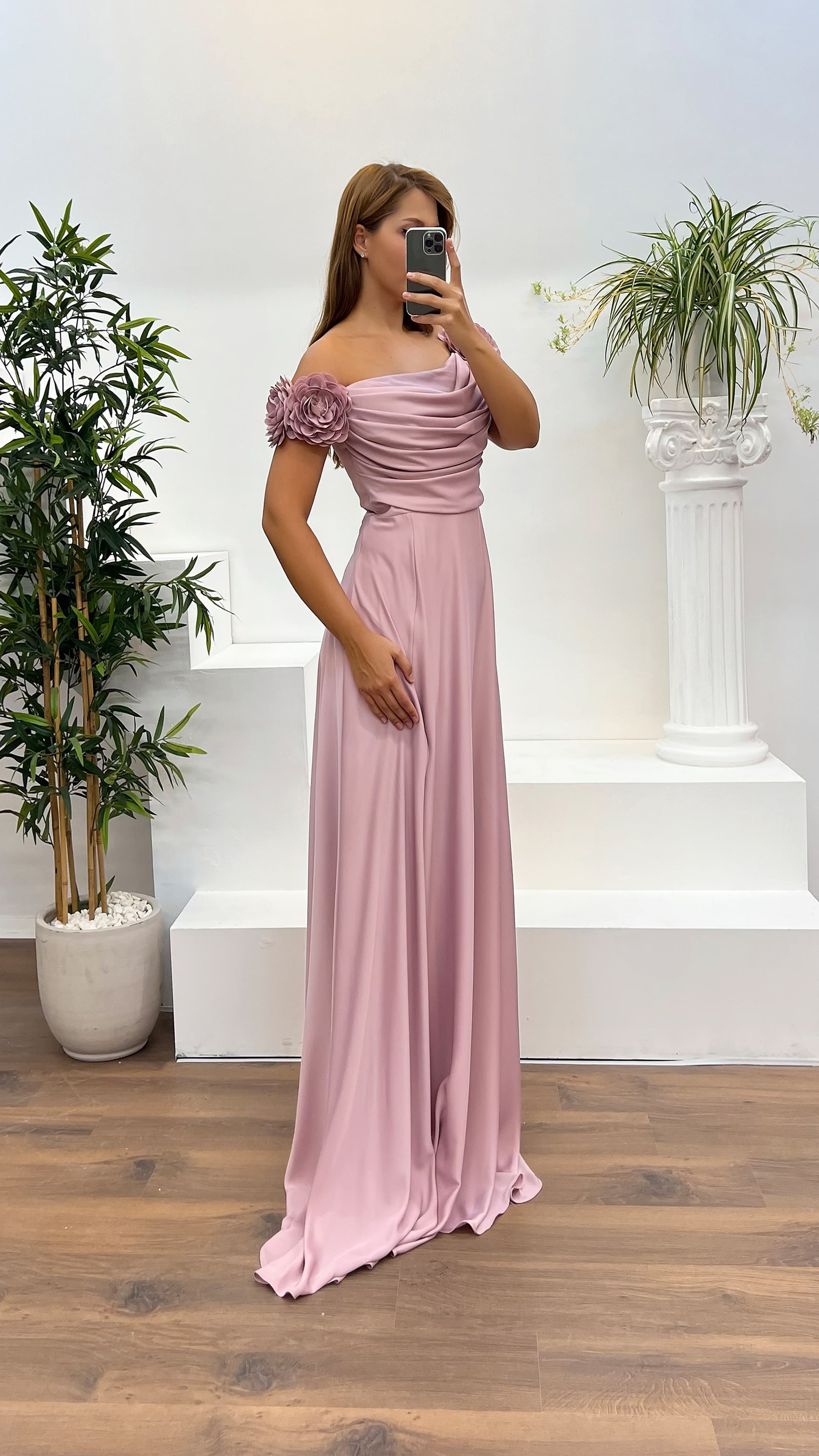 • Pudra Kayık Yaka Gül Detay Büyük Beden Abiye Elbise