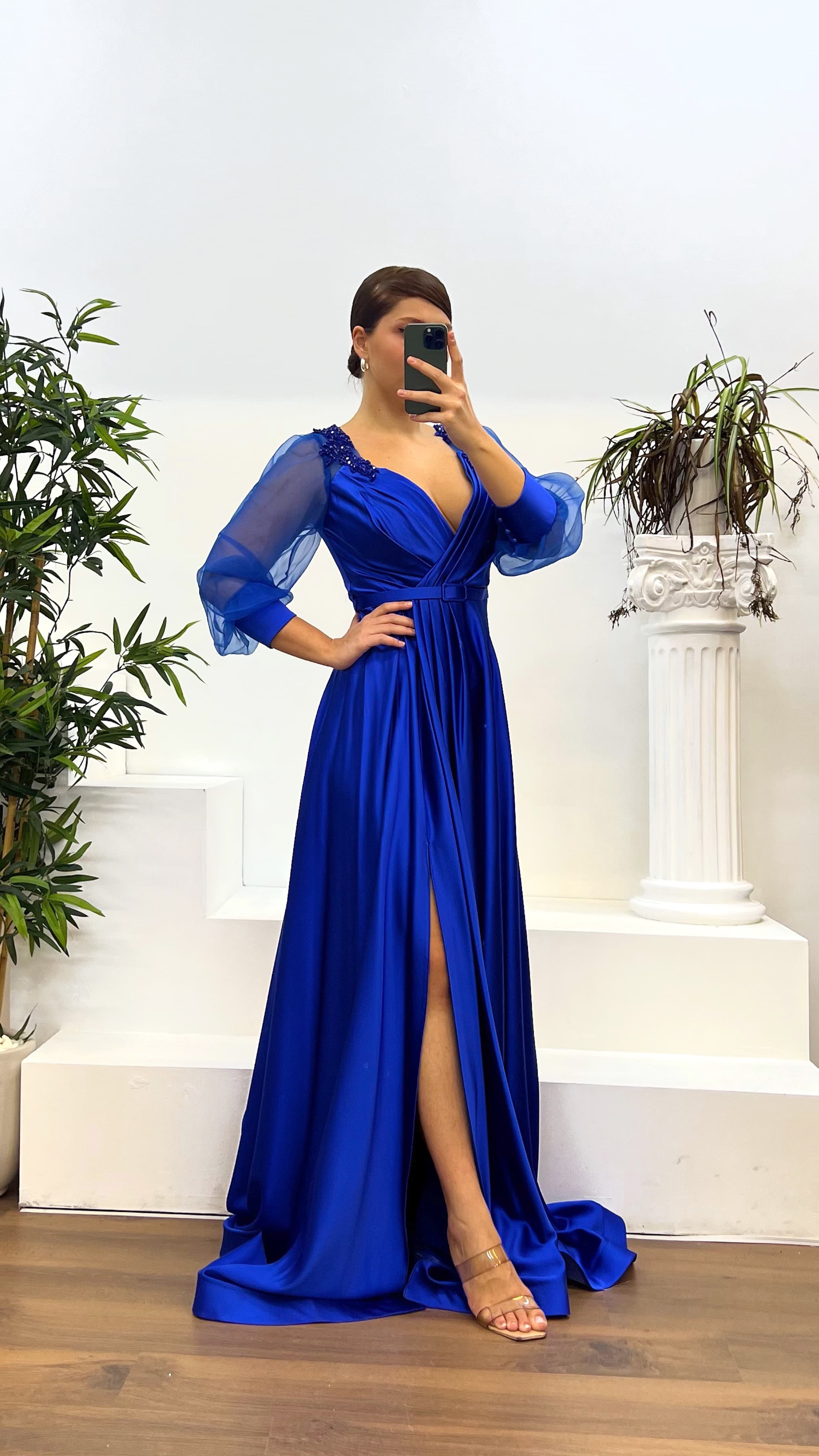 • Saks Balon Kol İşleme Omuzları İşlemeli Tasarım Büyük Beden Abiye Elbise