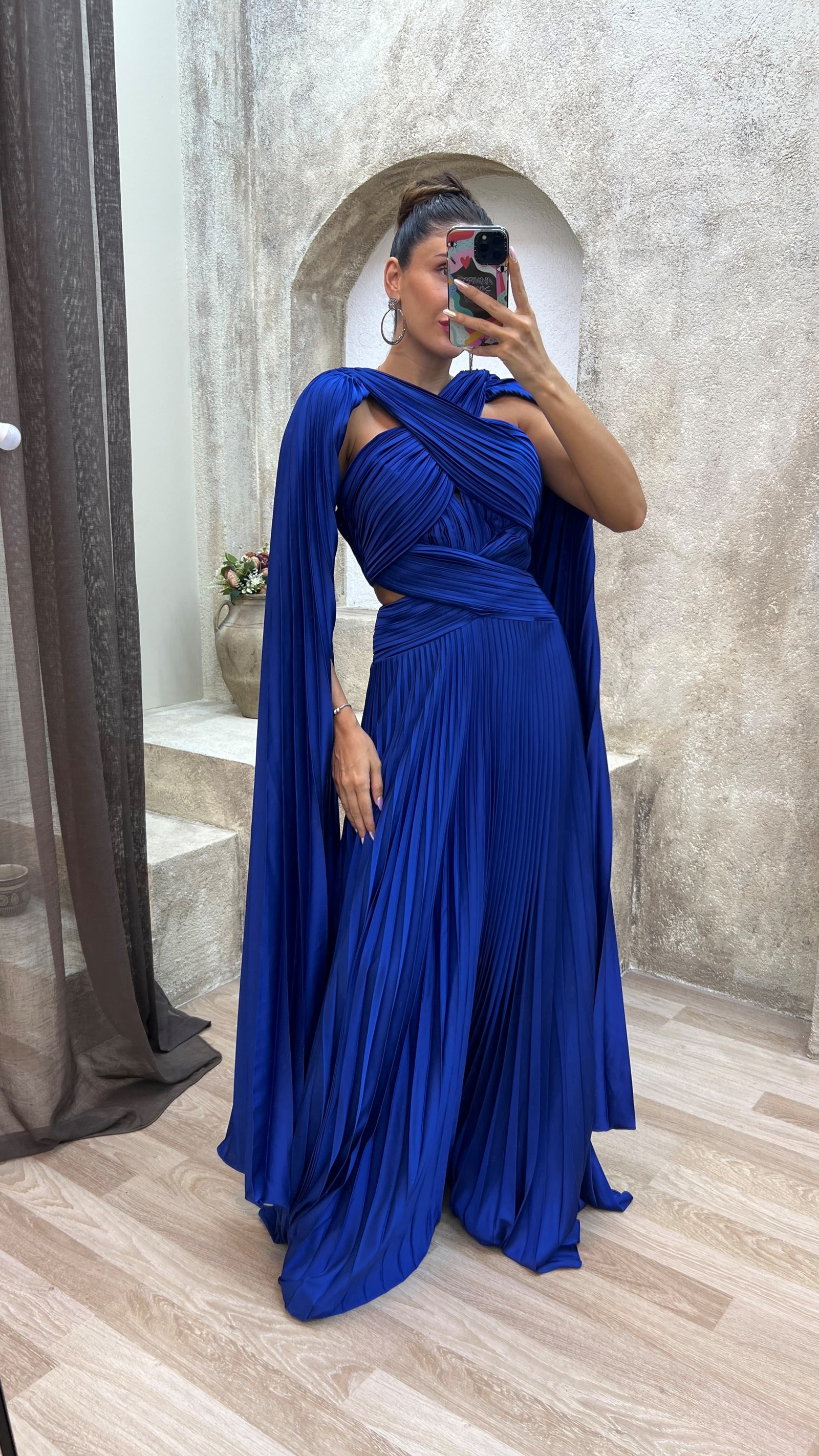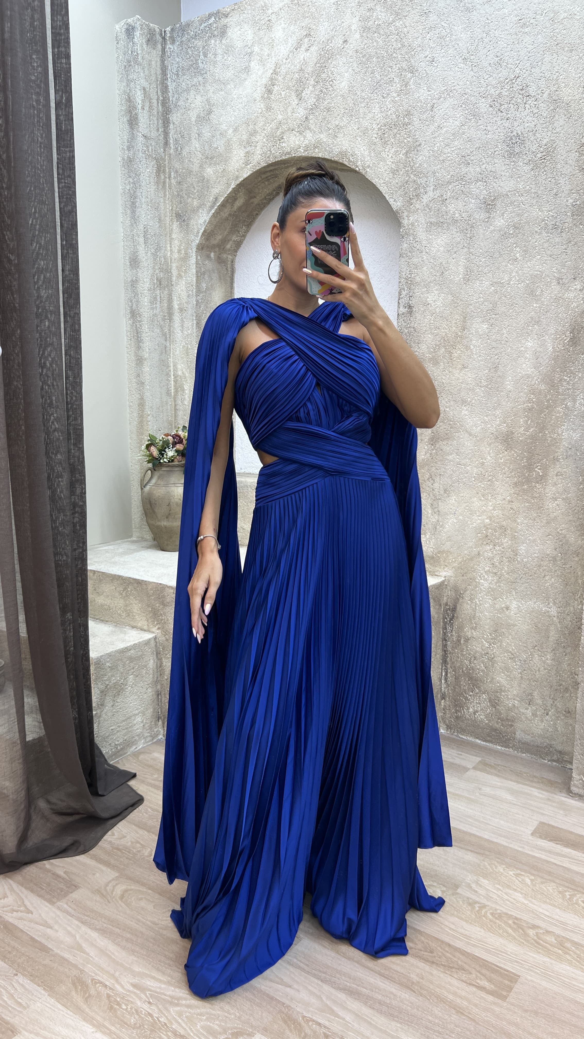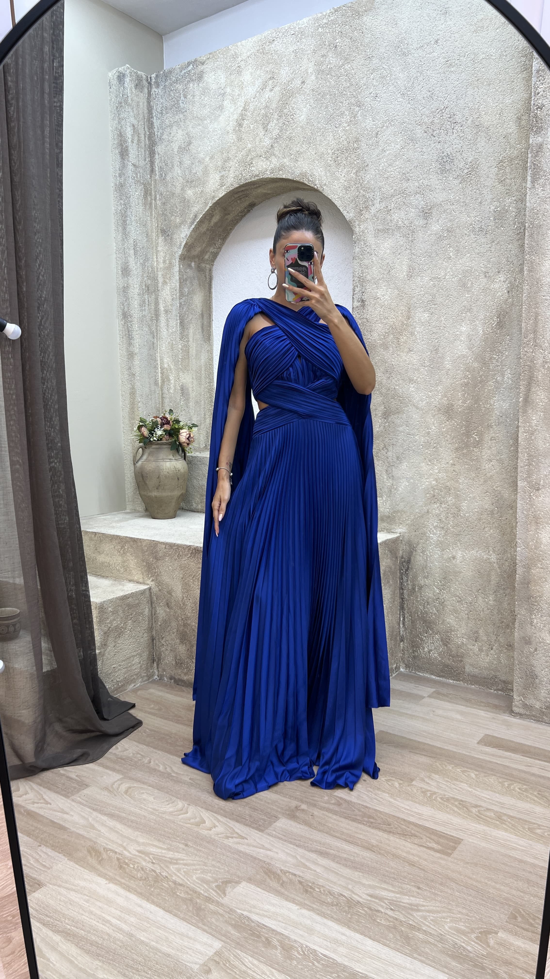 • Mavi Çapraz Detay Pliseli  Saten Abiye Elbise