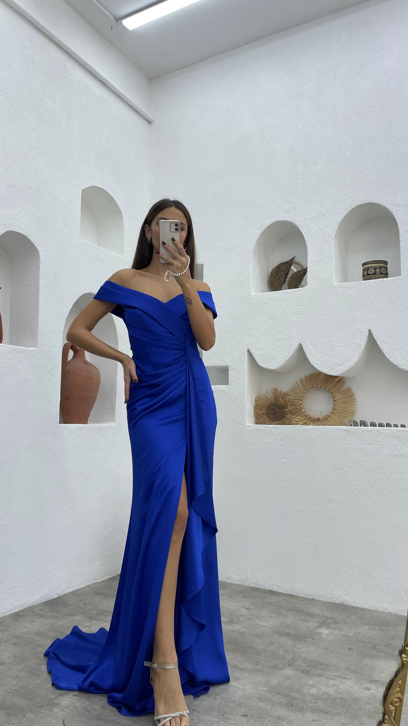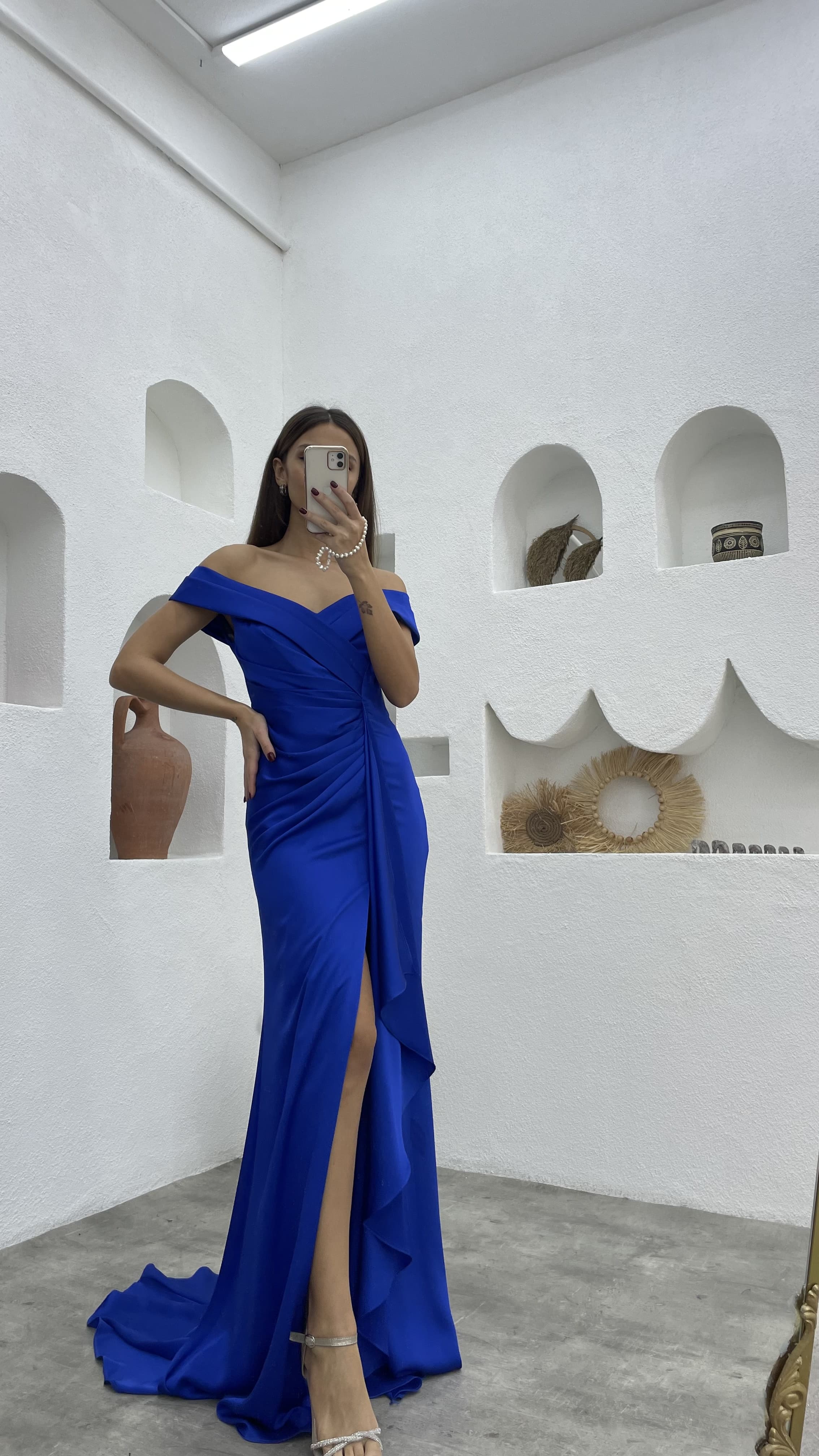 Saks Drapeli Büzgülü Saten Abiye Elbise