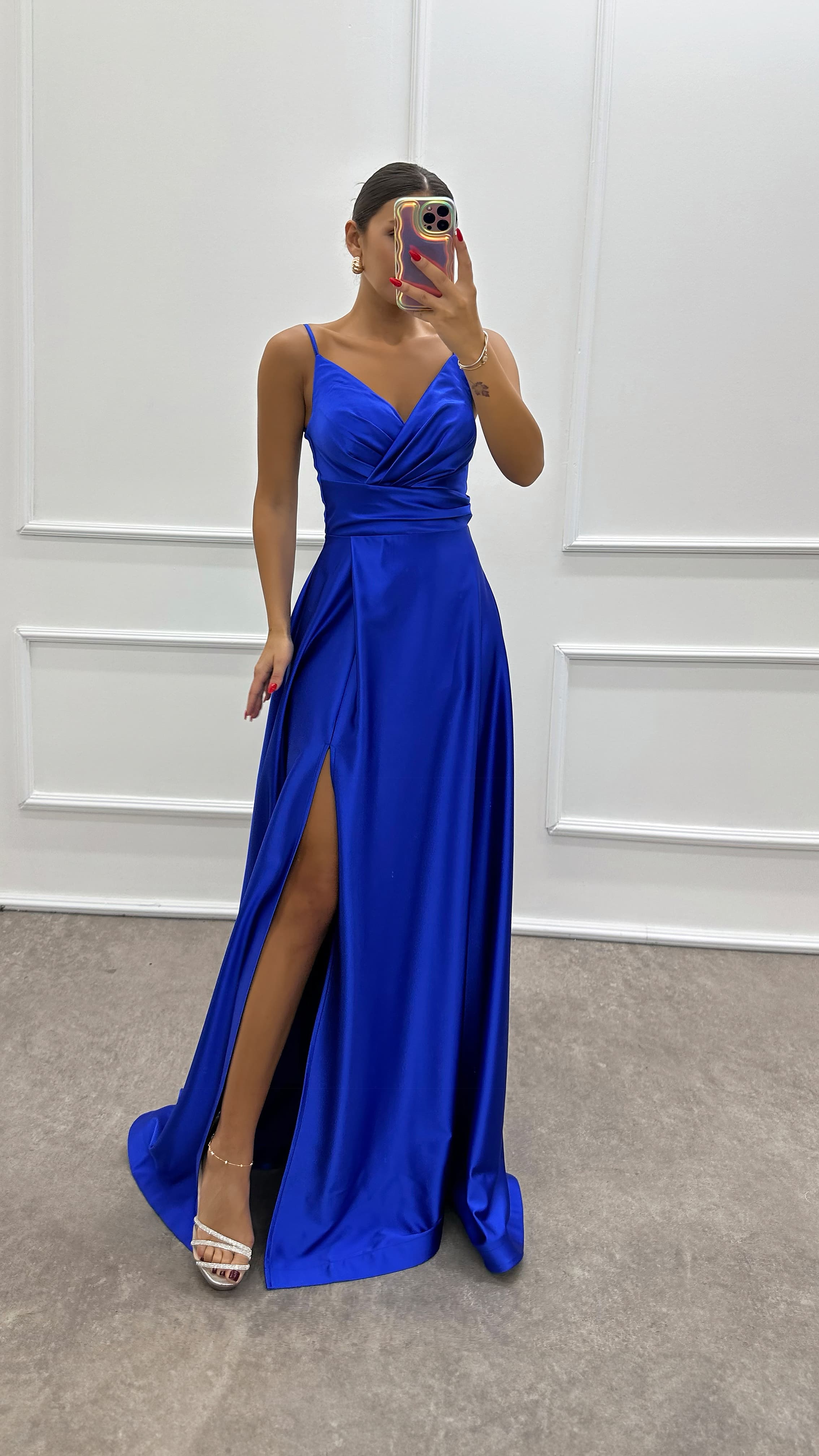 • Bebe Mavisi İp Askılı Tasarım Saten Abiye Elbise