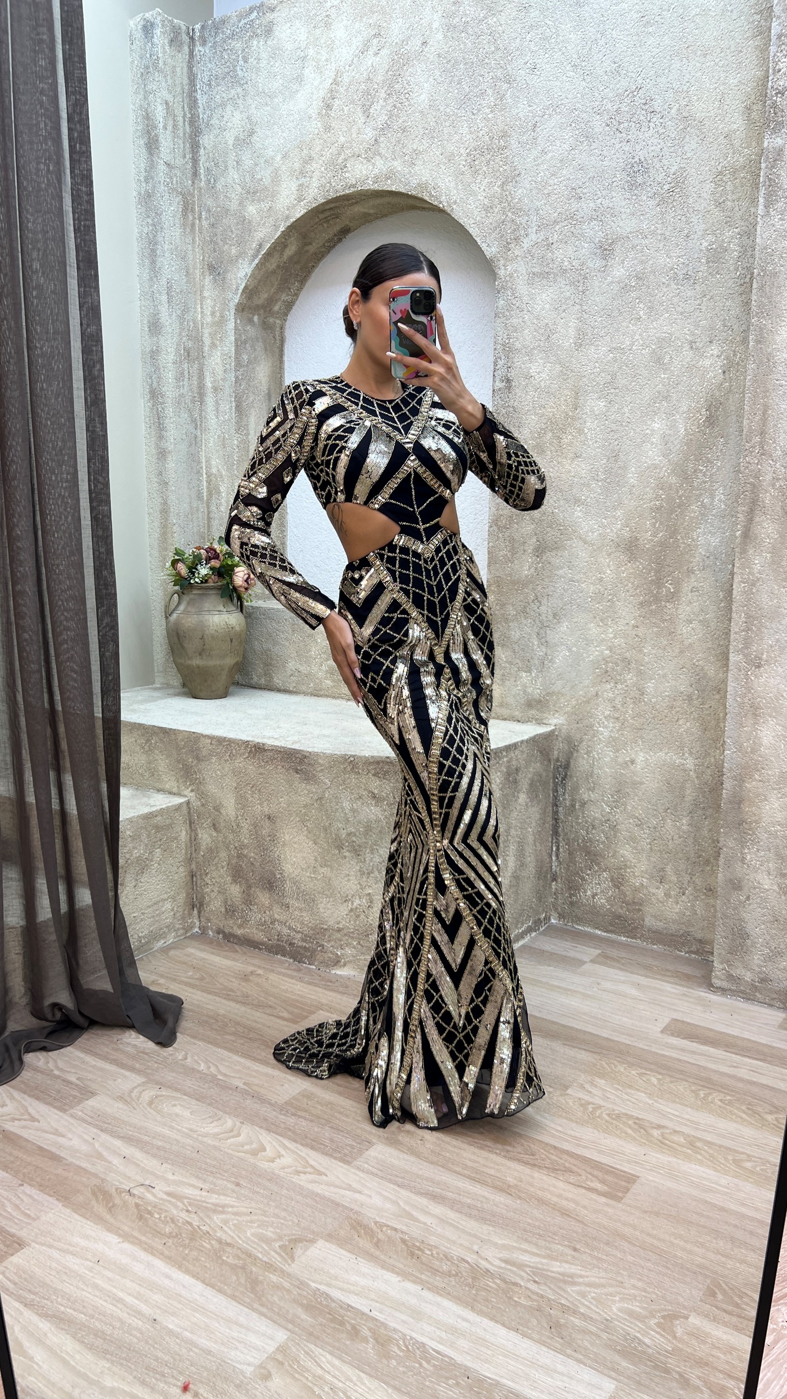 • Sarı Bel Detay Özel İşlemeli Tasarım Abiye Elbise