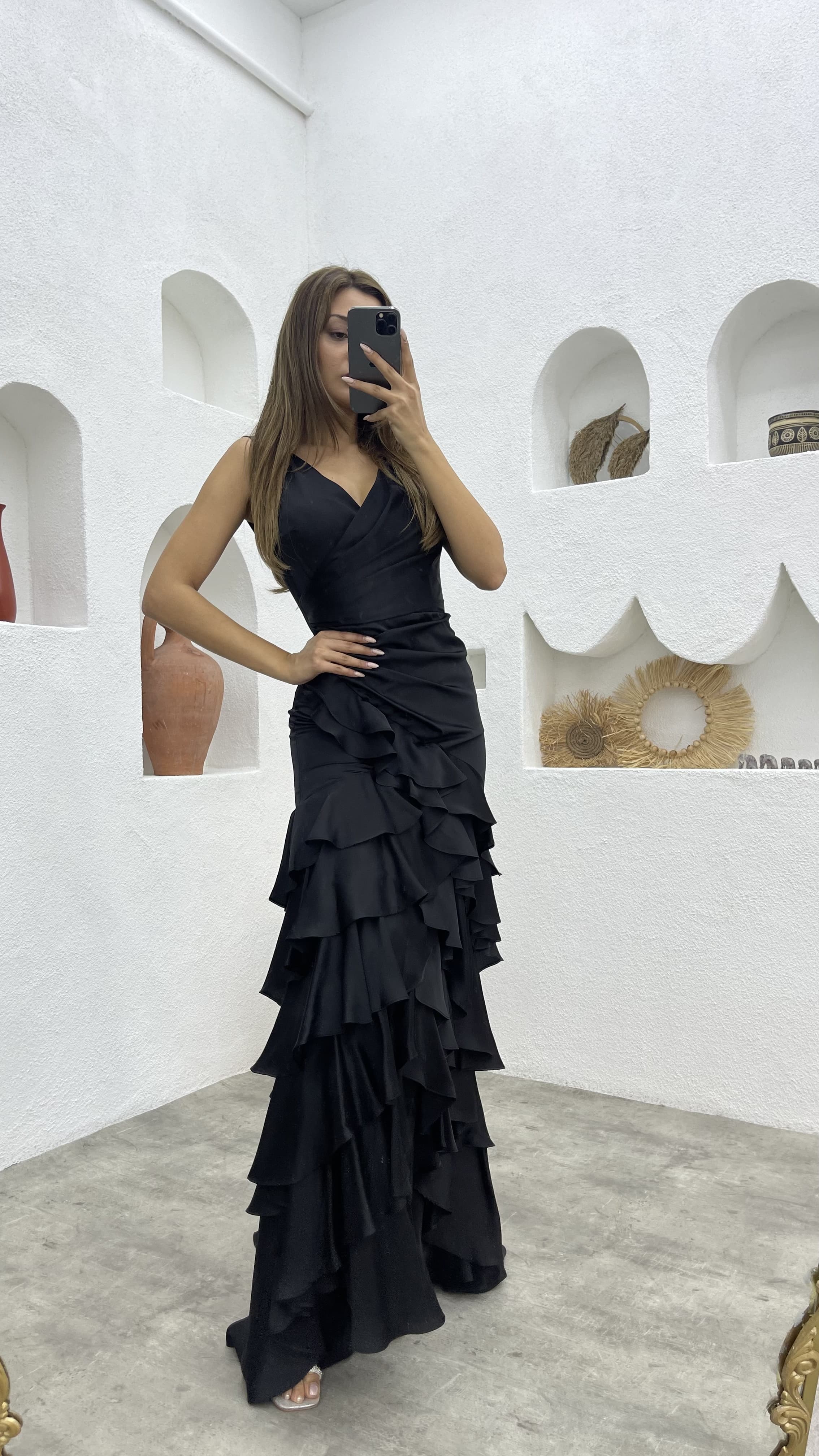 • Kırmızı Drapeli Volanlı Abiye Elbise