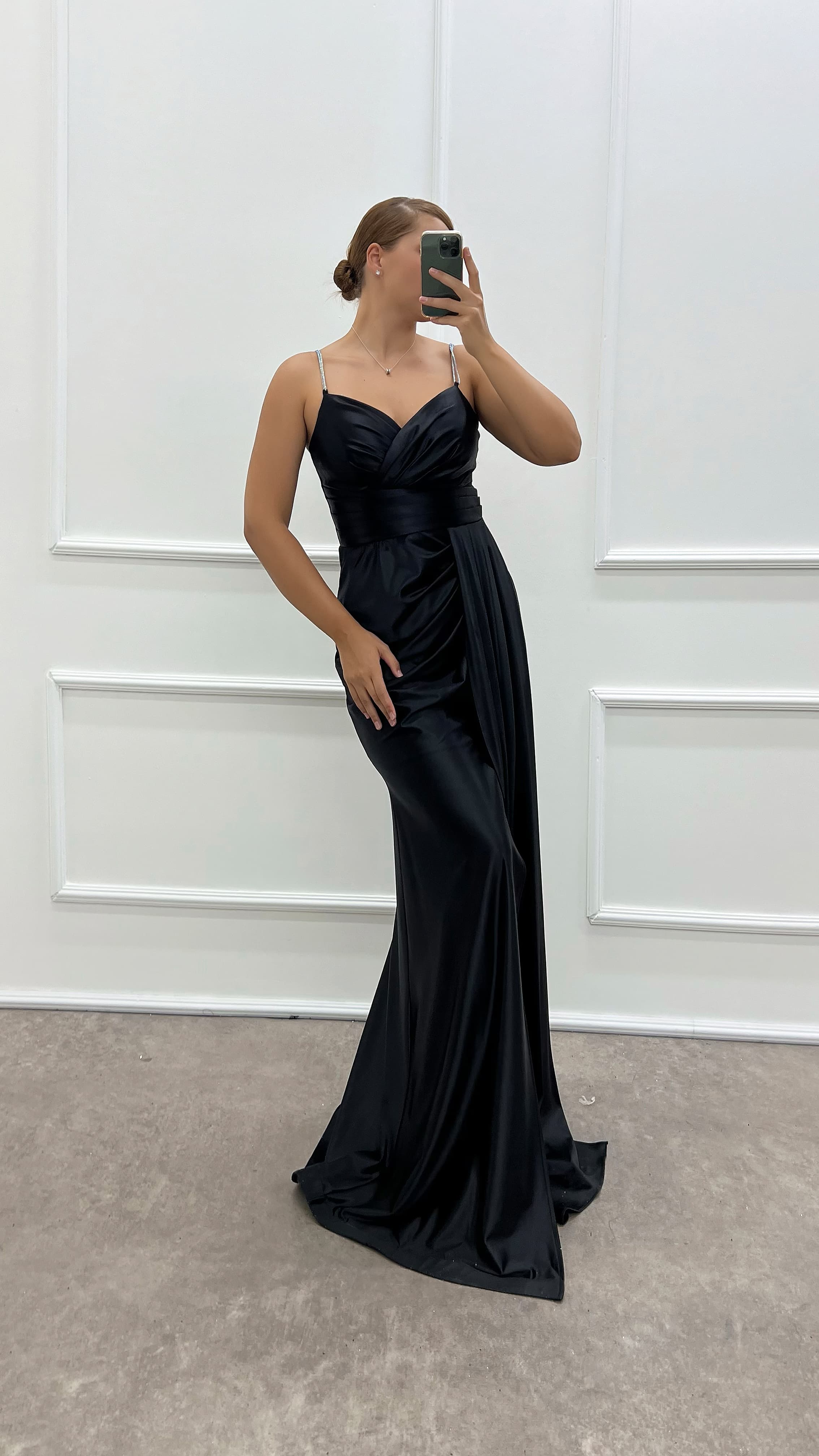 • Siyah Straplez Bel Detay Büyük Beden Tasarım Saten Abiye Elbise
