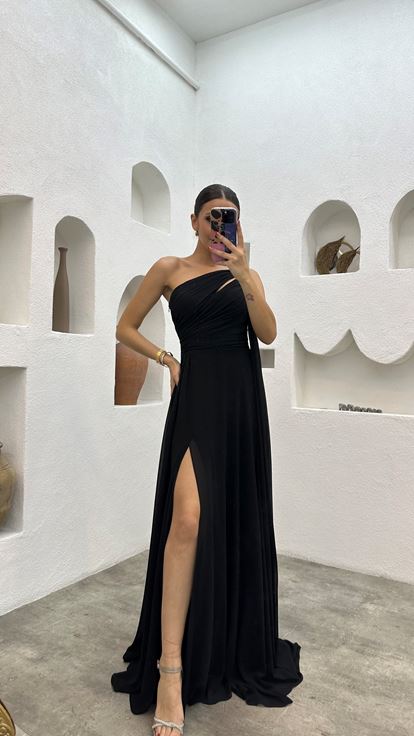 • Siyah Tek Omuz Taş İşlemeli Drapeli Tasarım Abiye Elbise