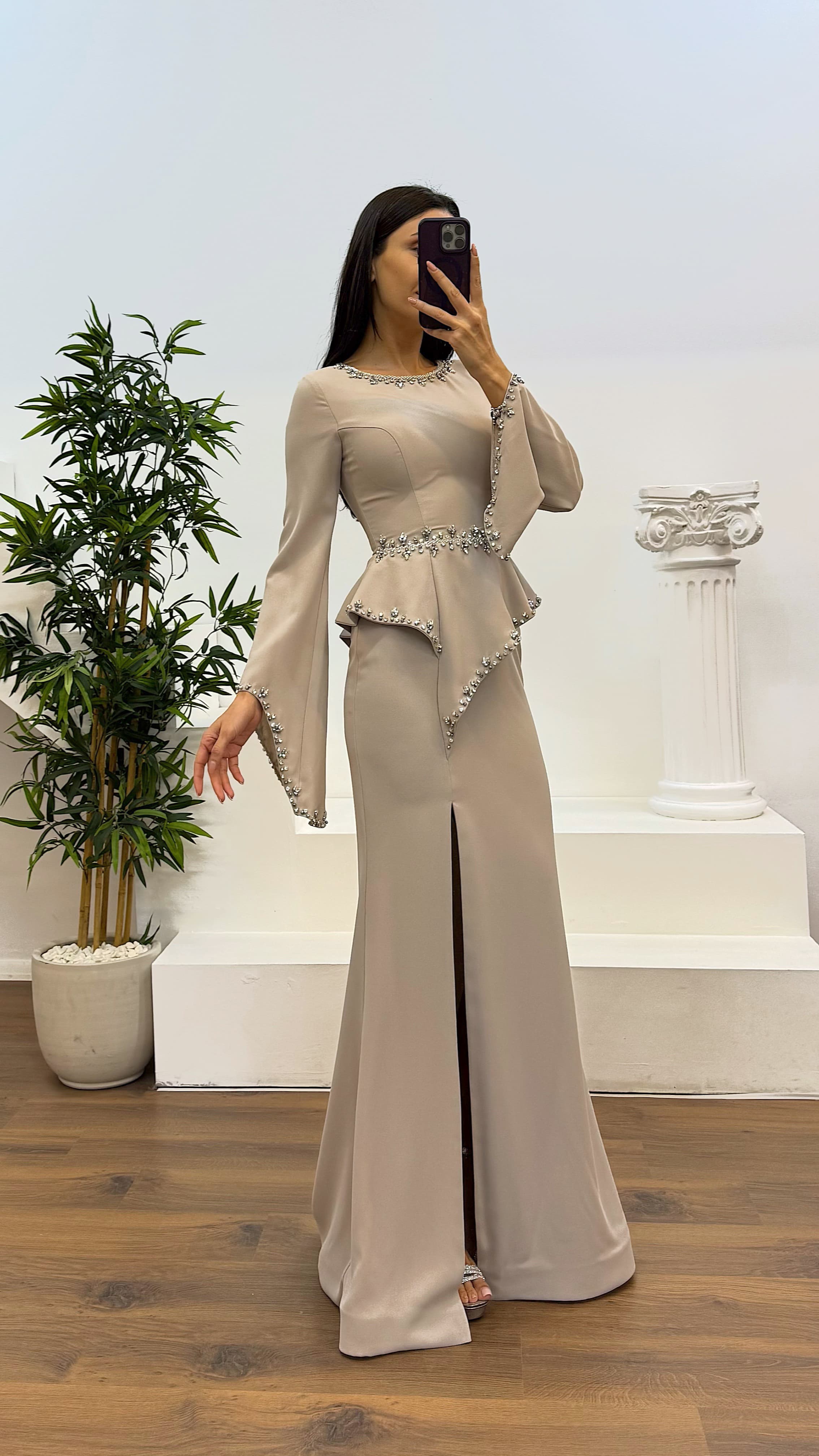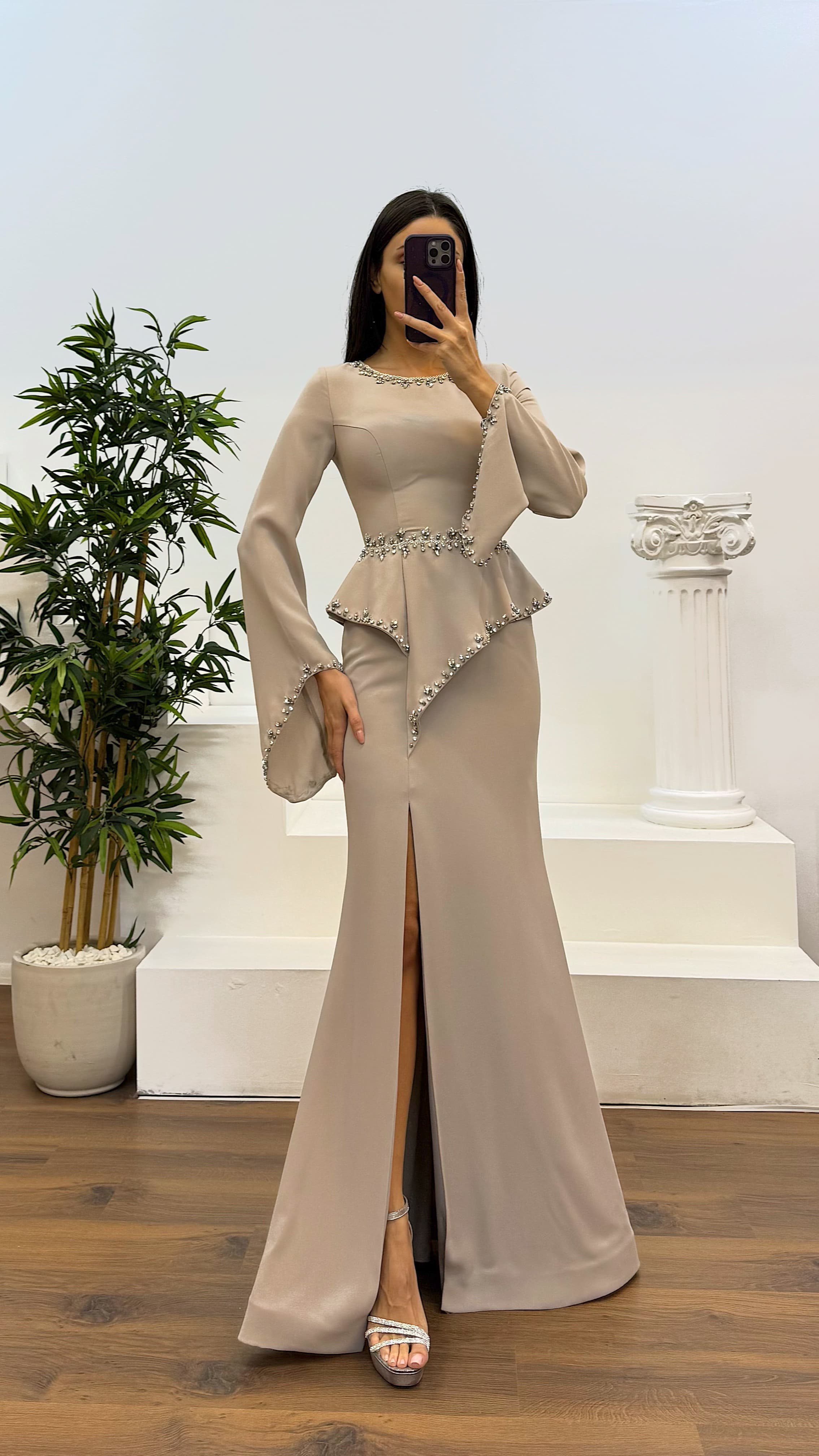 • Pudra Taş işlemeli Volanli Kol Detay Tasarım Elbise