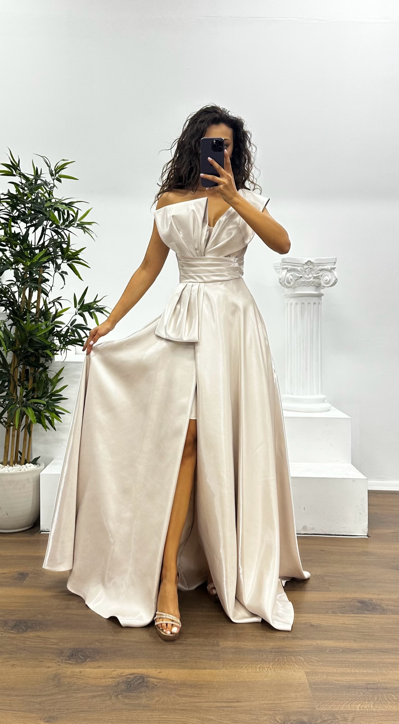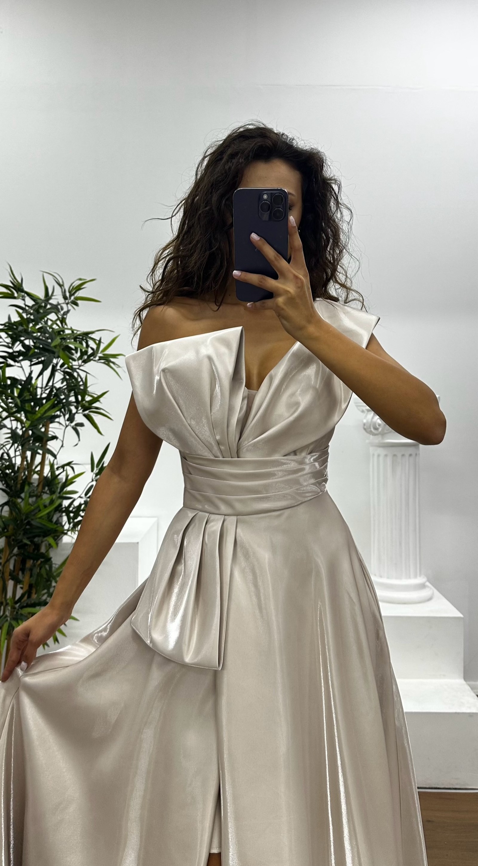 • Pudra Tek Omuz Kabarık Abiye Elbise