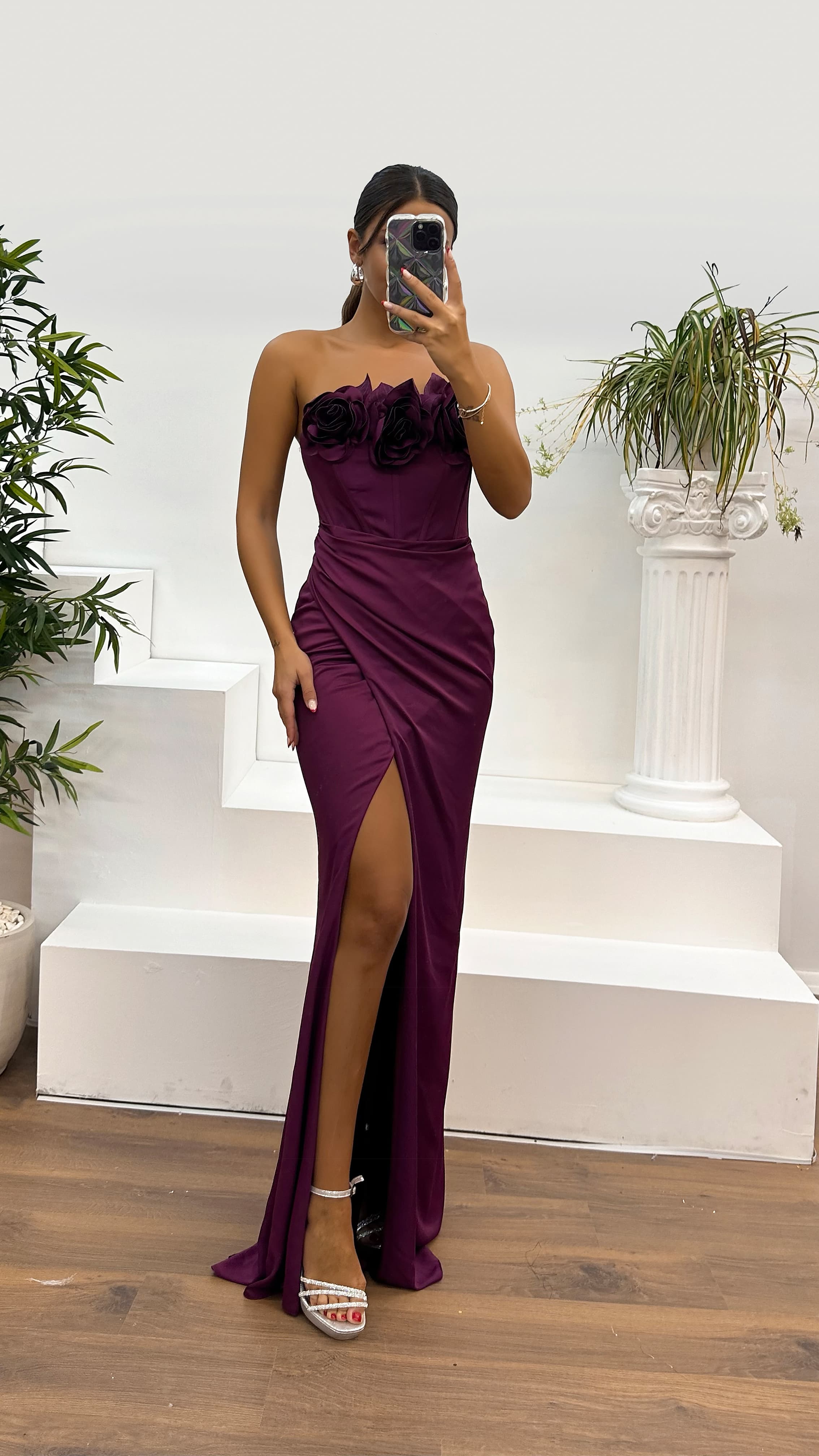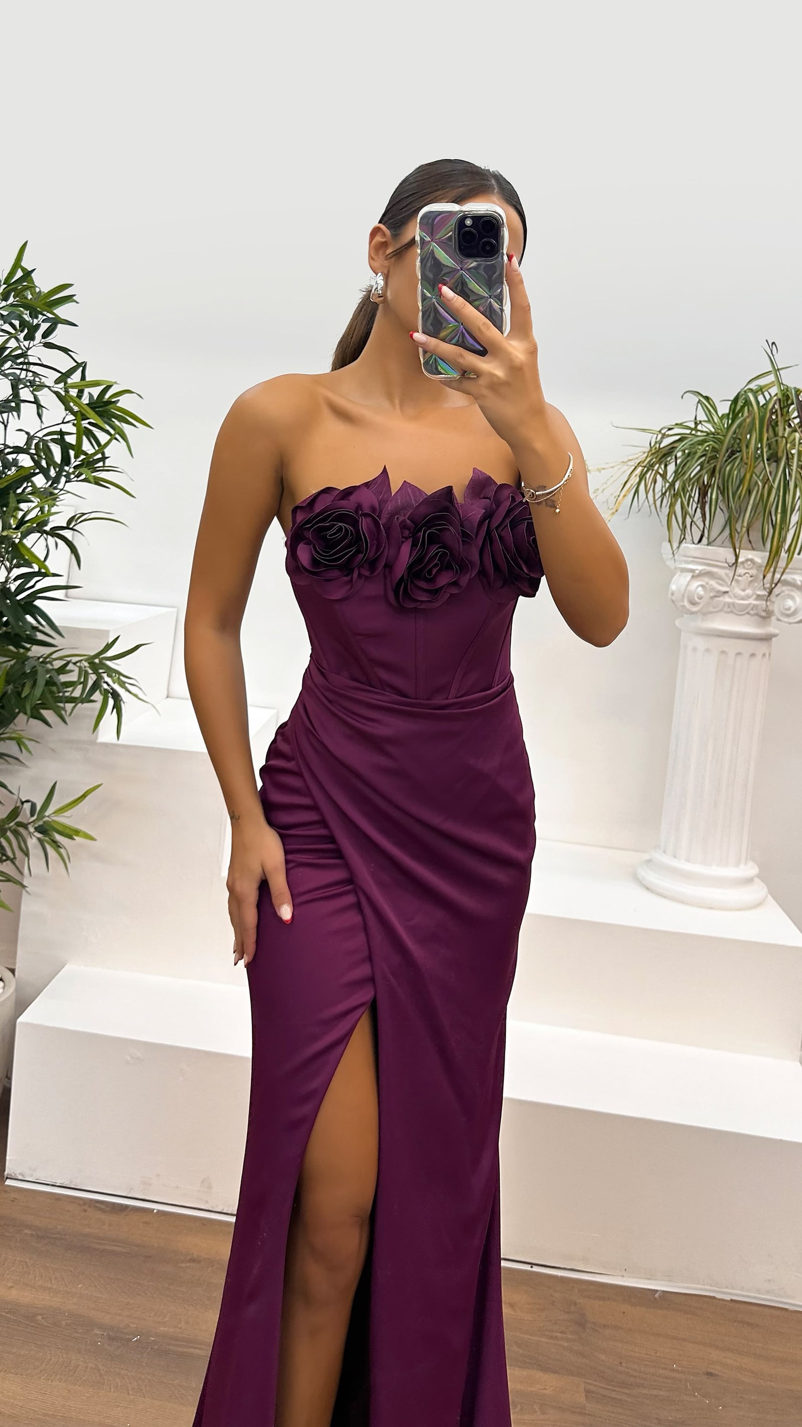 • Viyolet Straplez Gül Detay Abiye Elbise