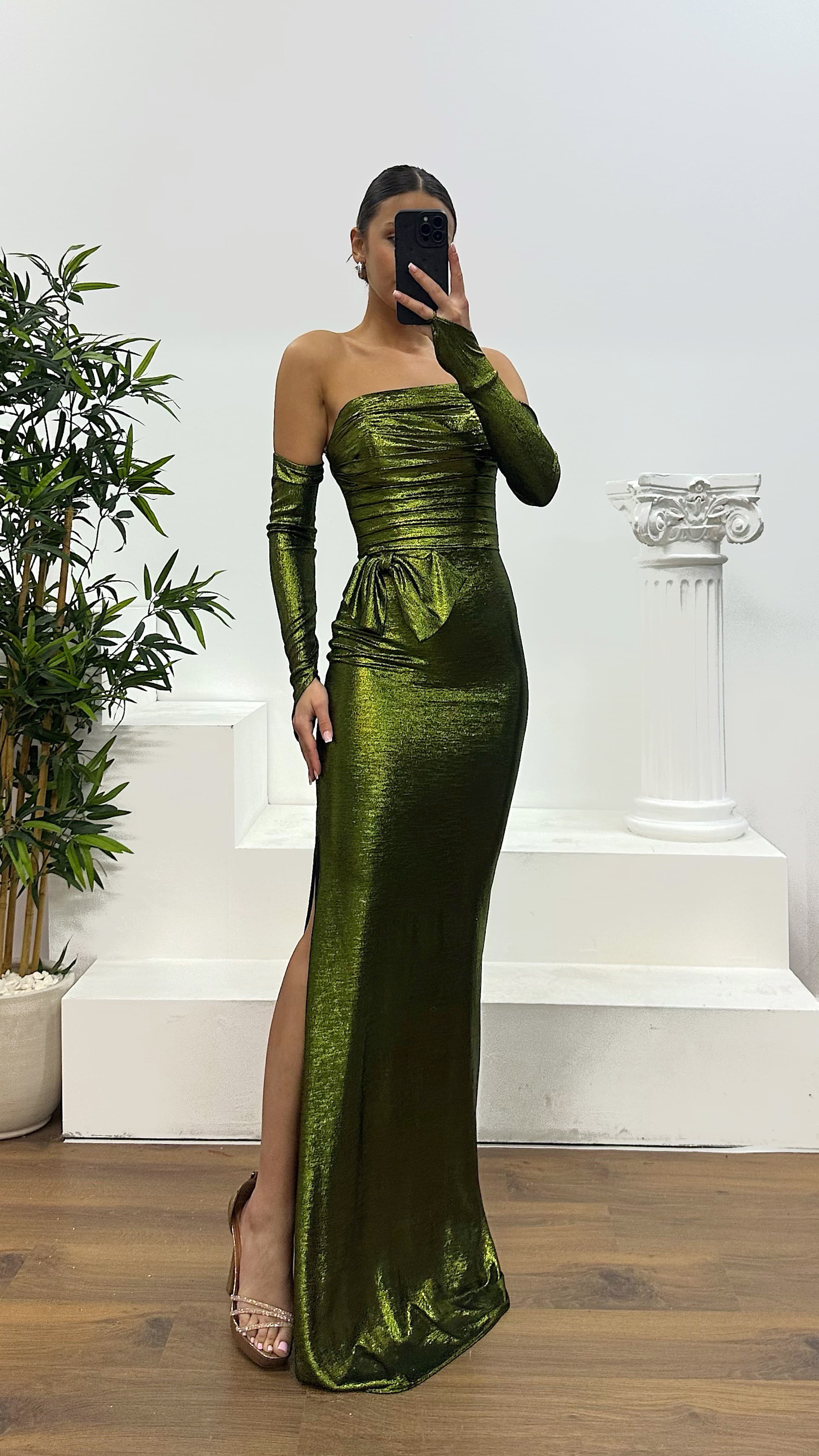 Robe de soirée sans bretelles avec détail nœud Convient aux tailles 36 à 44, avec coques intégrées, doublure complète, fermeture dos à lacets croisés et fermeture éclair. Avec fente latérale, gants et détail nœud. Longueur : Peut varier entre 170 et 175 cm. Type de tissu : Satin polyester, viscose.