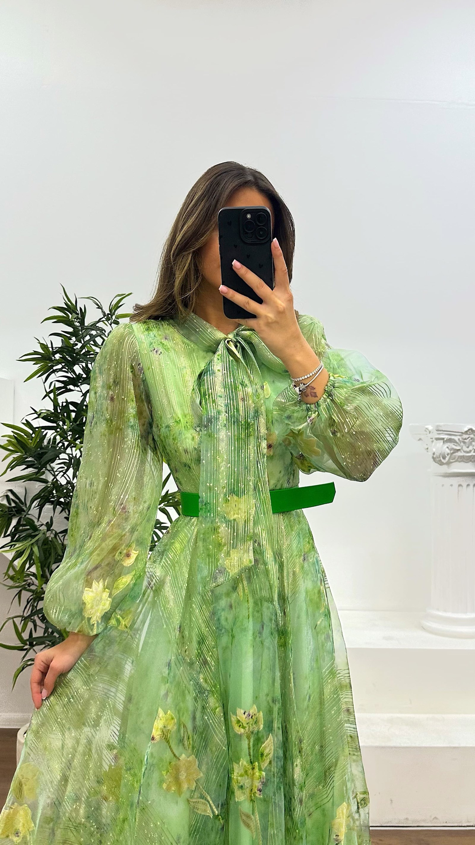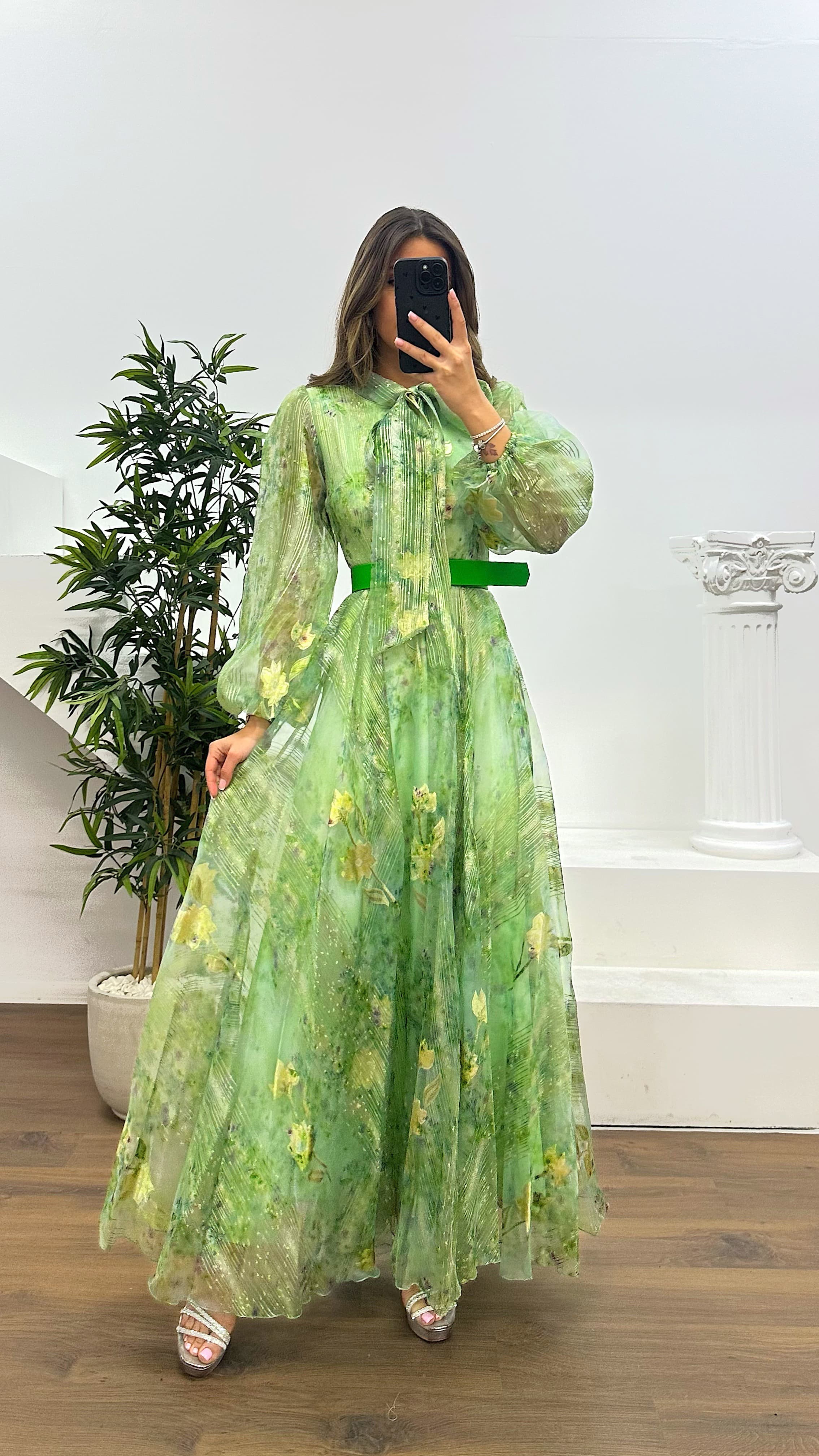 • Yeşil Çiçek Desenli Tül Abiye Elbise