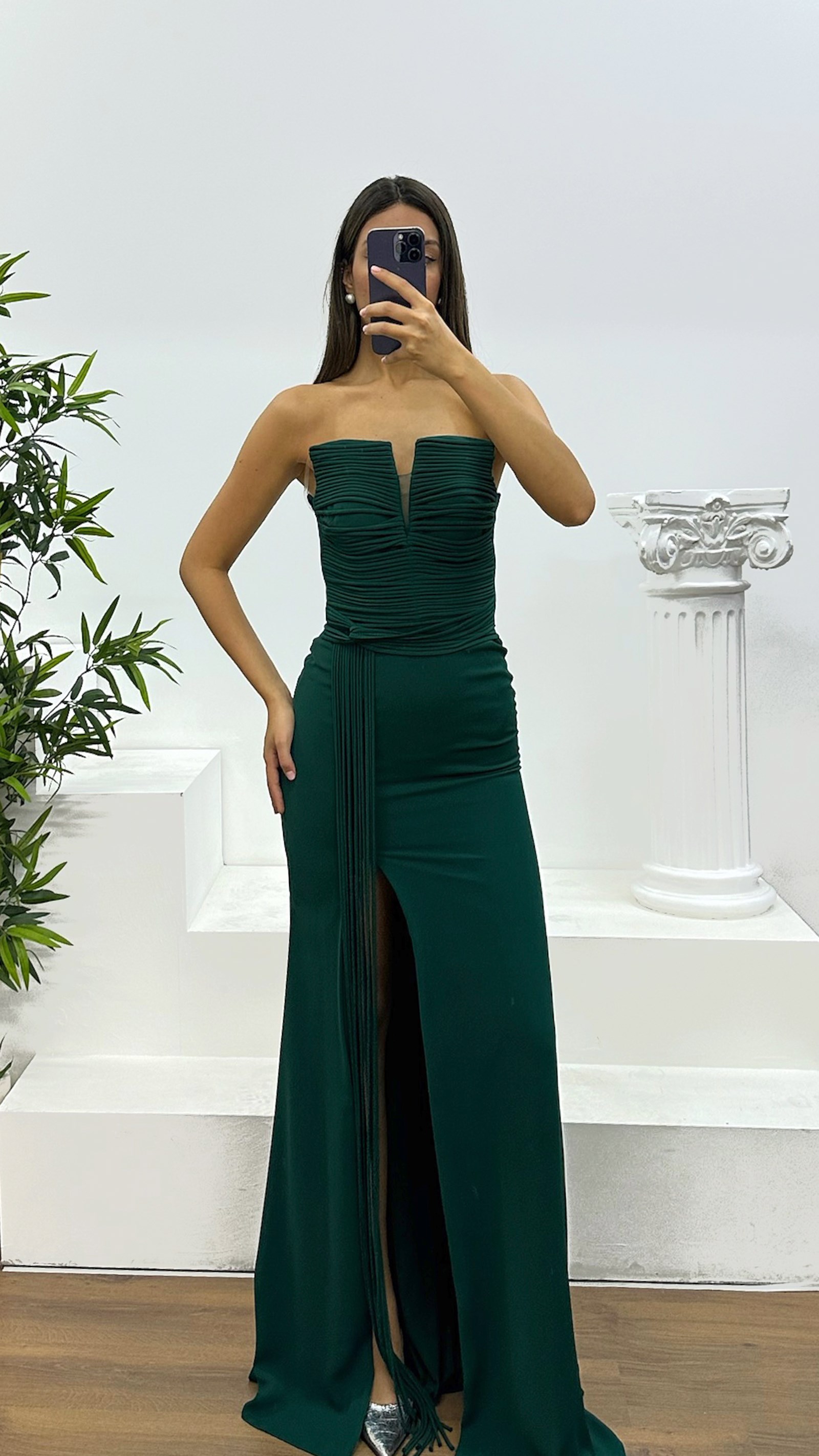 Robe de soirée sans bretelles avec détails à franges Le produit est conçu comme une robe de soirée avec détails à franges, adaptée aux tailles 36 à 44, avec bonnets intégrés, doublure, dos à lacets croisés et fermeture éclair. Longueur du produit : Peut varier entre 170 et 175 cm. Type de tissu : Atlas, 100 % polyester.