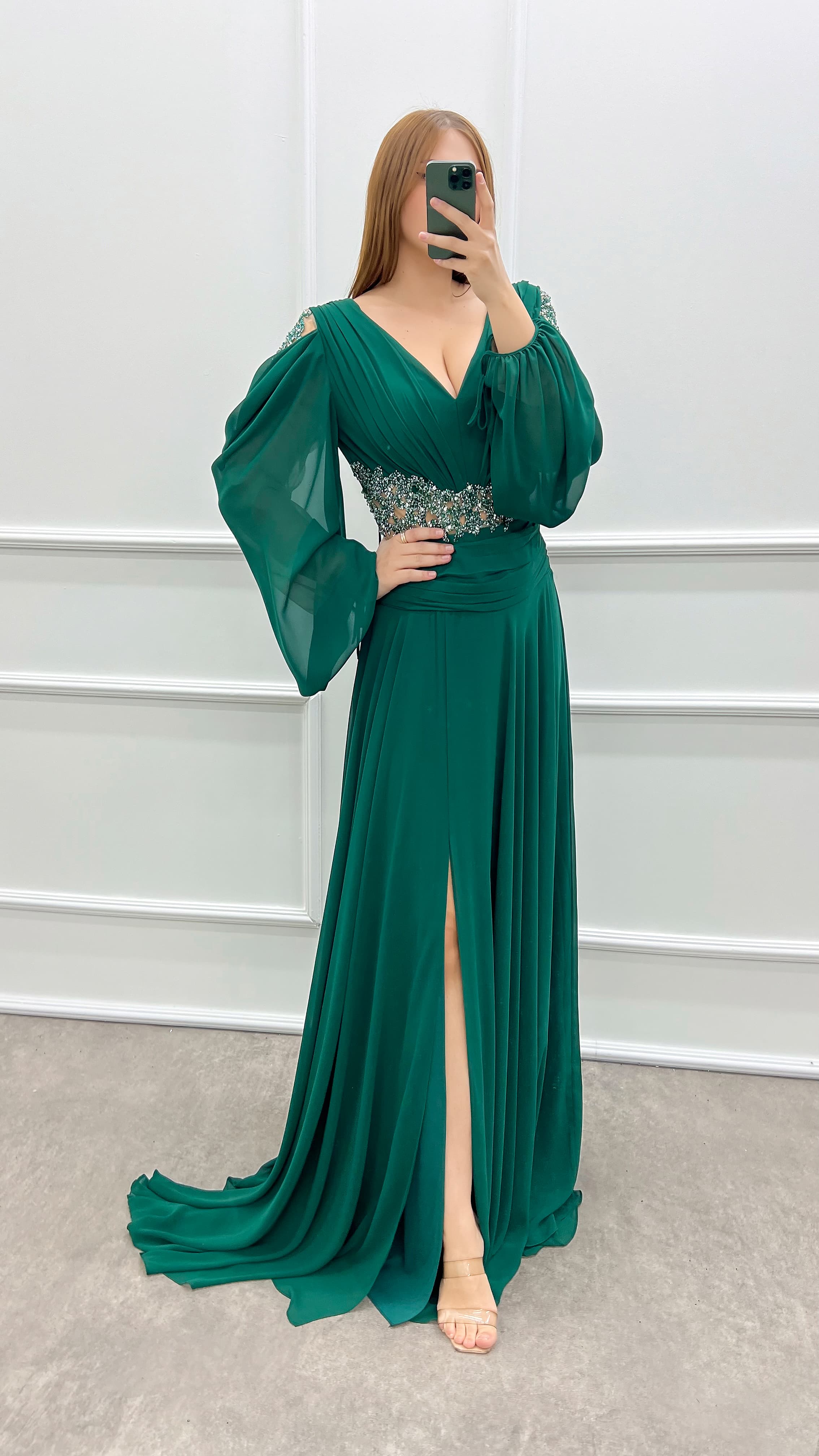 • Zümrüt Yeşili V Yaka Kolları Ve Beli Taşlı Şifon Büyük Beden Elbise