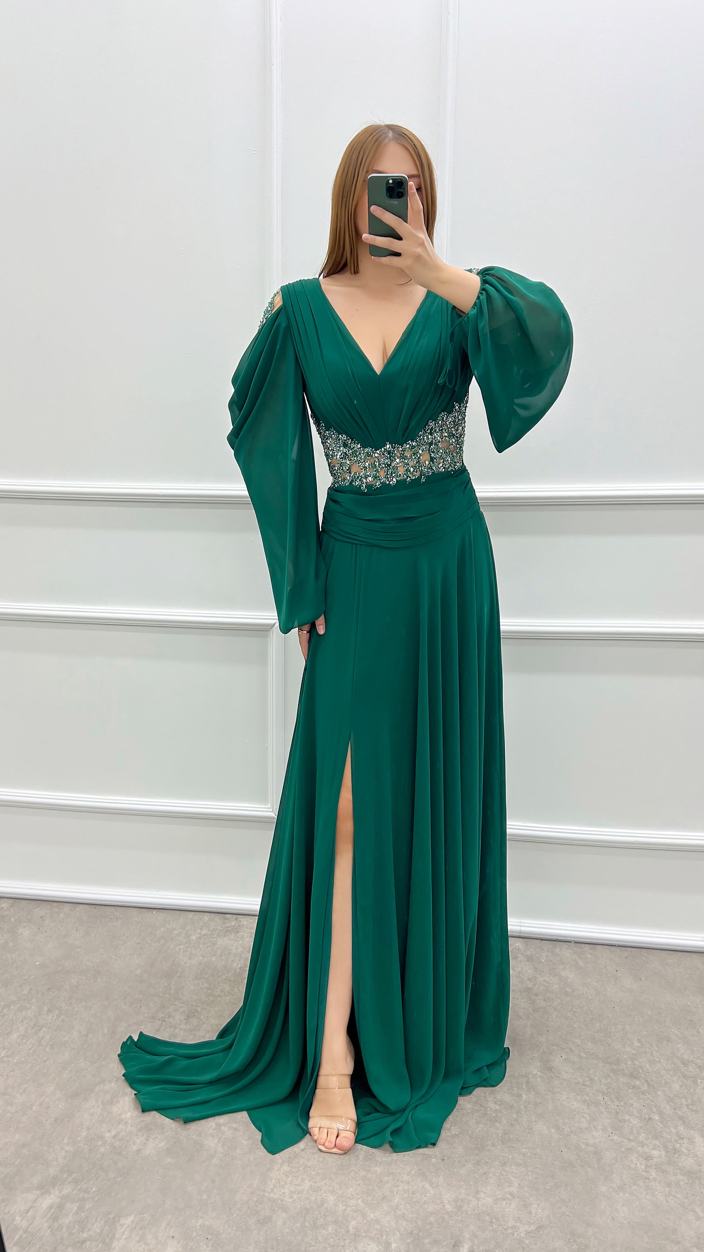 • Robe grande taille en mousseline de soie avec manches à col en V vert émeraude et pierre à la taille
