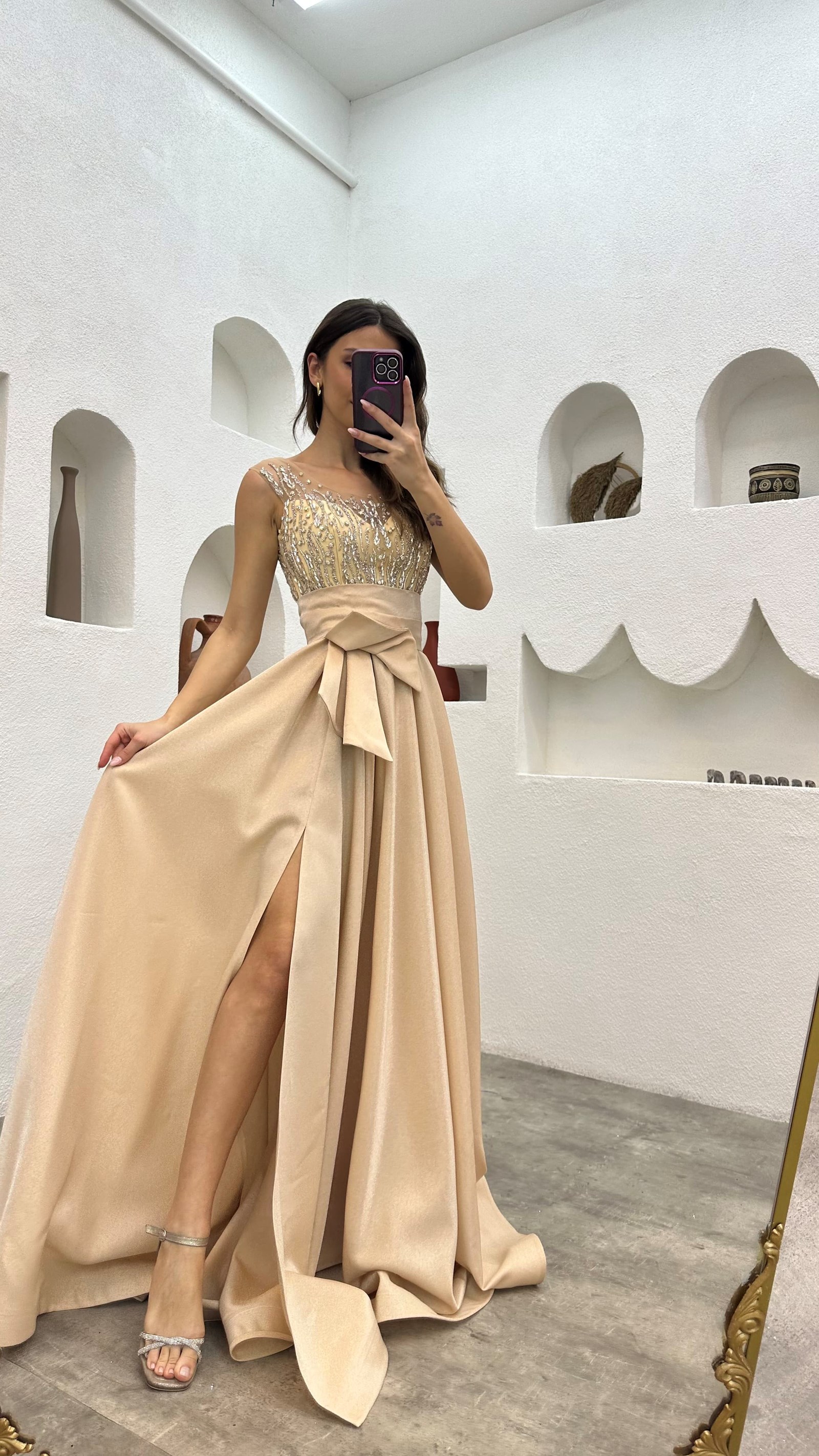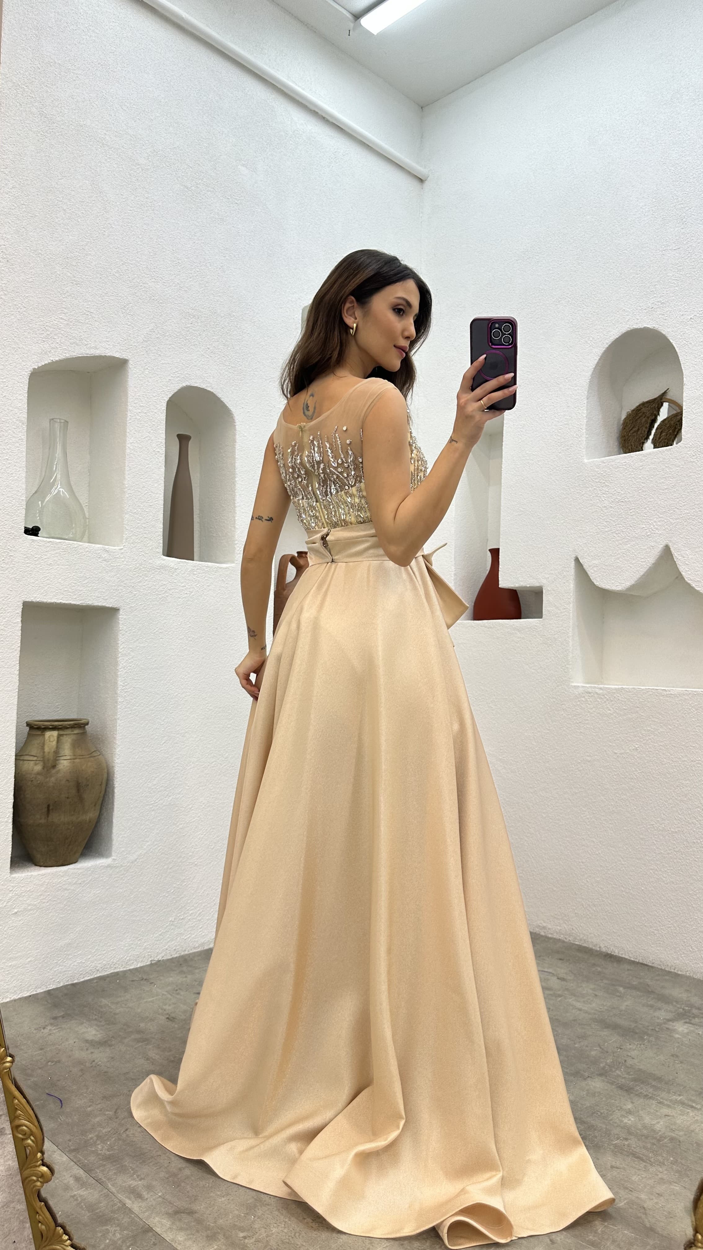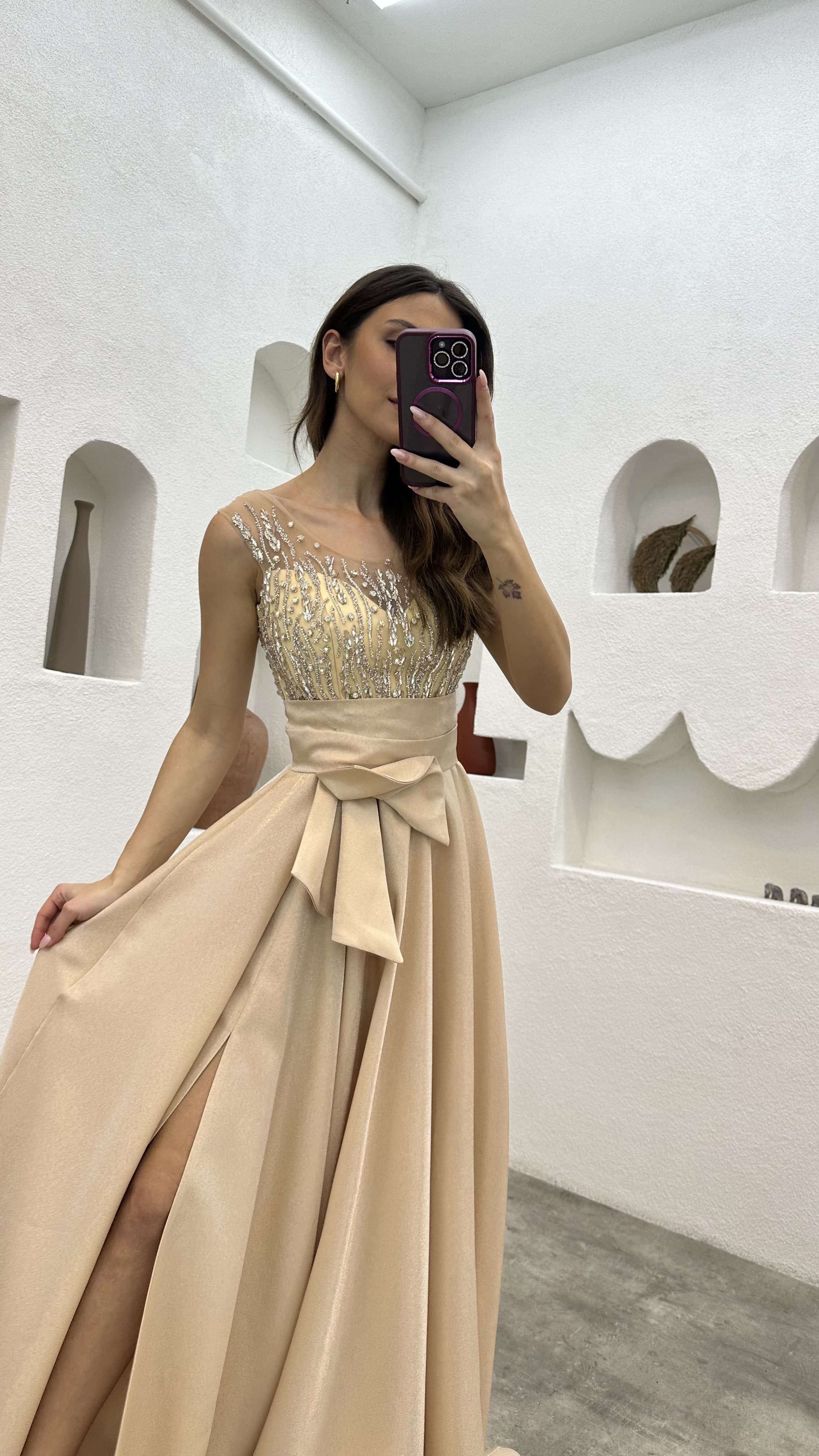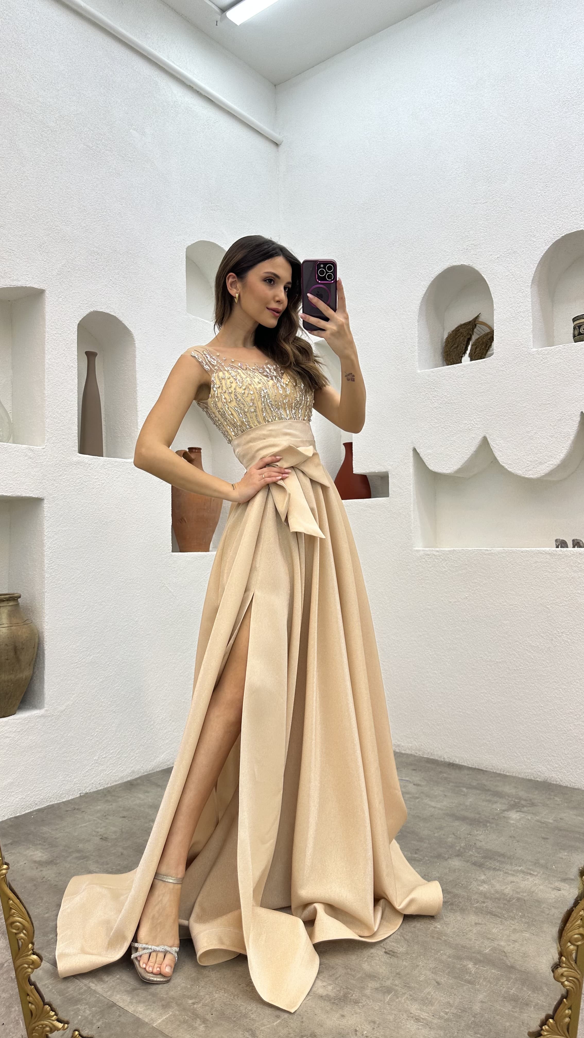 Bej Üzeri İşlemeli Kuşaklı Saten Abiye Elbise