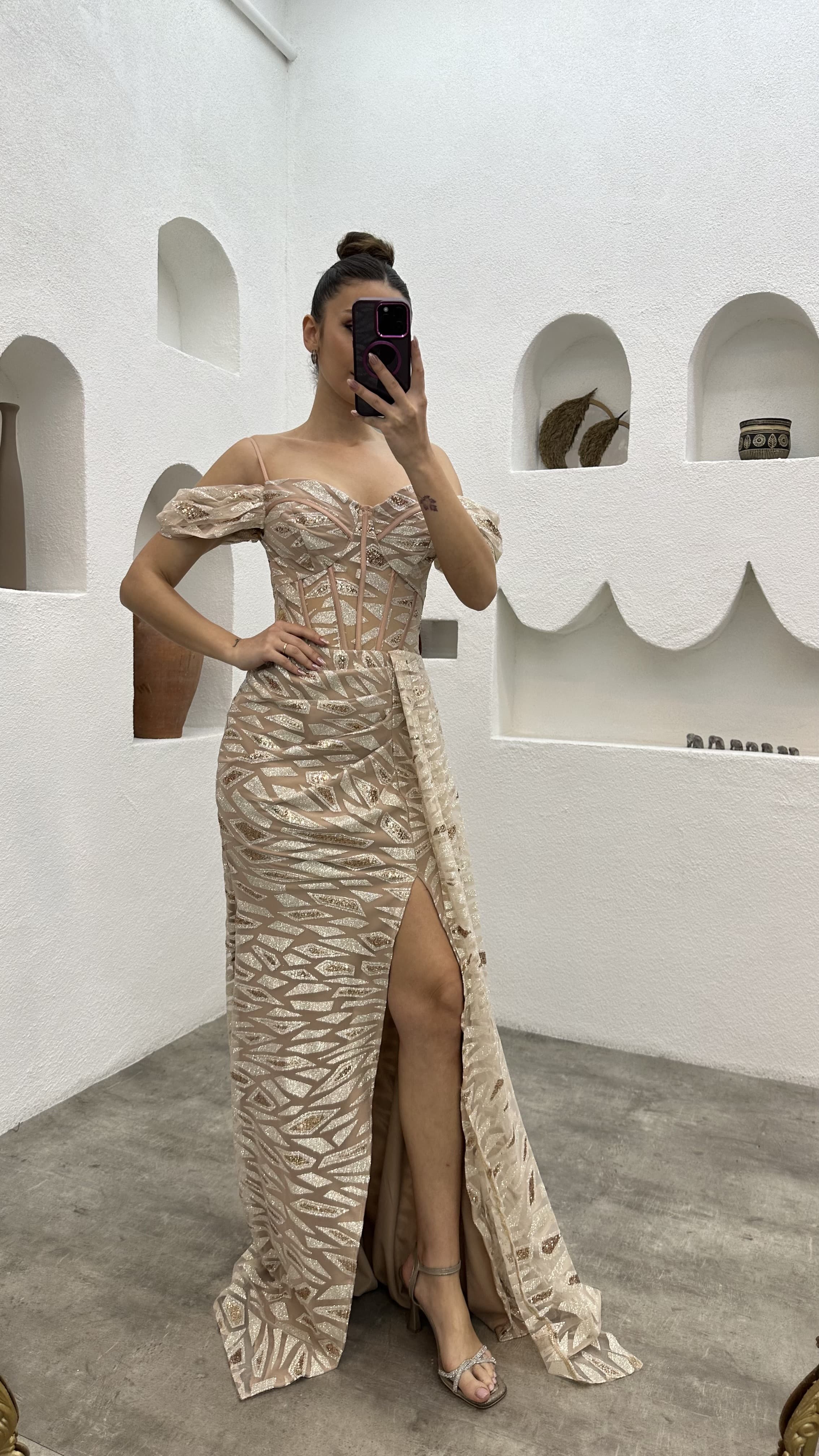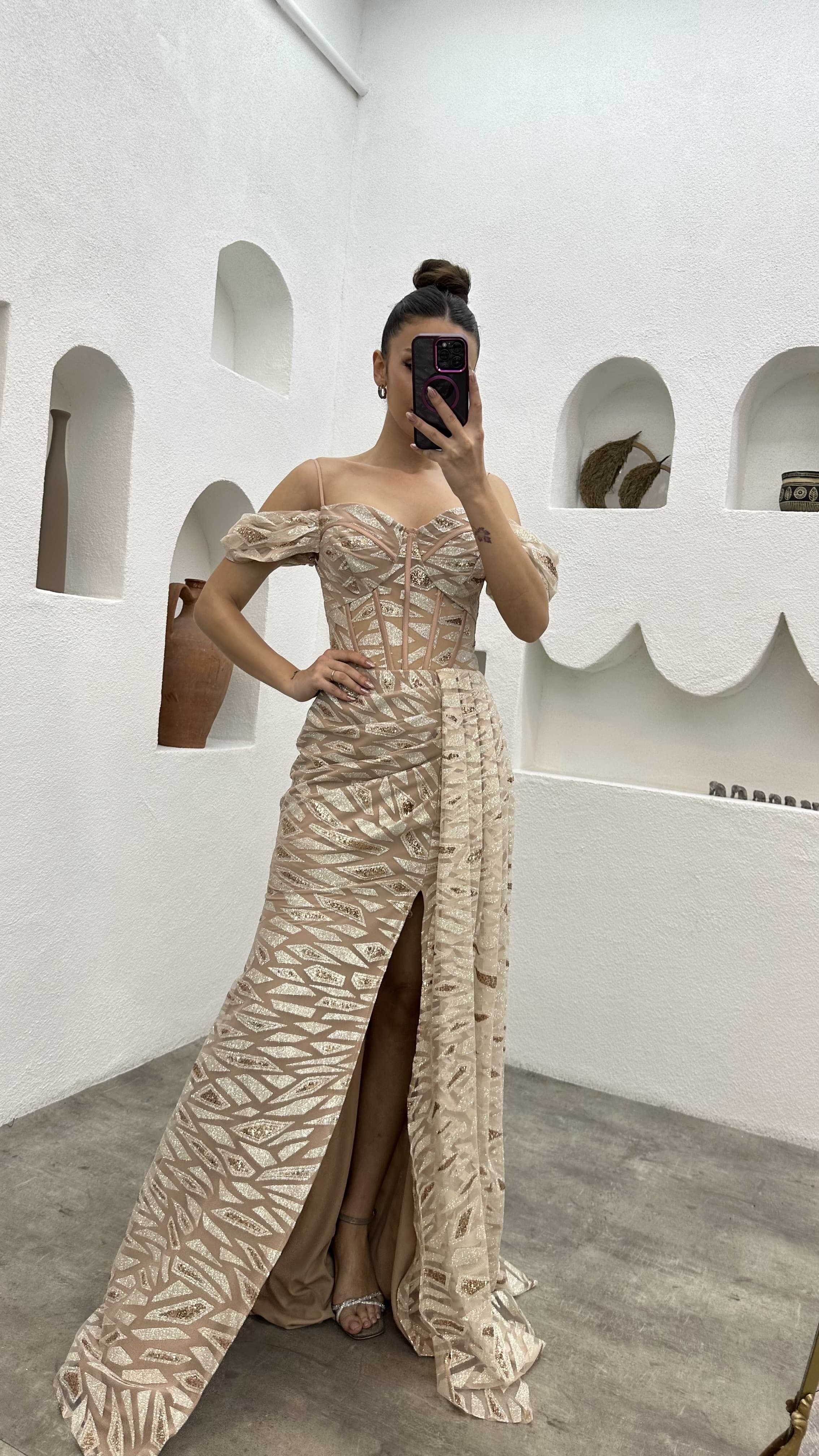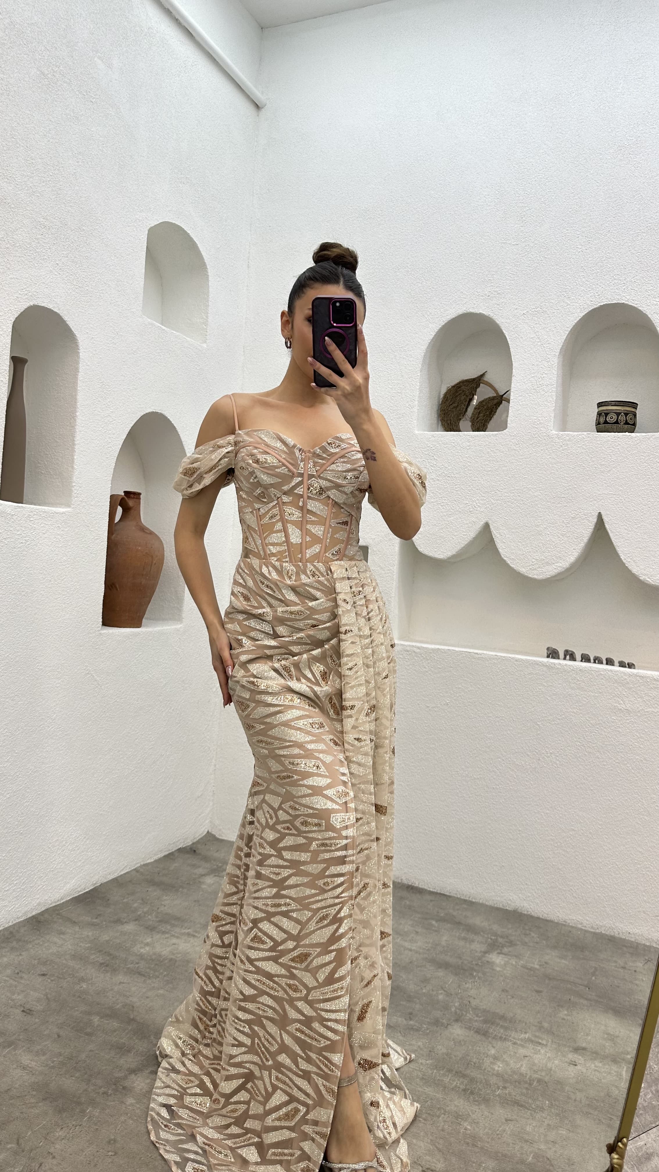 Bej İp Askılı Pul İşlemeli Abiye Elbise