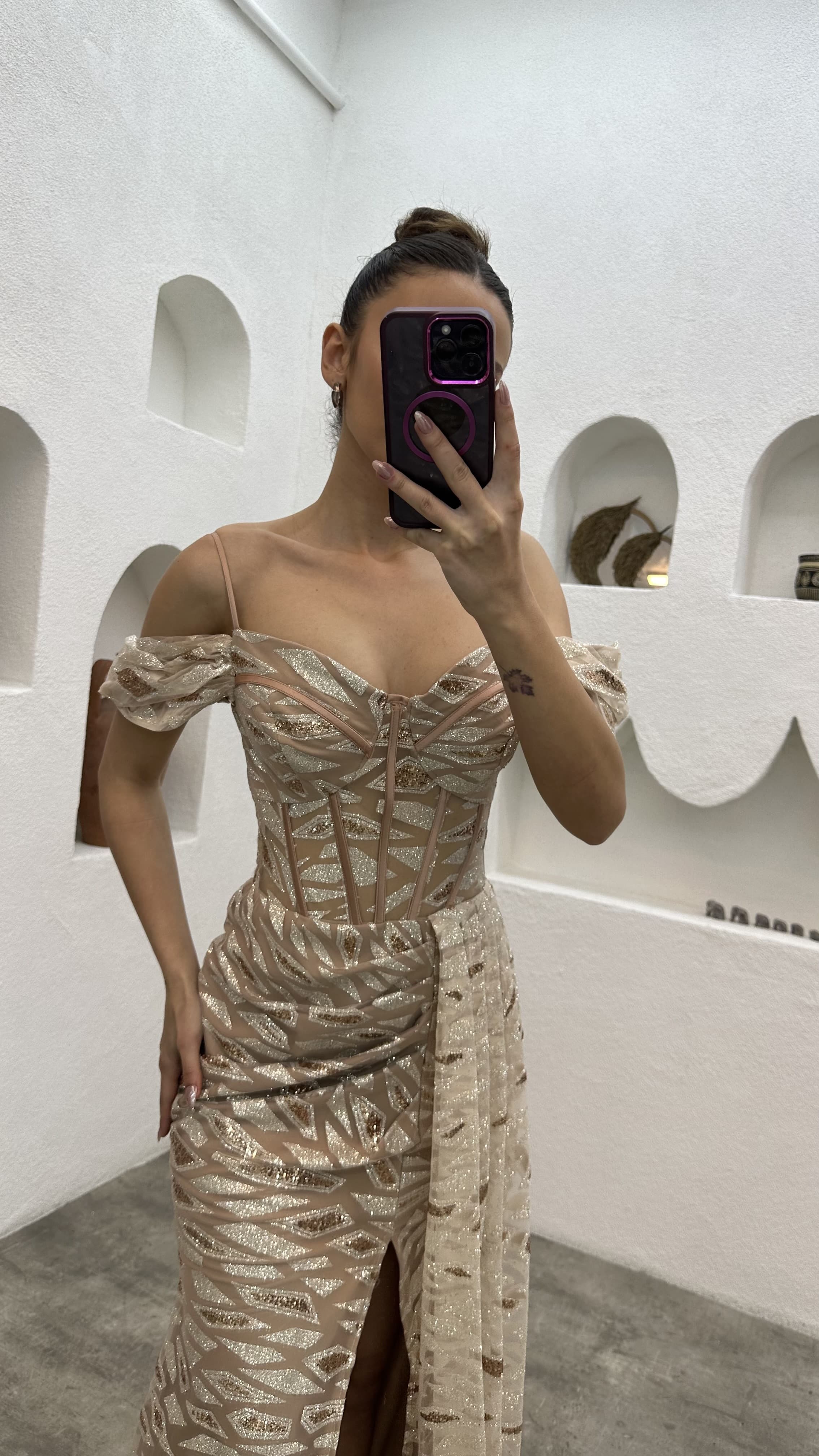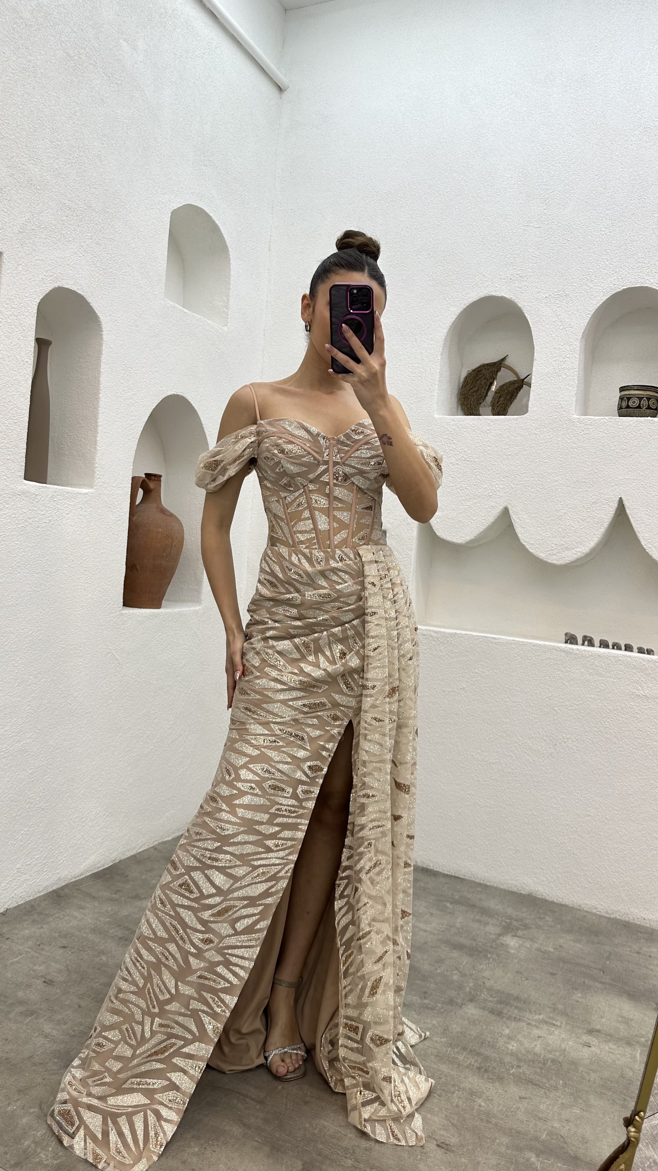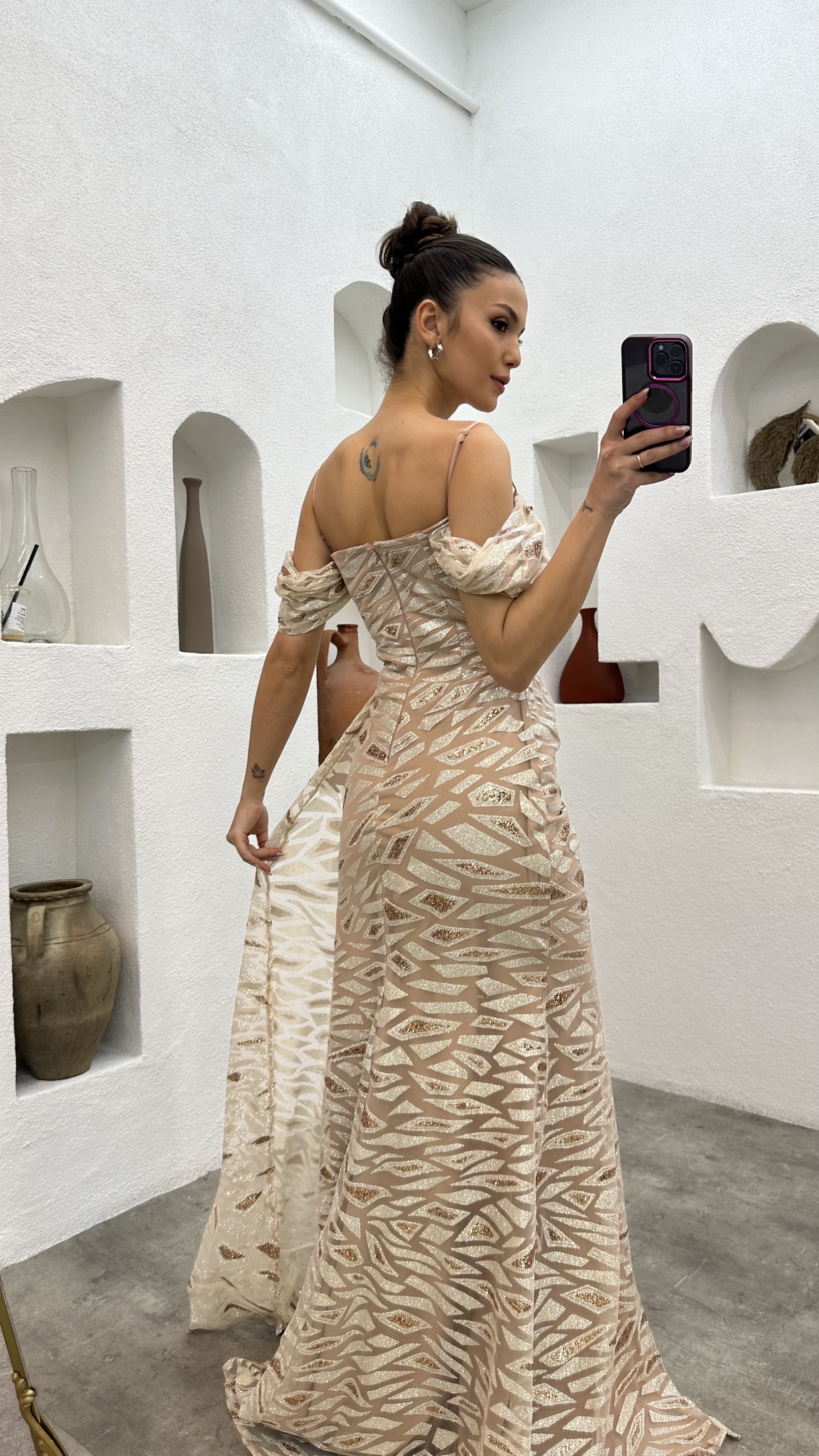 Bej İp Askılı Pul İşlemeli Abiye Elbise