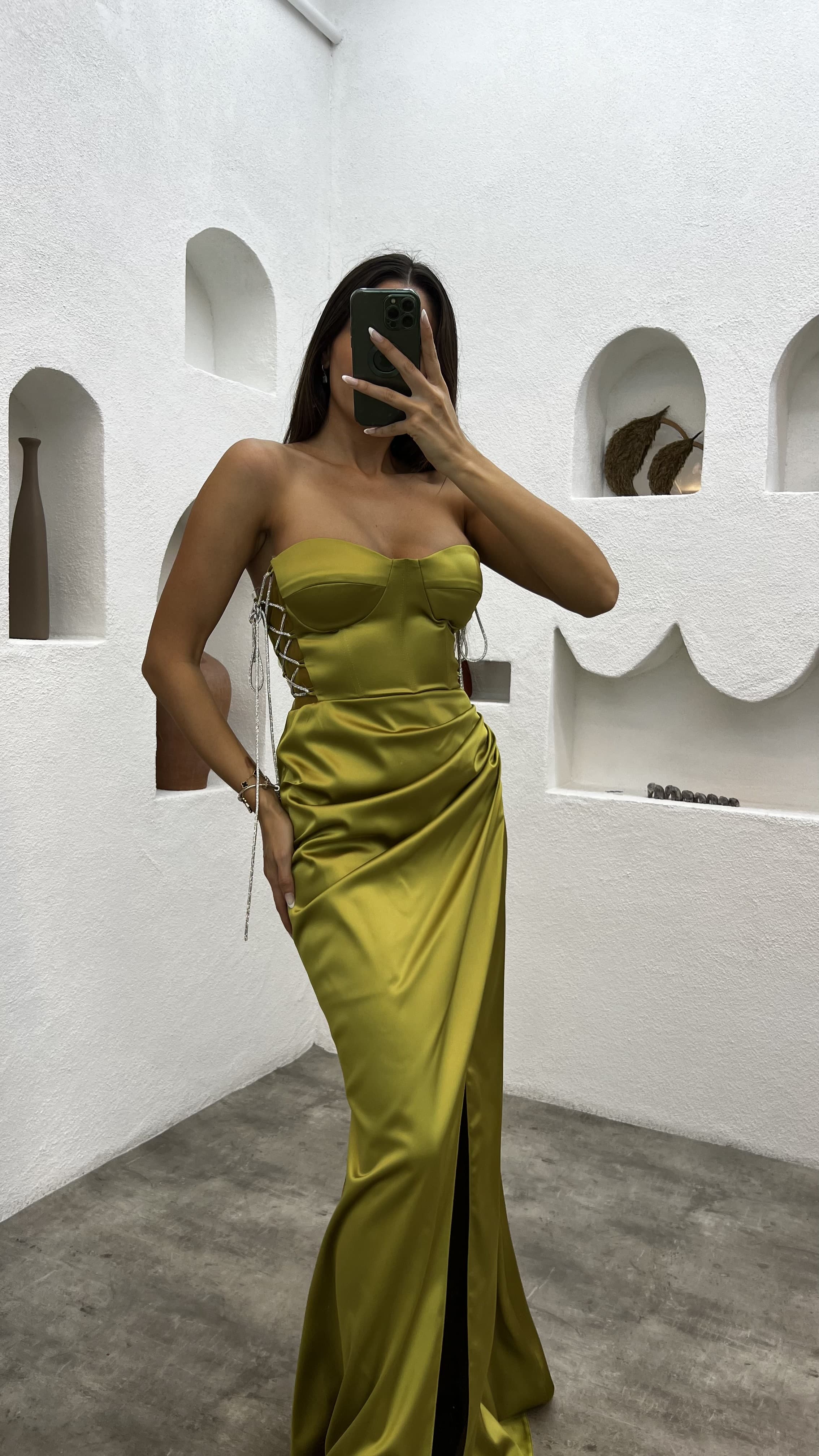 • Haki Straplez Drapeli Saten Abiye Elbise